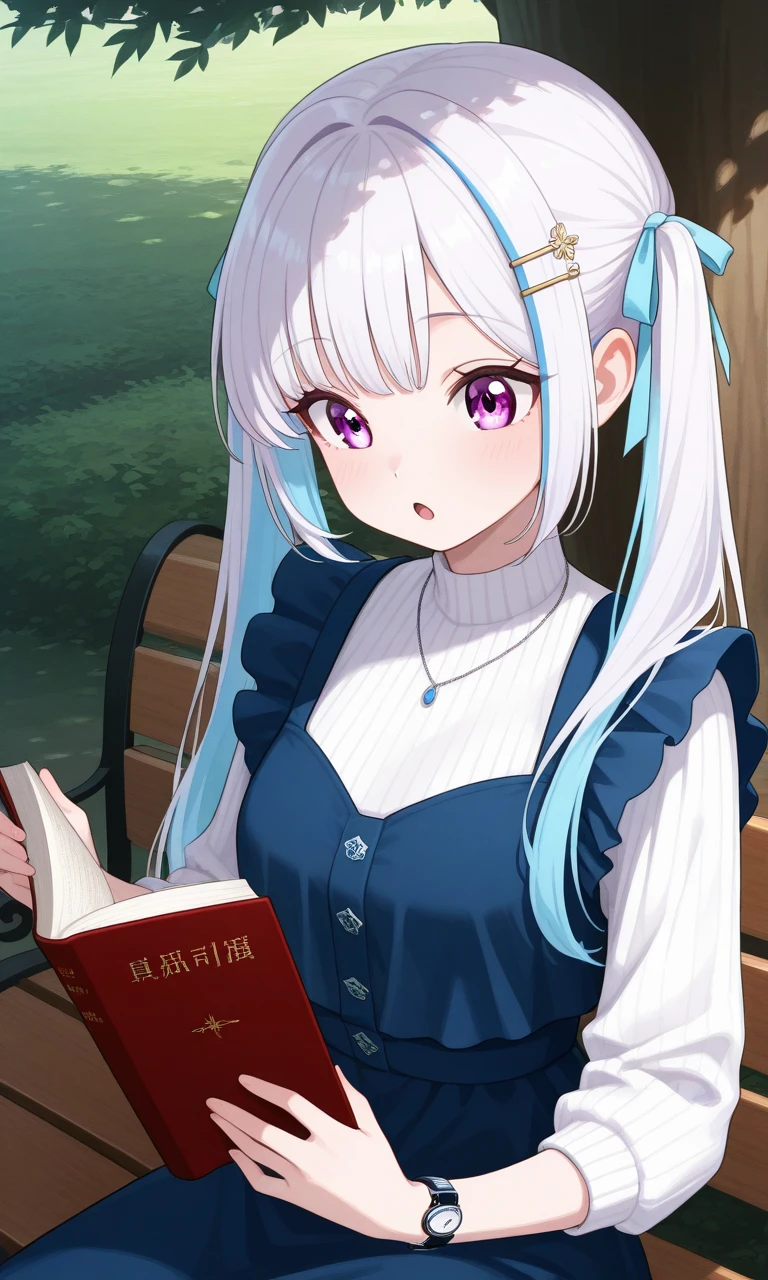 lize11th, long hair, twintails, hair ribbon, hairclip, necklace, black sweater, blue dress, pinafore dress, wristwatch, black pantyhose