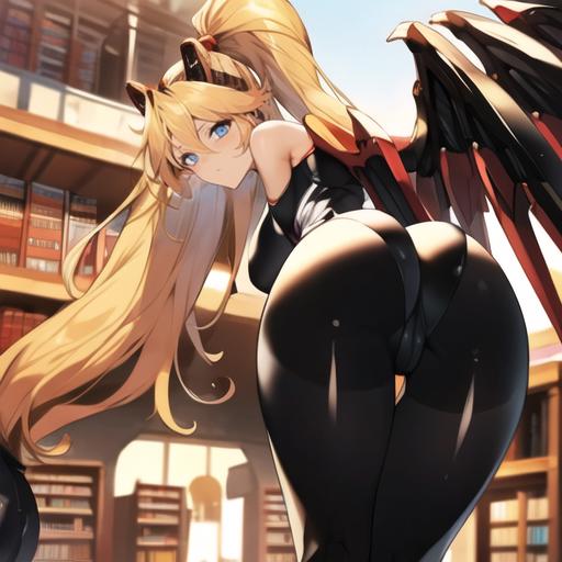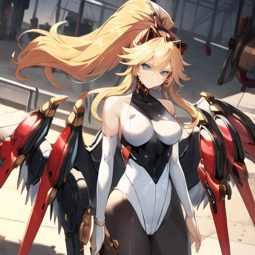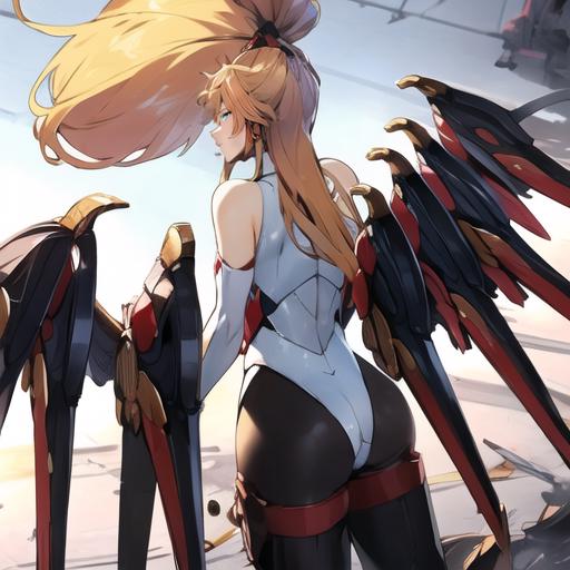 1. 1girl, AG Milvus, blond hair, blue eyes, large breasts, very long hair, high ponytail, pantyhose, stockings, side locks, bare shoulders, wings, head gear, mechanical wings, bodysuit,