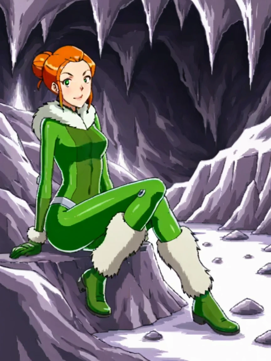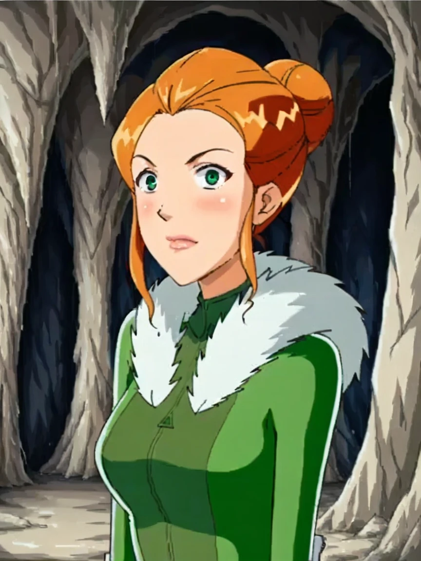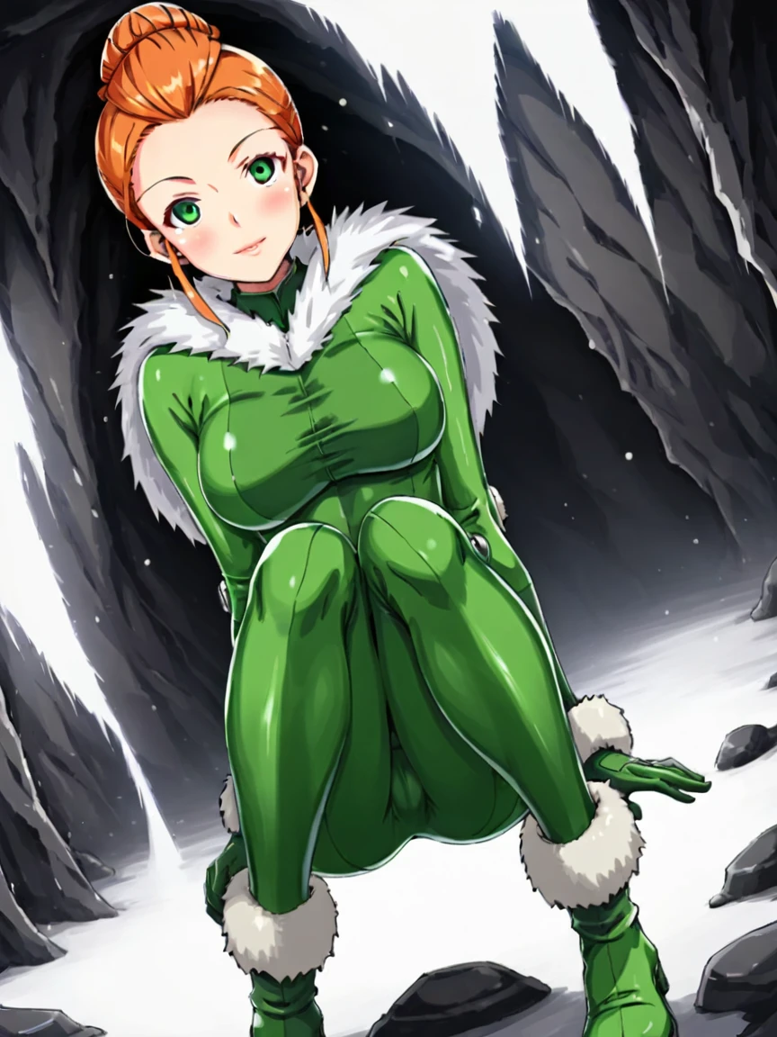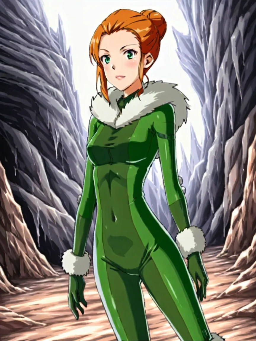 green eyes, orange hair, single hair bun, fur trim, green bodysuit,