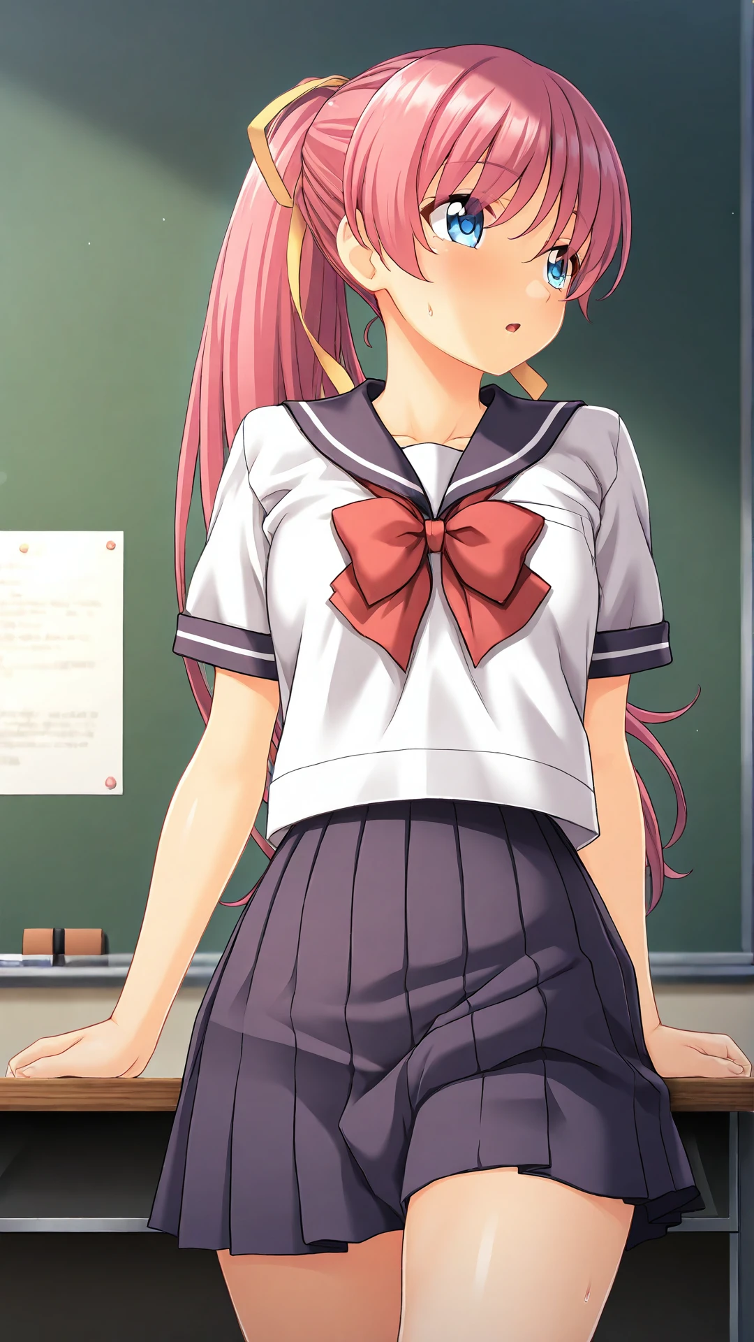 Ayasaki Tabane, 1girl, solo, pink hair, long hair, ponytail, blue eyes, ribbon, hair ribbon, school uniform, serafuku, short sleeves, pleated skirt, skirt, bow, bowtie