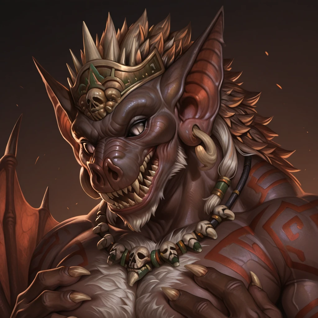 Tags: bat, furry male, monster, jewelry, aztec theme, sharp teeth, bone earrings, arm wings, black sclera, decorated loincloth, green bracelet, red tattoo, white hair, necklace, white eyes, crown