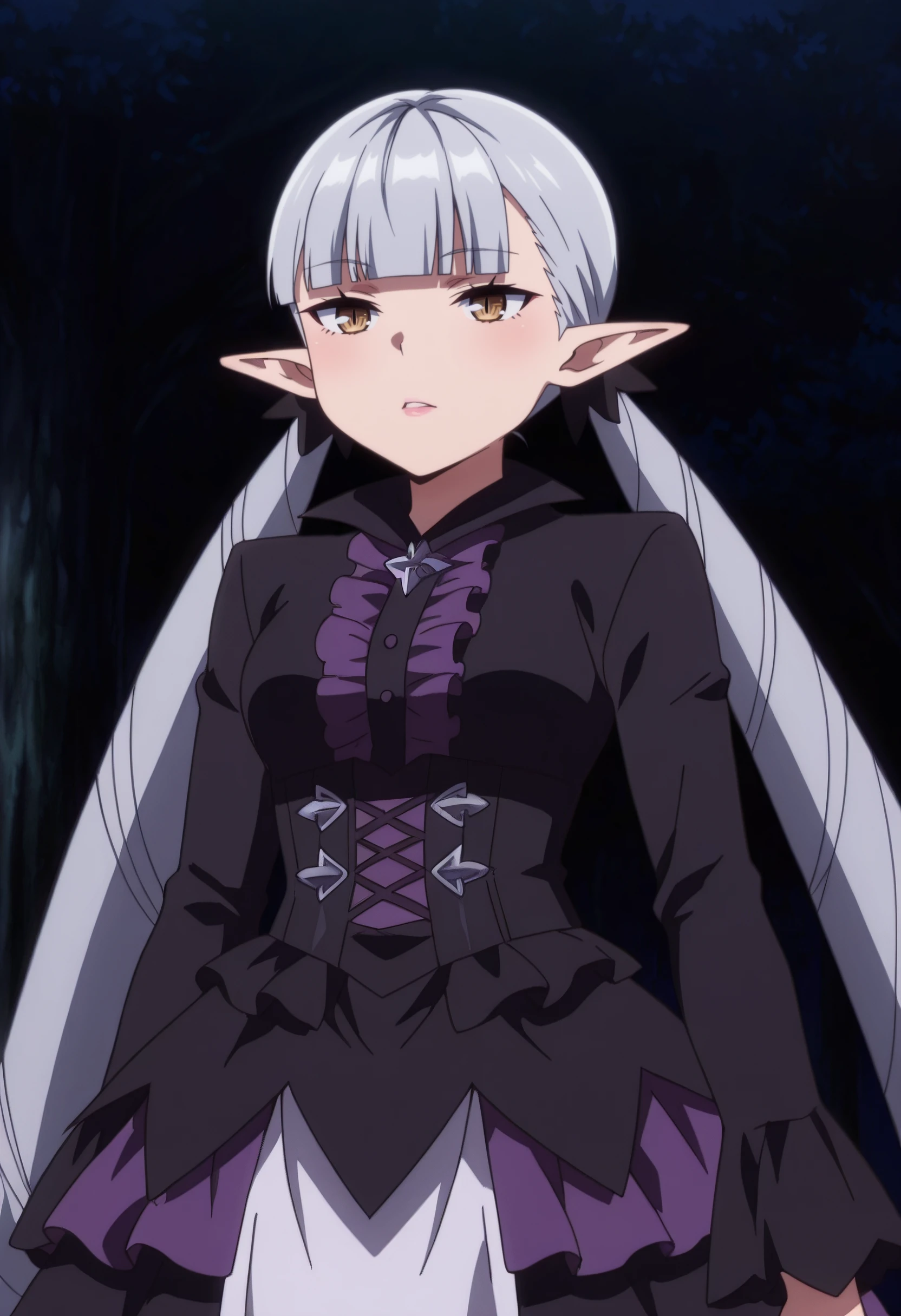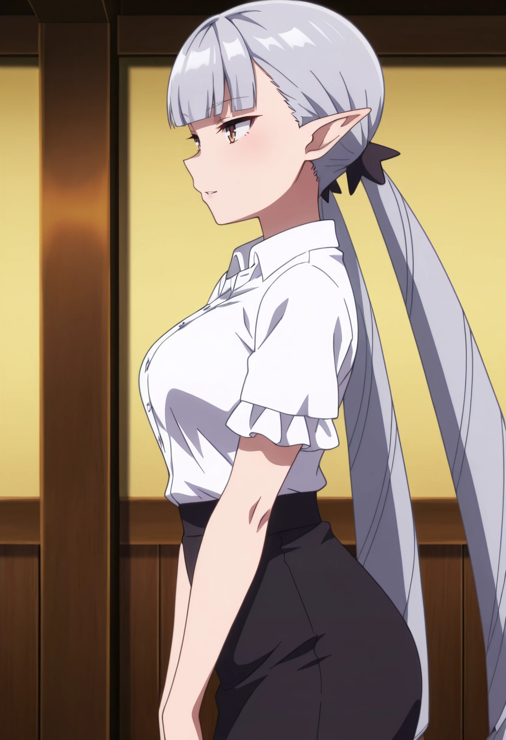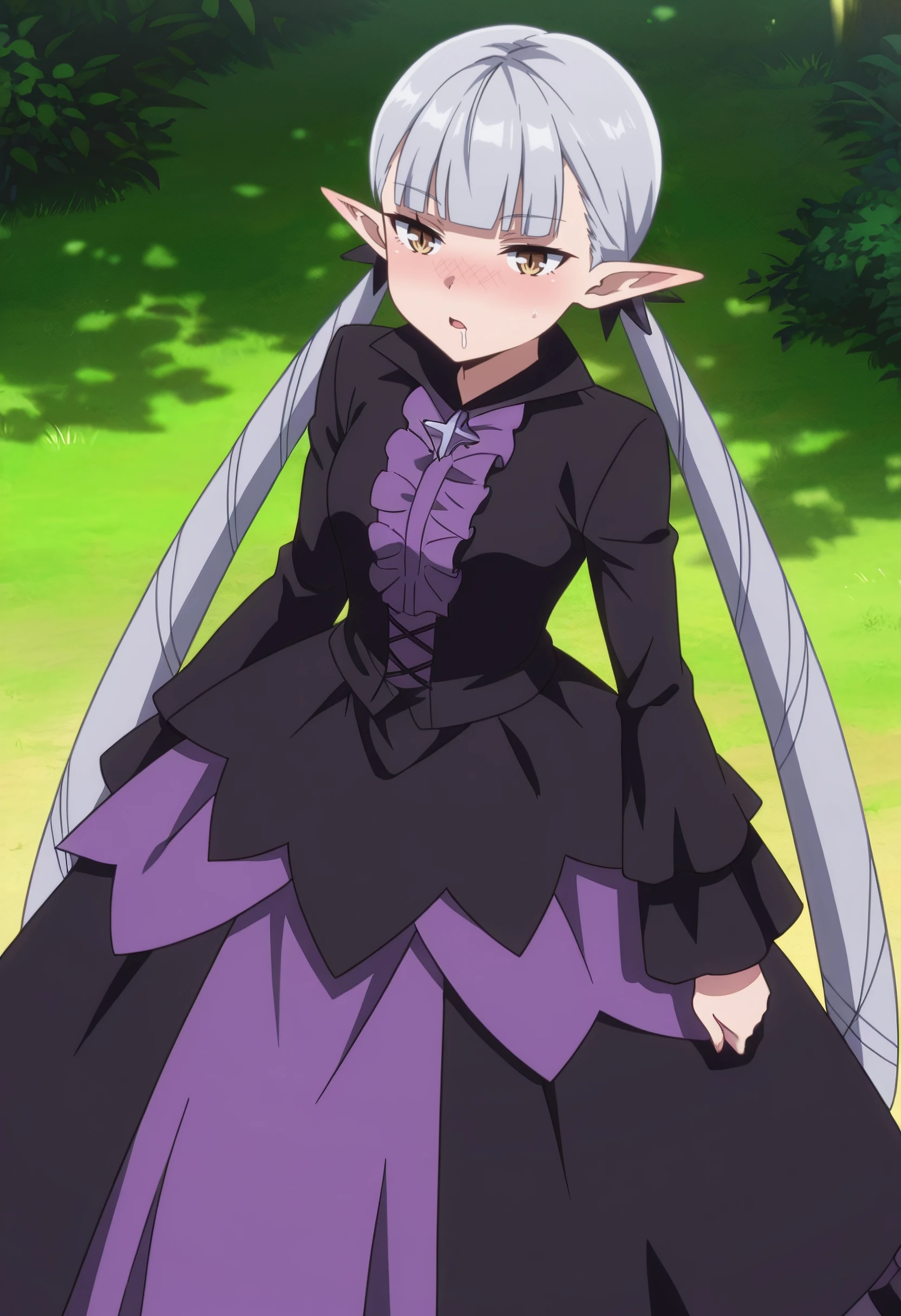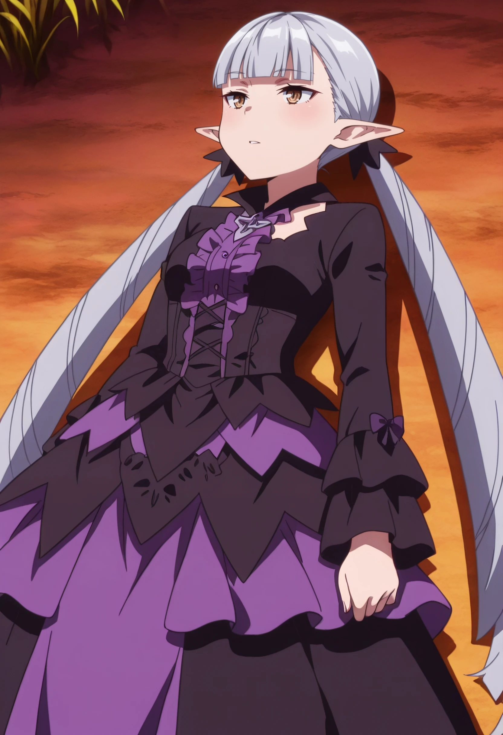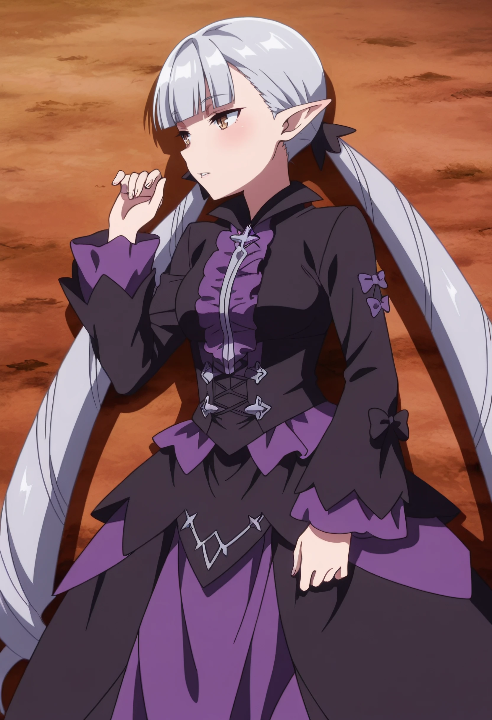 BBelzebuth, elf, bangs, long hair, pointy ears, blunt bangs, eyebrows visible through hair, brown eyes, silver hair, twintails, very long hair,
