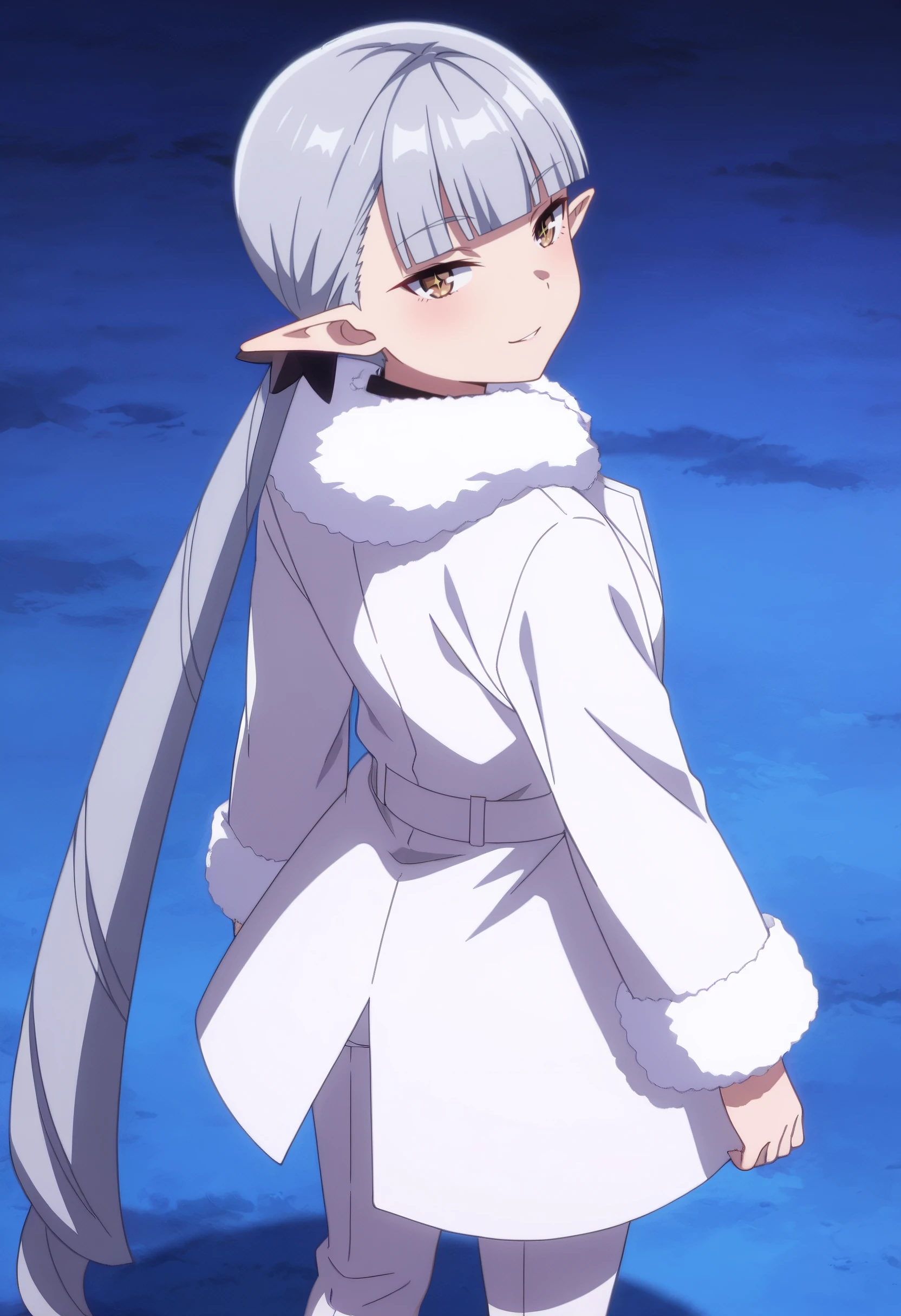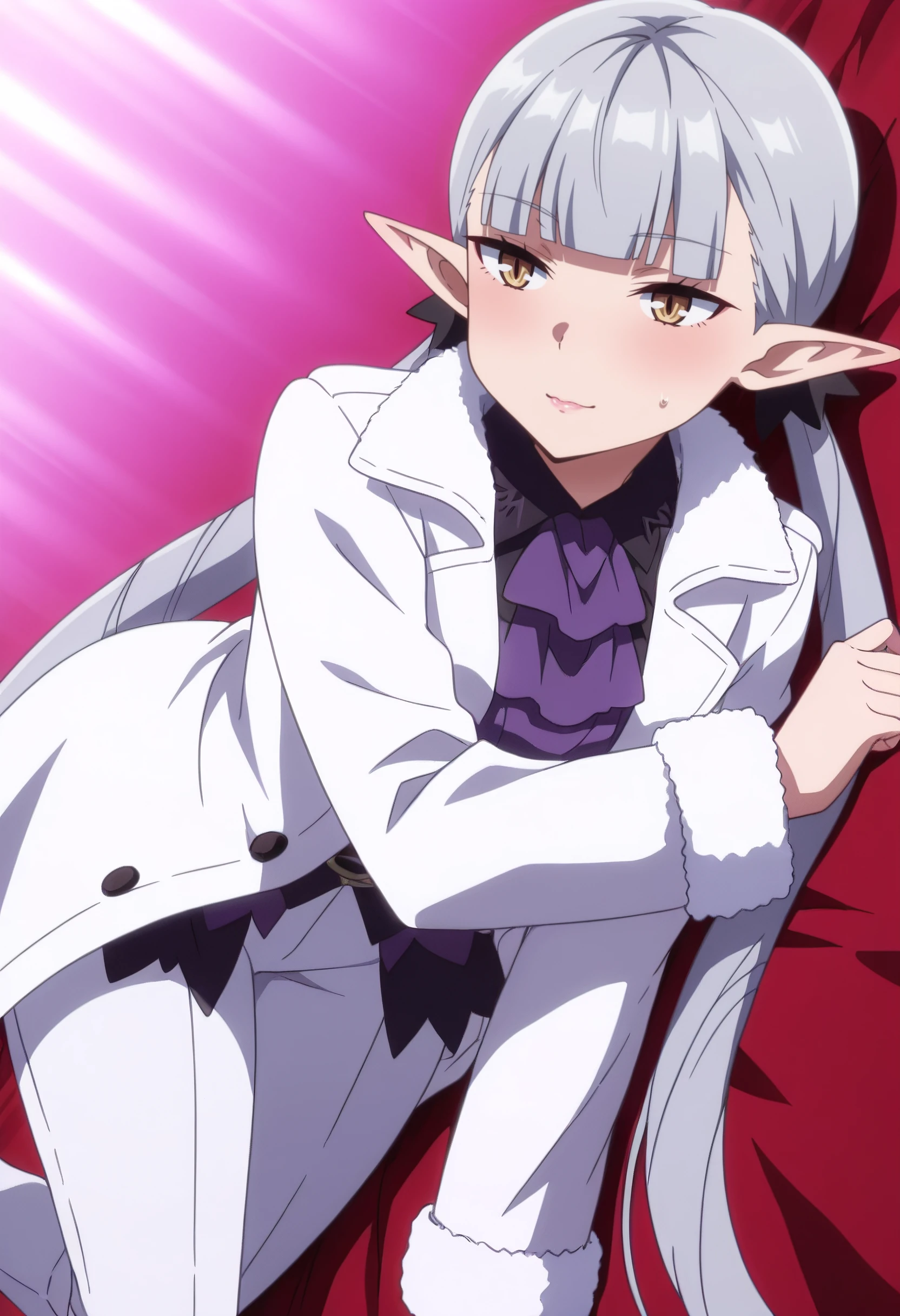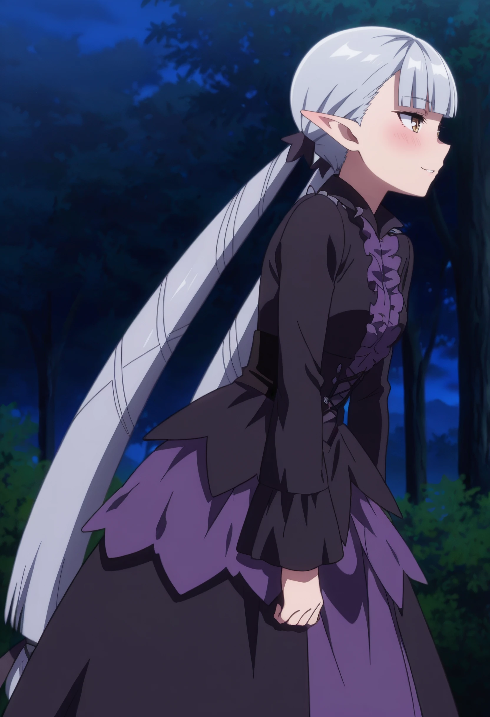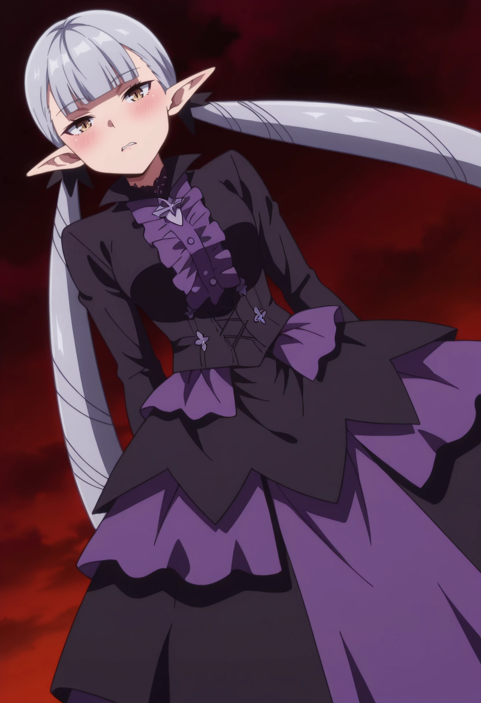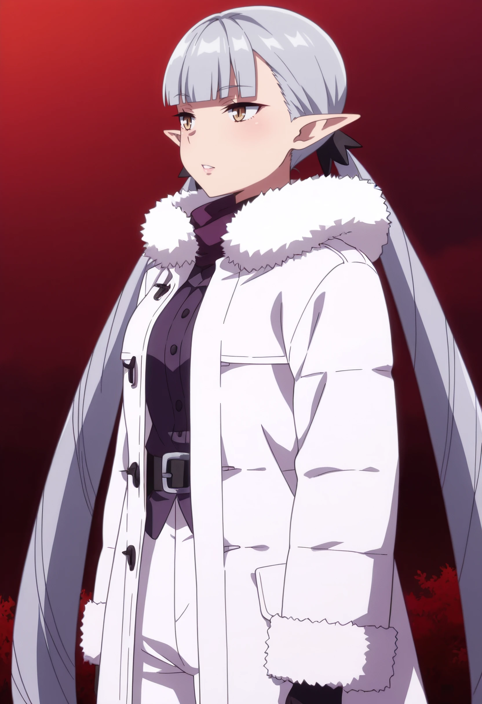 BBelzebuth, elf, bangs, long hair, pointy ears, blunt bangs, eyebrows visible through hair, brown eyes, silver hair, twintails, very long hair,