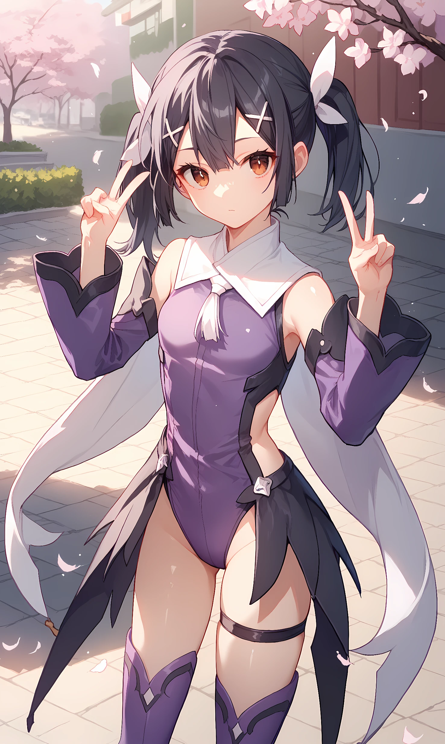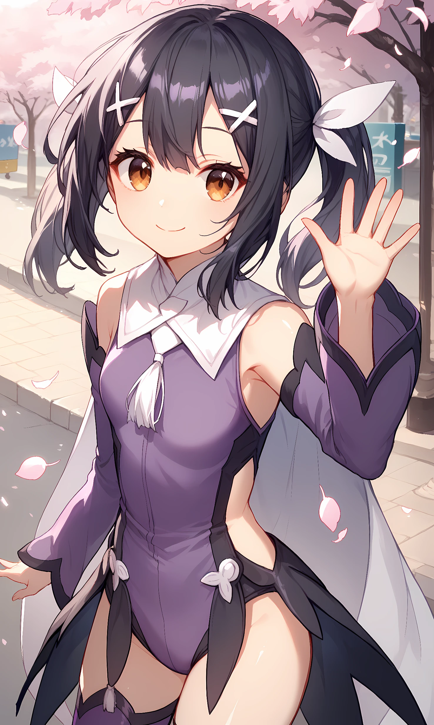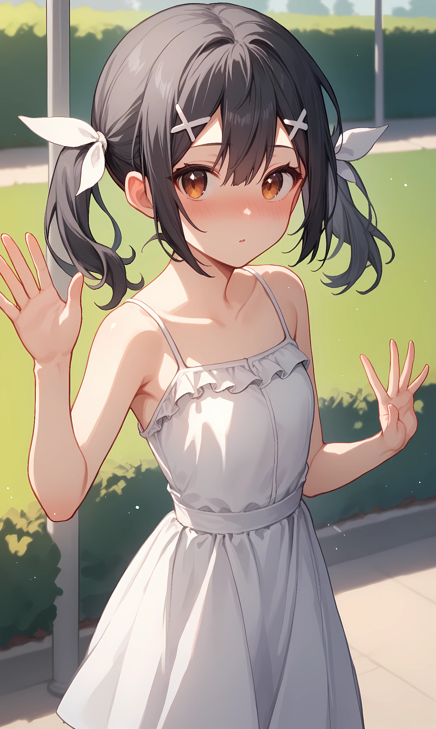 miyu, brown eyes, black hair, long hair, short twintails, sidelocks, hair between eyes, x hair ornament, white ribbon, hair ribbon