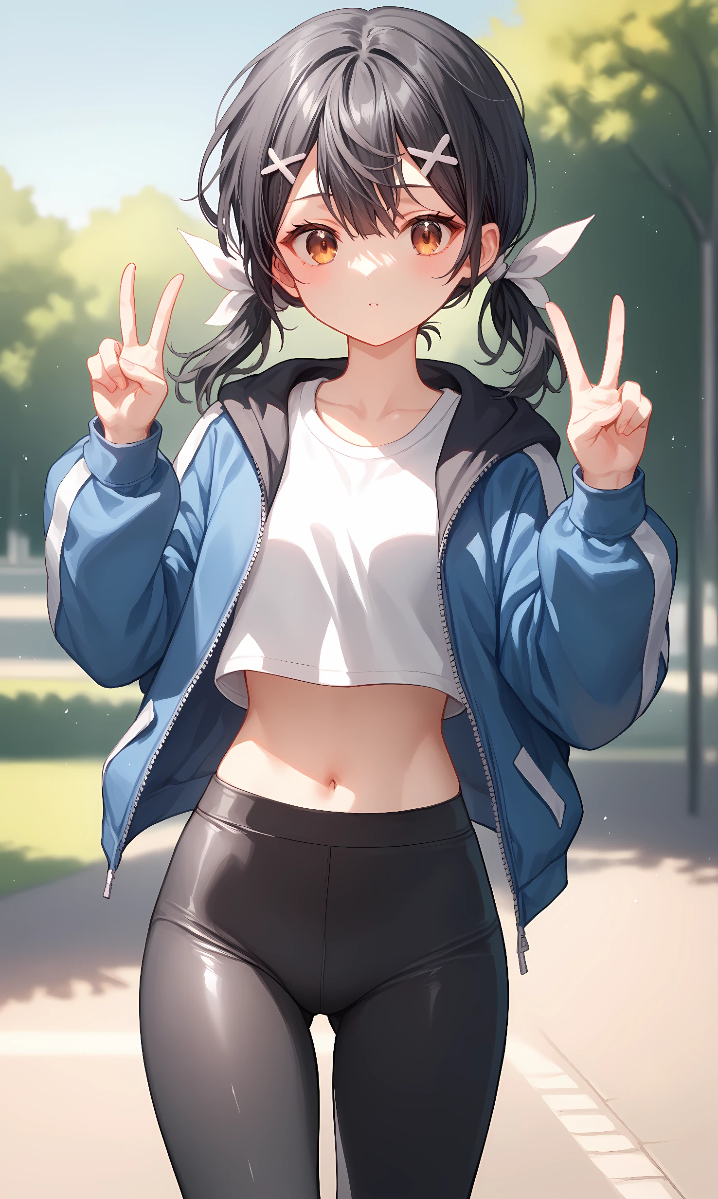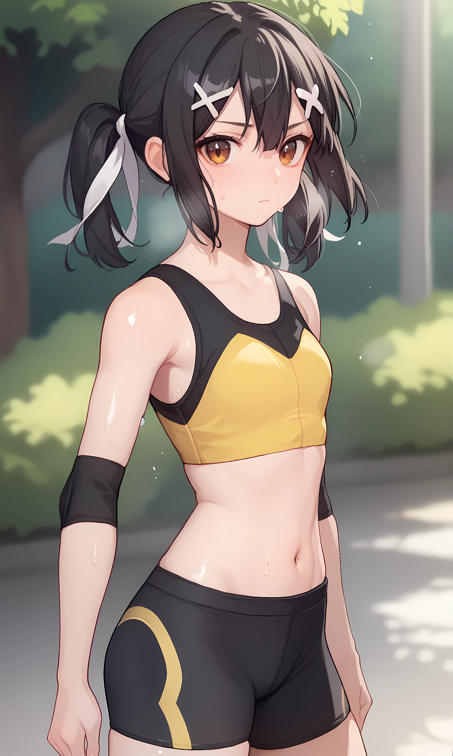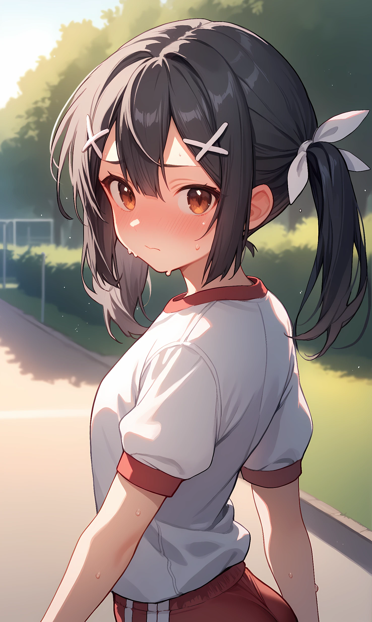 miyu, brown eyes, black hair, long hair, short twintails, sidelocks, hair between eyes, x hair ornament, white ribbon, hair ribbon