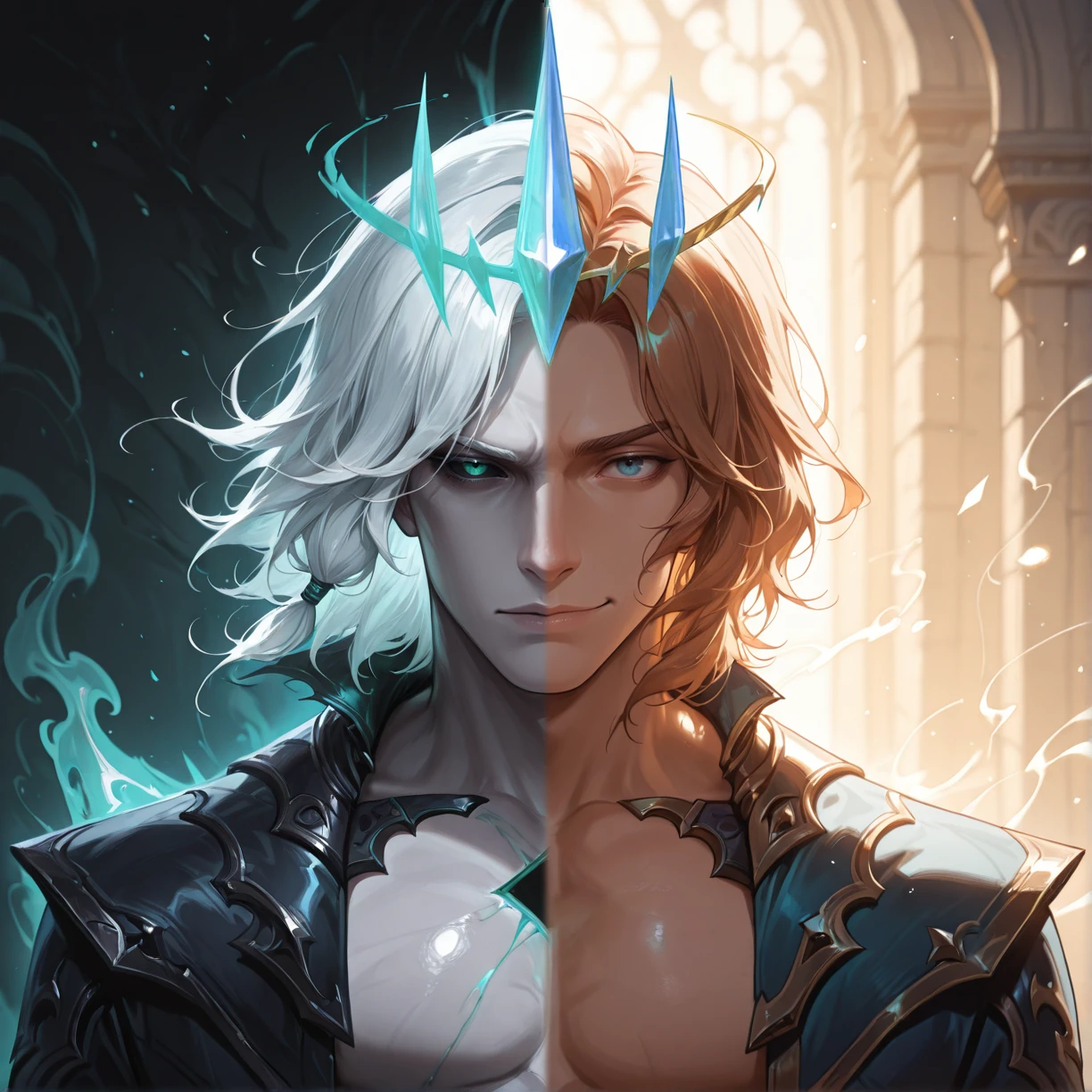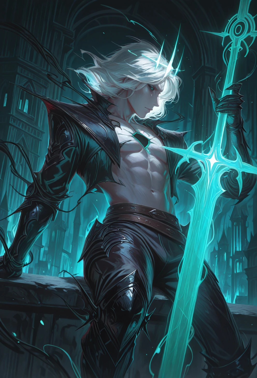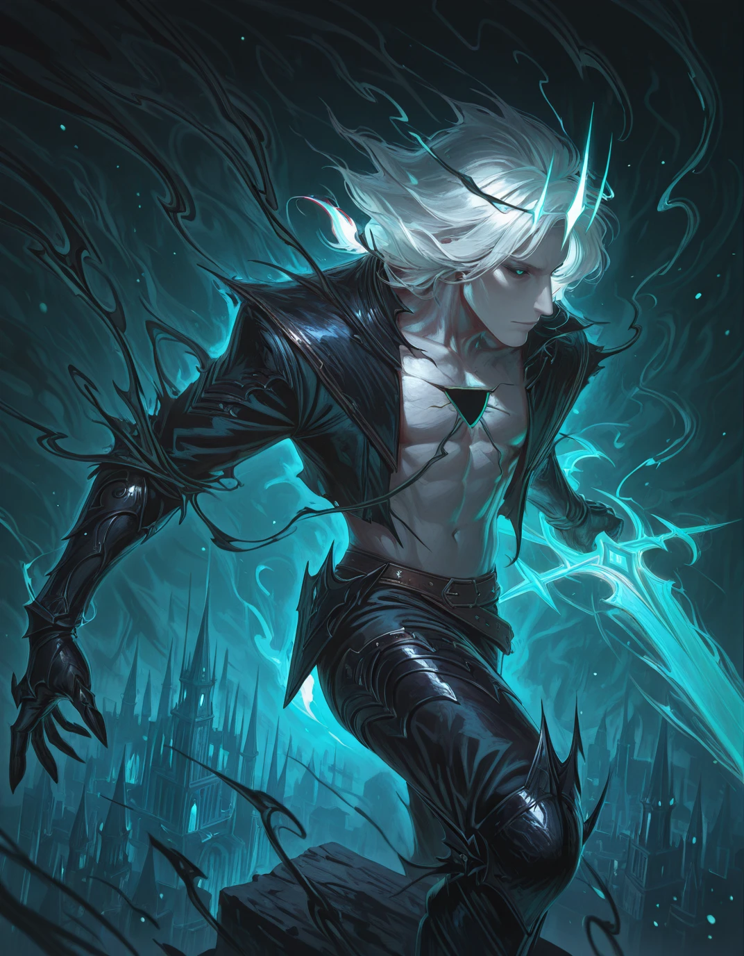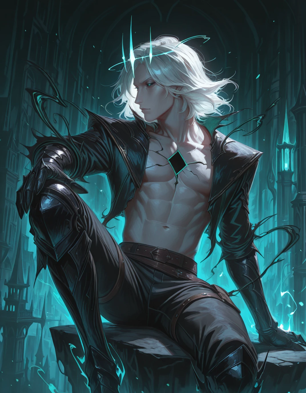 crown,white hair,medium hair,open jacket, clawed gauntlets,black pants ,green eyes, bare pectorals, glowing eyes, brown belt,armored boots, grey skin,leg armor, black jacket, hole in chest,greaves,