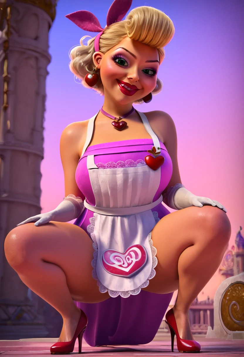 ilvira_casu, milf, plump, curvy, shortstack, bumper bangs (blonde curly hair), green eyes, big lips, mole on cheek, bare shoulders, big chest, cleaveage, wide hips, large butt, small feet, makeup, light blue and pink eyeshadows, red lipstick, pink headband, apple earrings, cookie heart necklace, strapless pink dress, white apron (heart ornament, red and pink oven mit on side), white gloves (doily lace border, heart on each gloves), small red high heels,