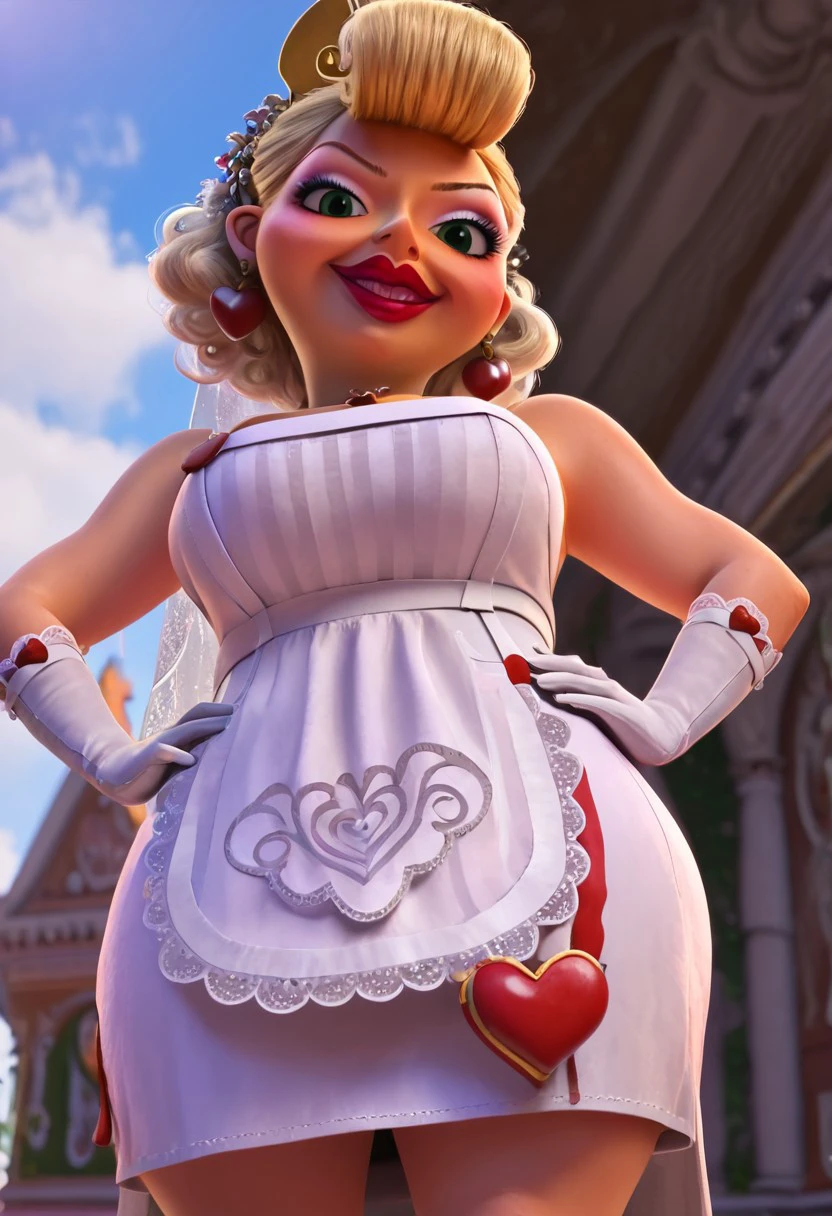 ilvira_bride, milf, plump, curvy, shortstack, bumper bangs (blonde curly hair), green eyes, big lips, mole on cheek, bare shoulders, big chest, cleaveage, wide hips, large butt, small feet, makeup, light blue and pink eyeshadows, red lipstick, white headband (flower ornaments, bridal veil), apple earrings, cookie heart necklace, strapless white dress (hearts on bottom border), white apron (heart ornament, white and red oven mit on side), white gloves (doily lace border, heart on each gloves), small red high heels,