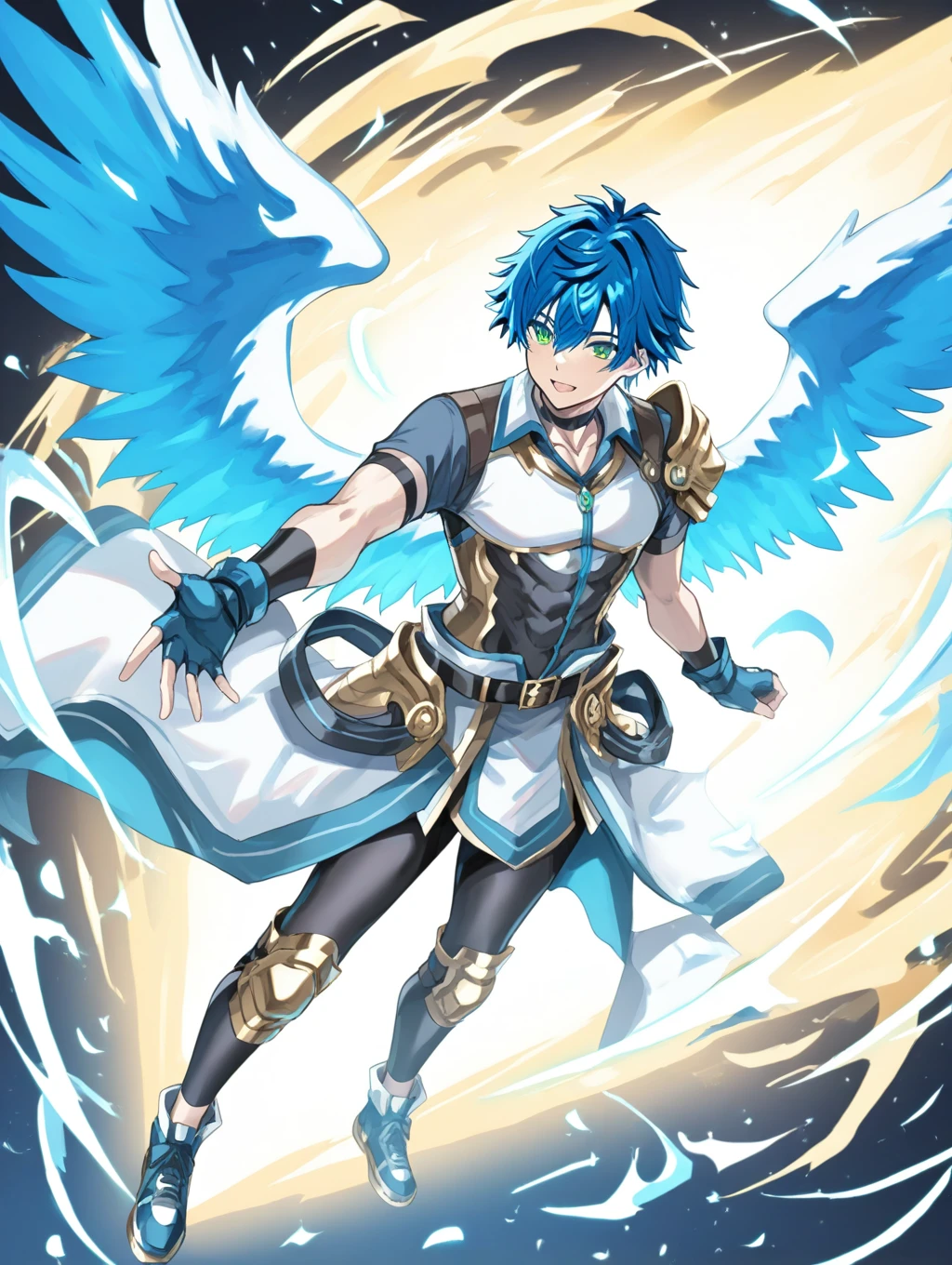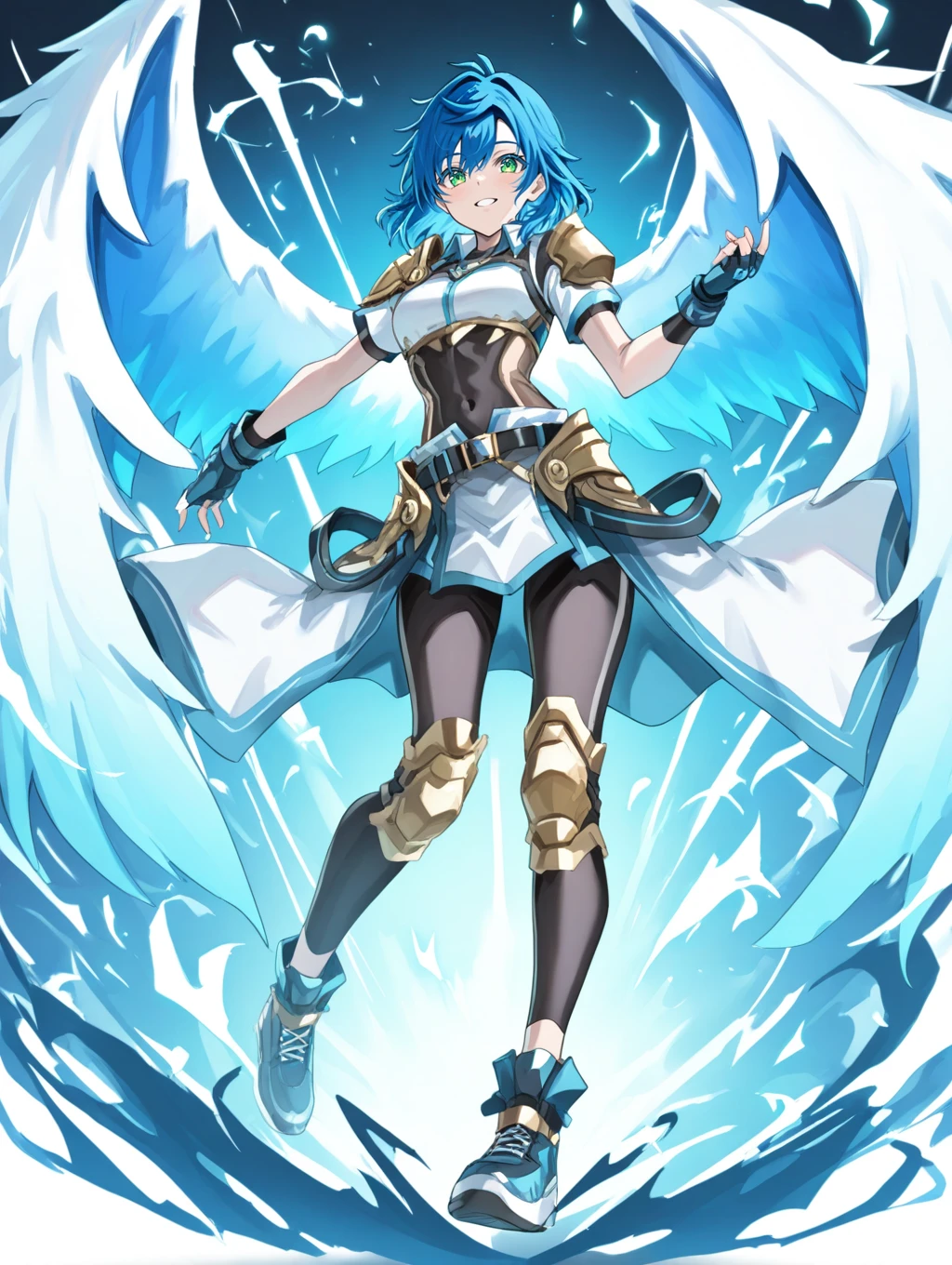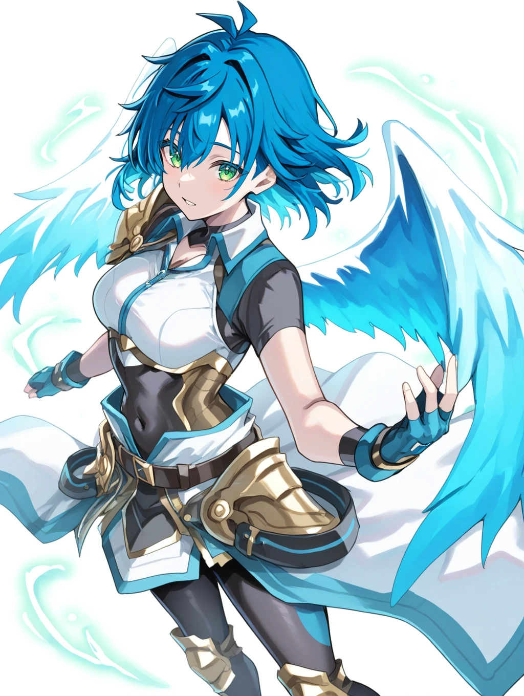 prompt example :sinnyoku,blue hair,green eyes,wings,short sleeves,fingerless gloves,shoulder armor,armor,leggings,gold knee pads,shoes