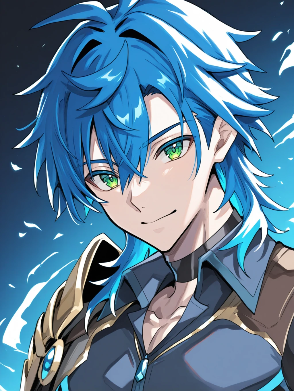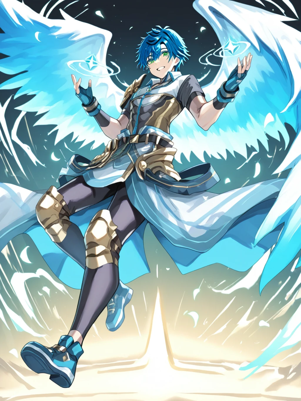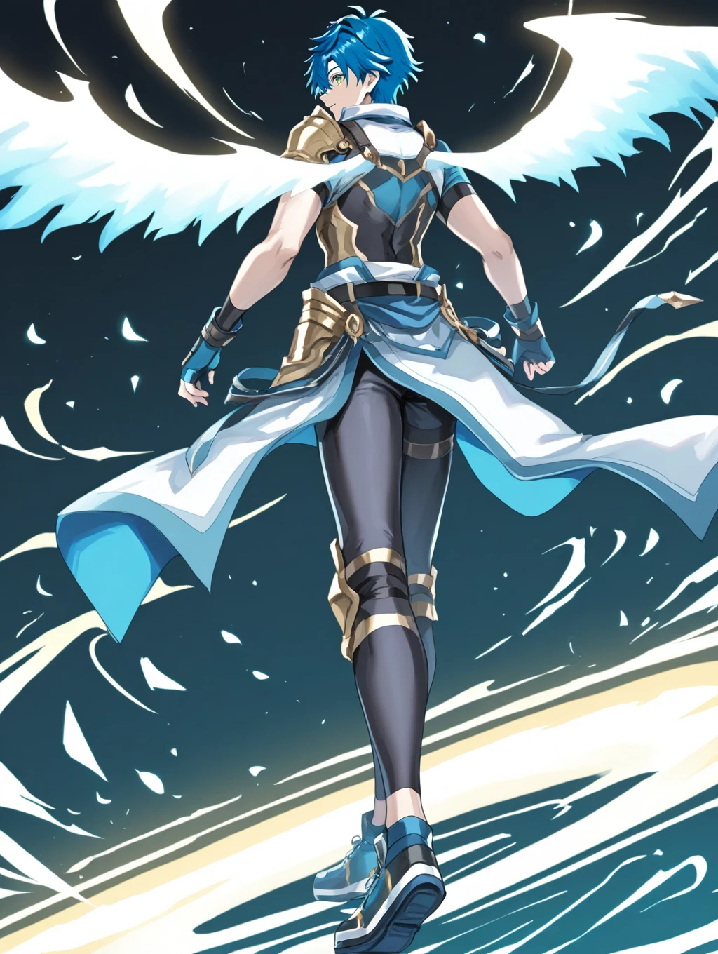 prompt example :sinnyoku,blue hair,green eyes,wings,short sleeves,fingerless gloves,shoulder armor,armor,leggings,gold knee pads,shoes