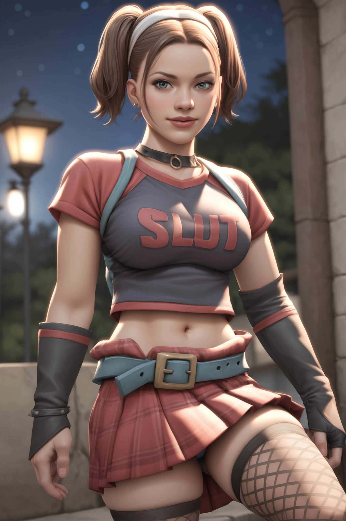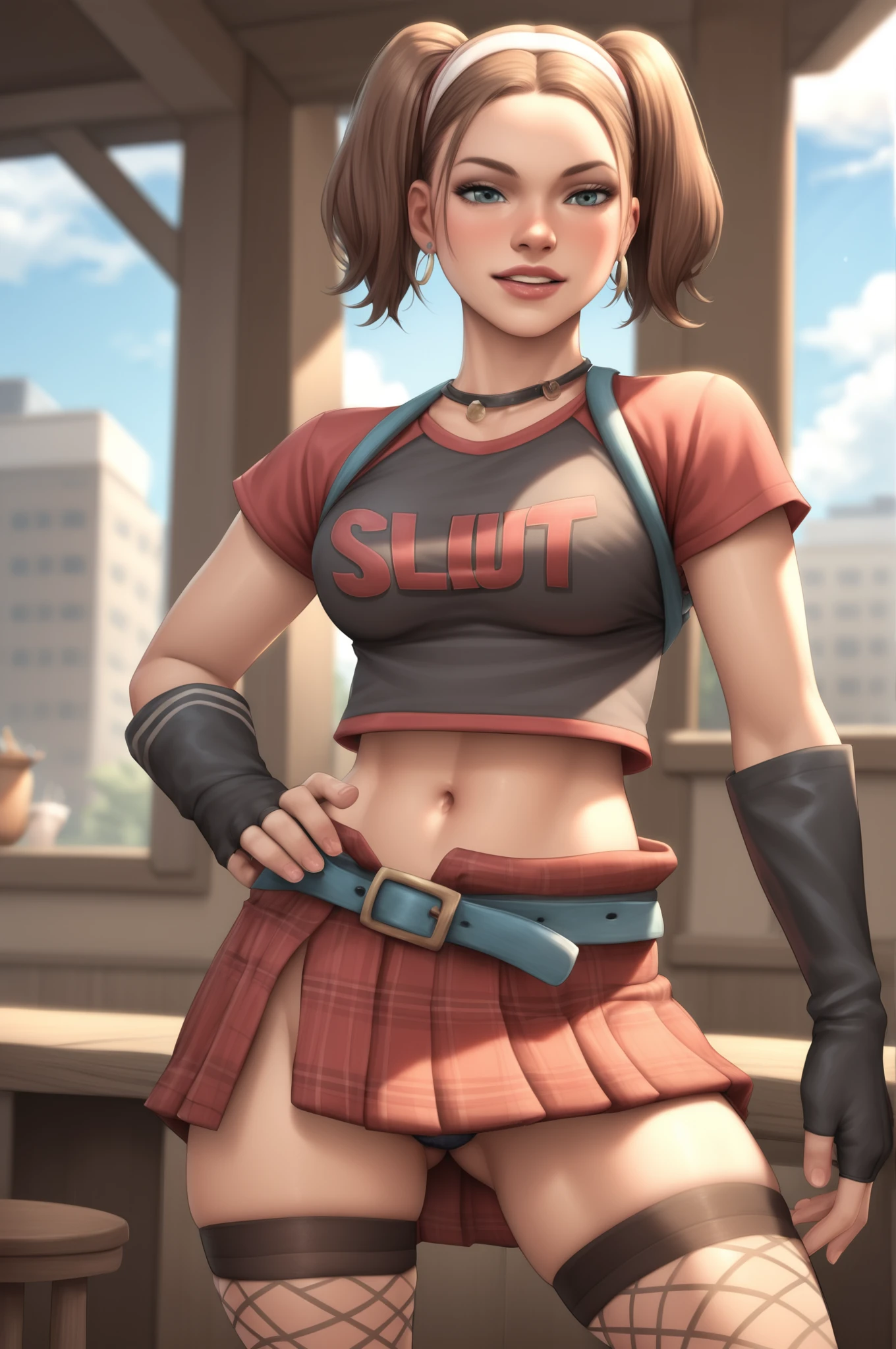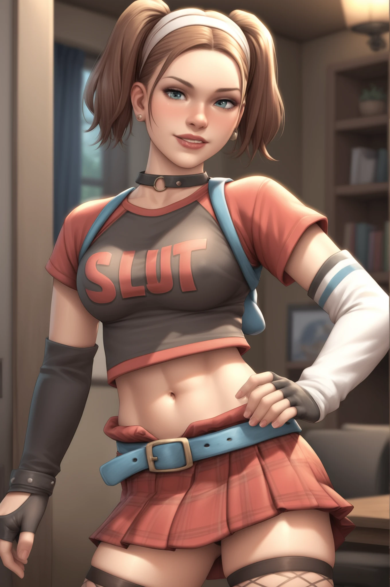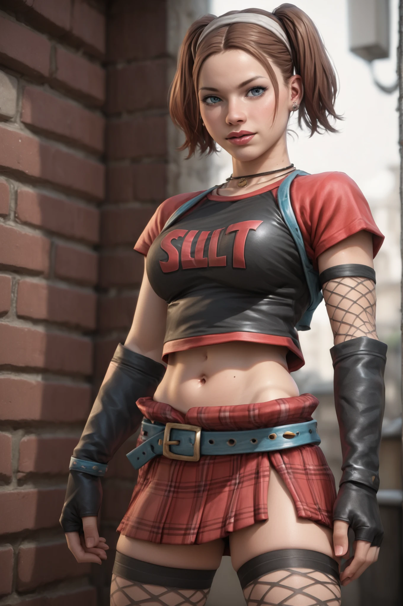 jo-beth,short hair,brown hair,twintails,arm warmers,fingerless gloves,fishnet stockings ,hairband, midriff, belt,miniskirt, plaid skirt,red skirt,skirt, t-shirt,