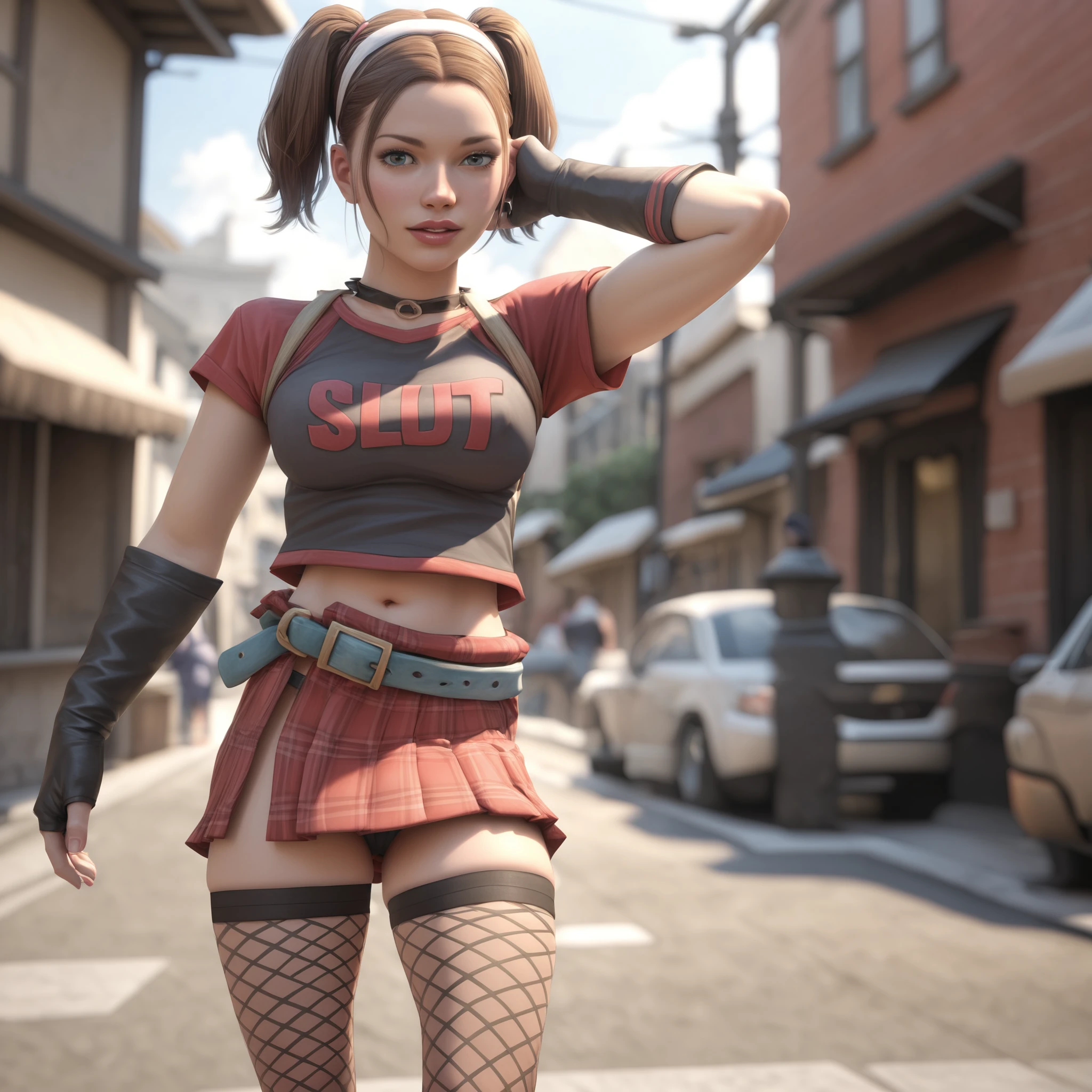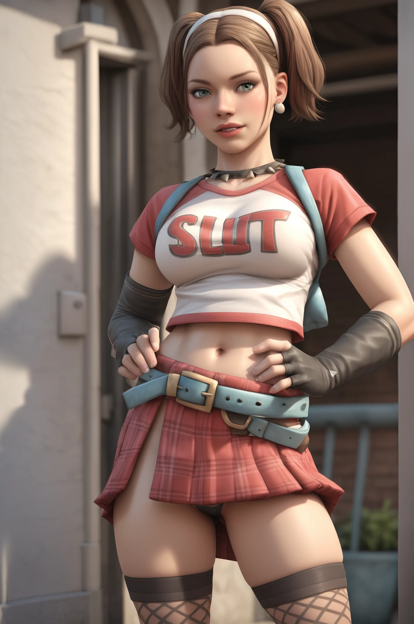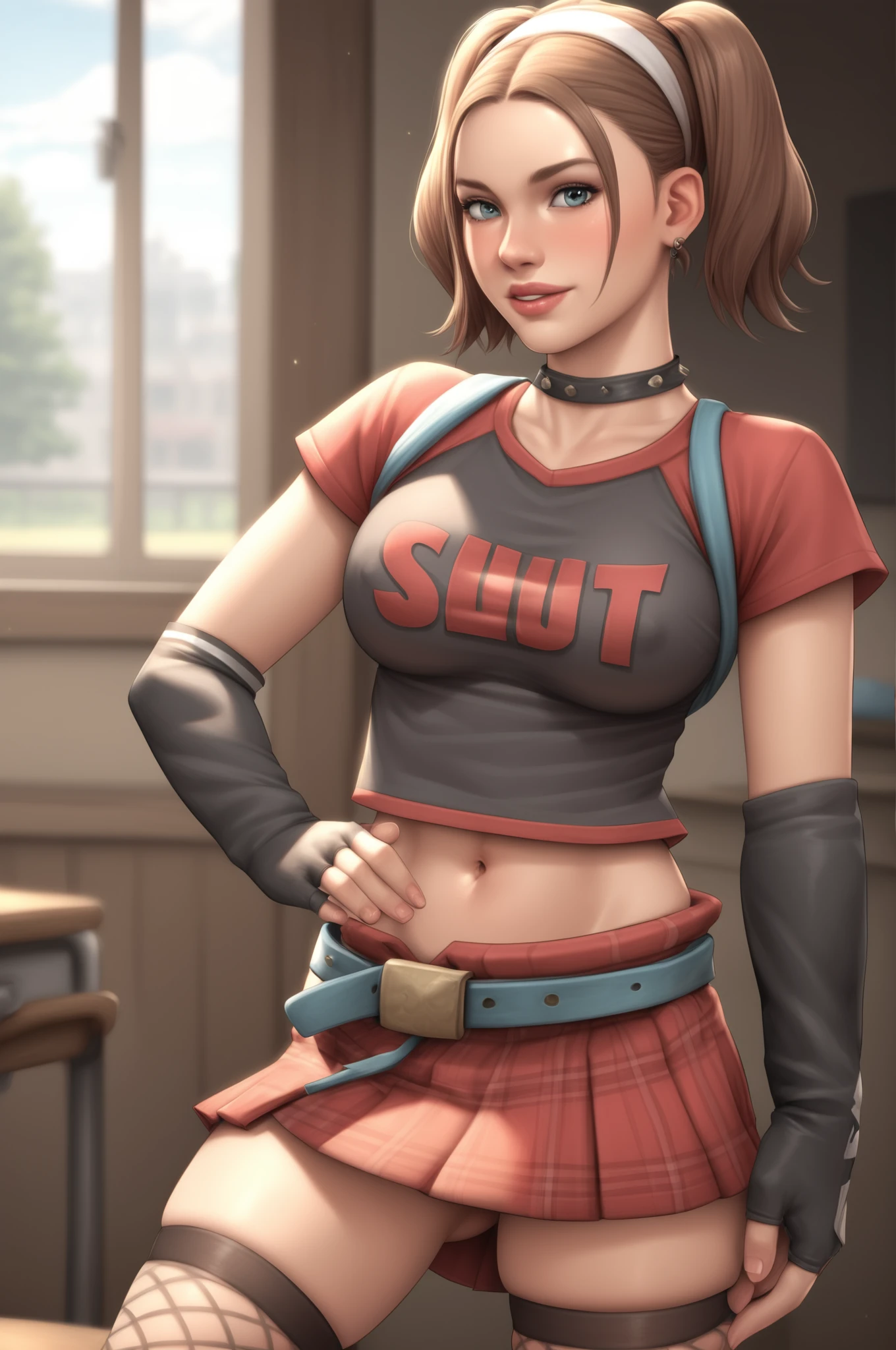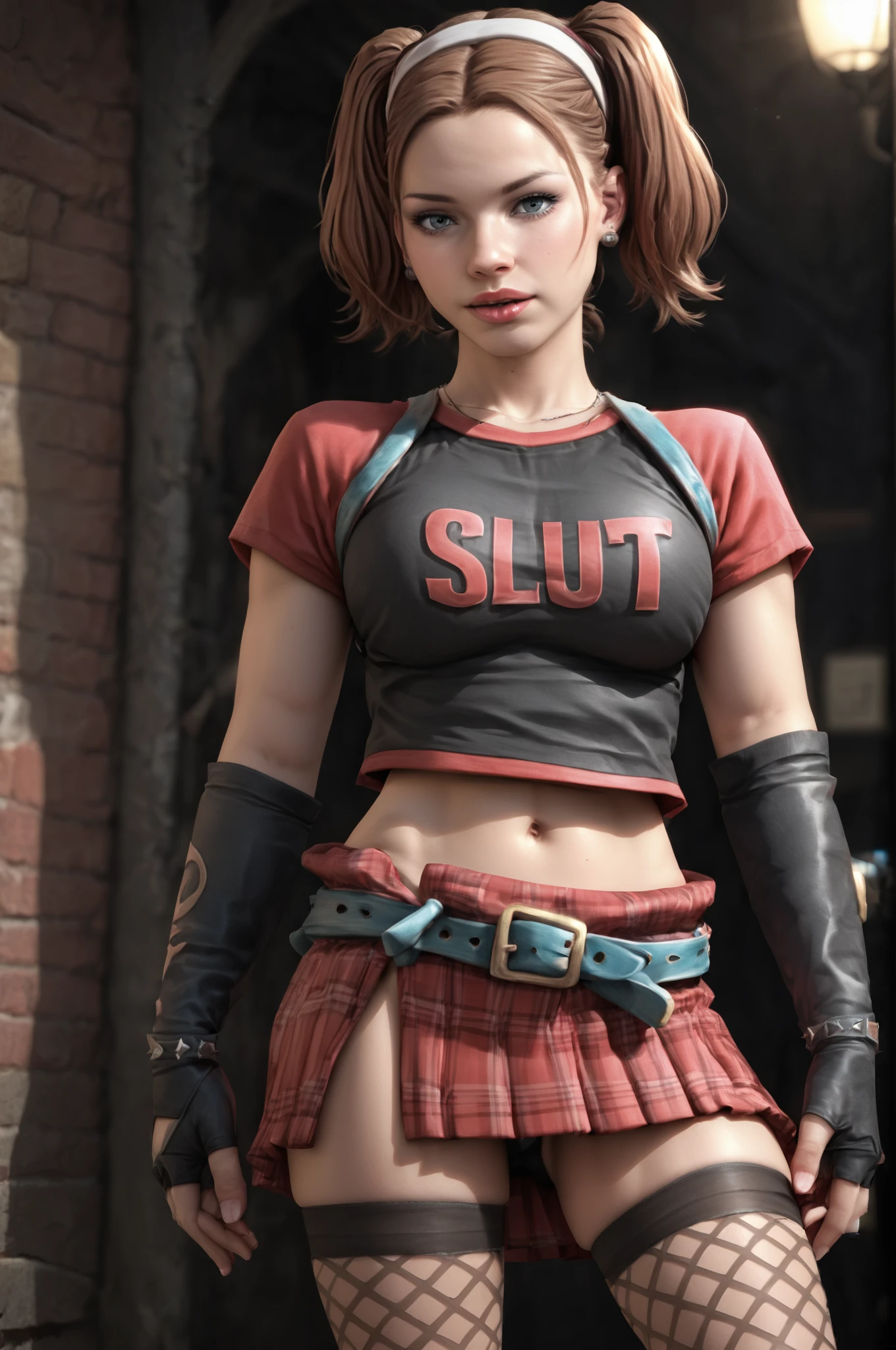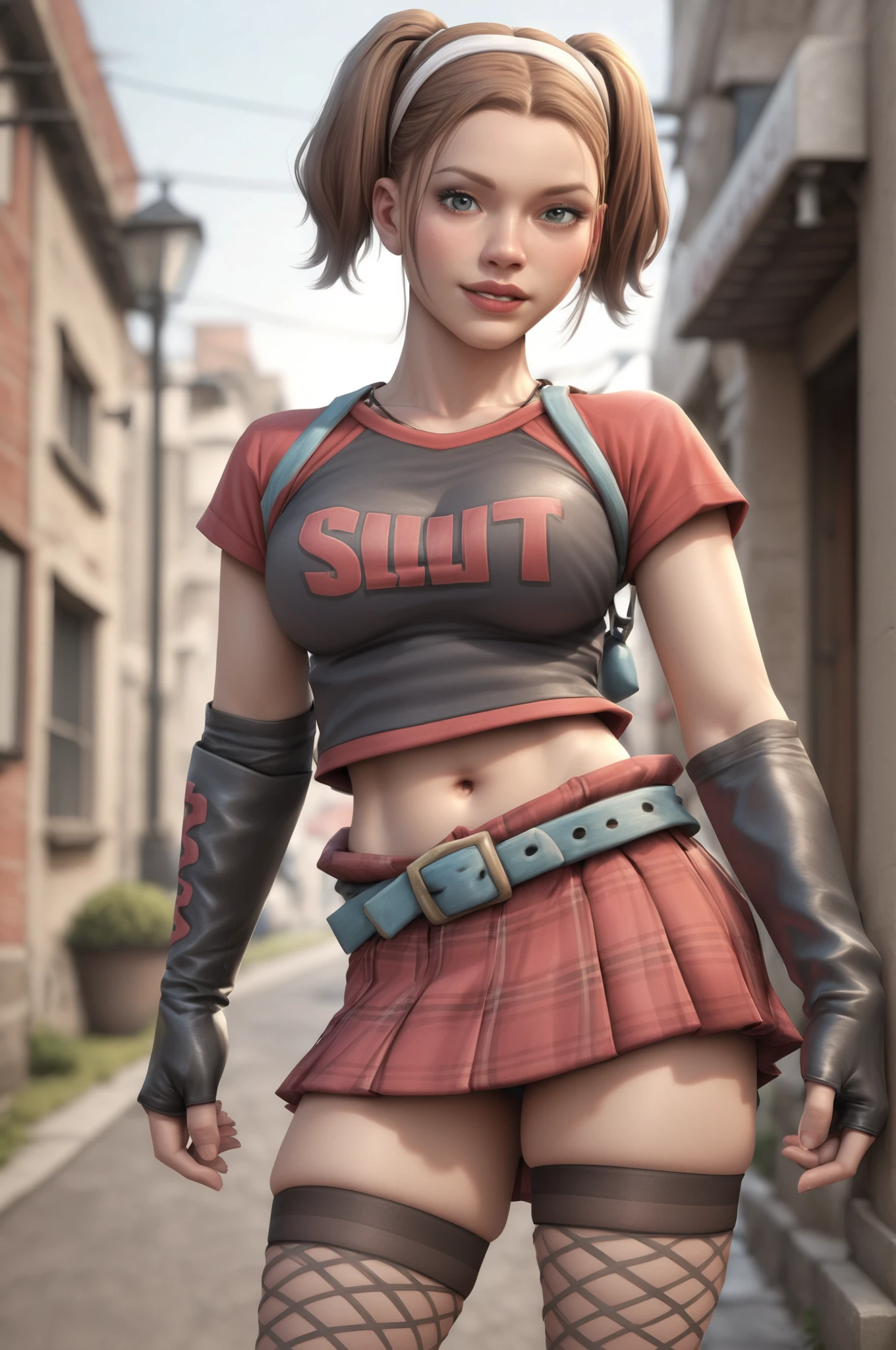 jo-beth,short hair,brown hair,twintails,arm warmers,fingerless gloves,fishnet stockings ,hairband, midriff, belt,miniskirt, plaid skirt,red skirt,skirt, t-shirt,