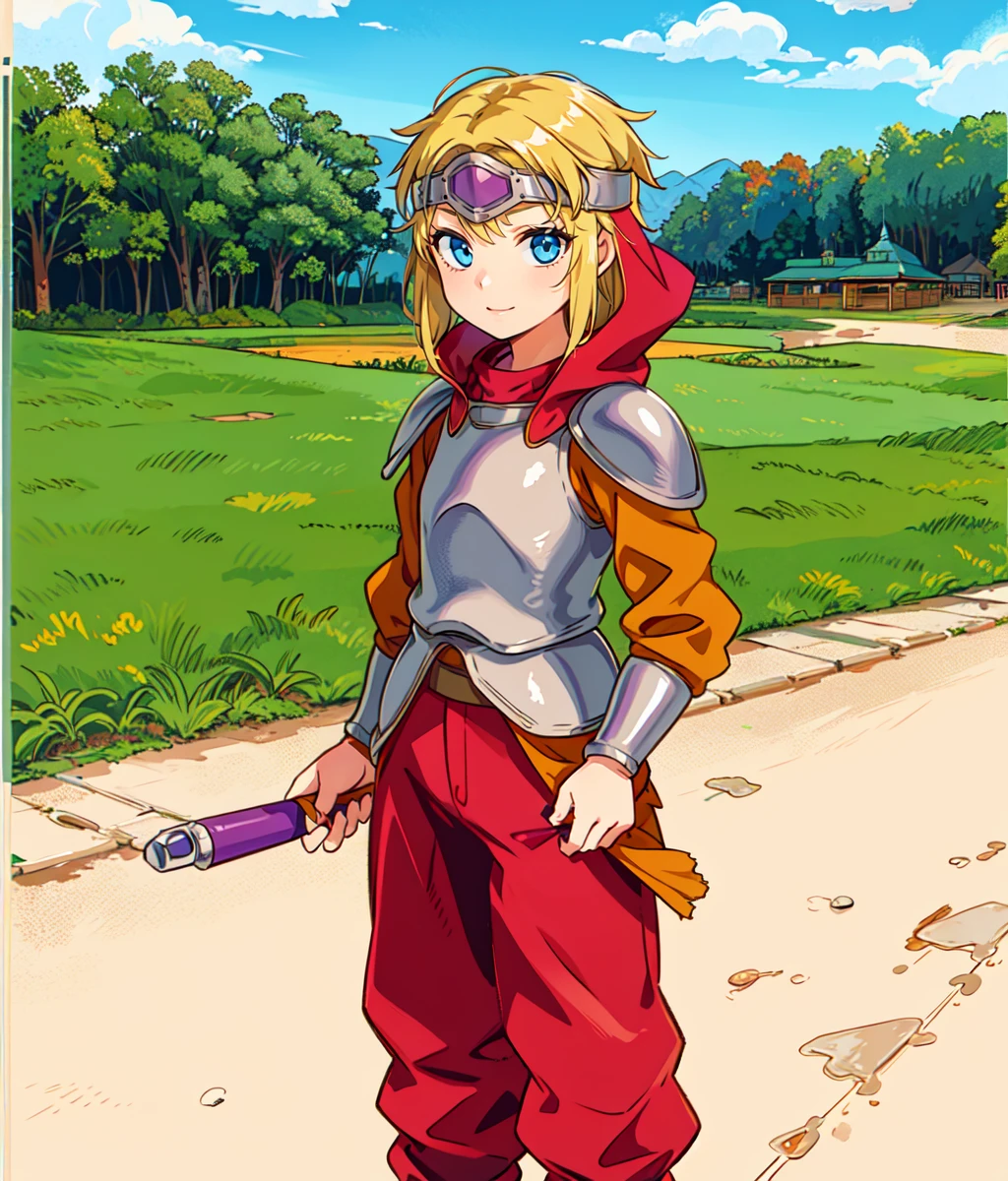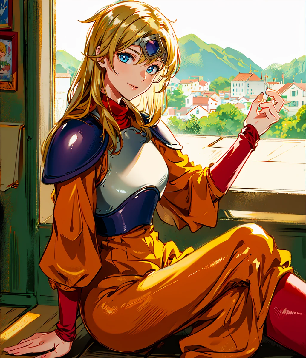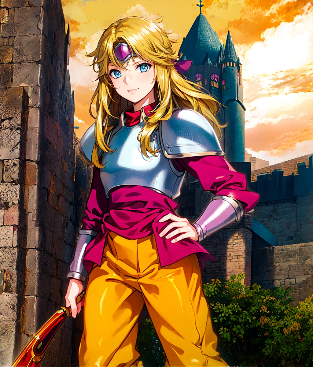 Notable tags: blonde hair, blue eyes, circlet, purple headdress, yellow outfit, red pants, armor