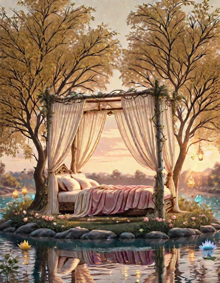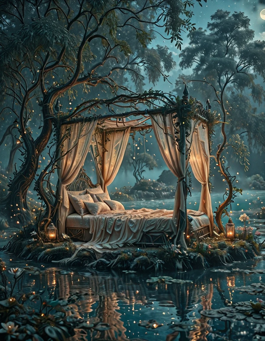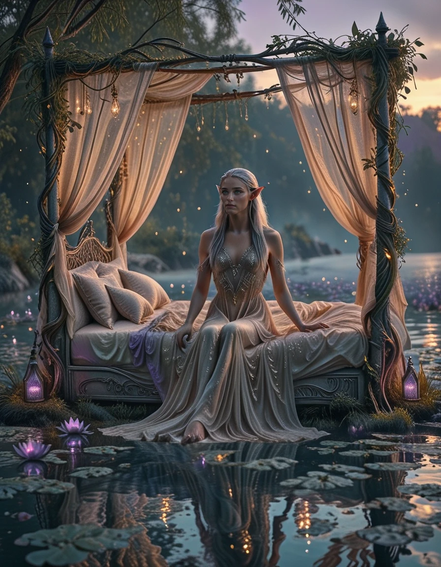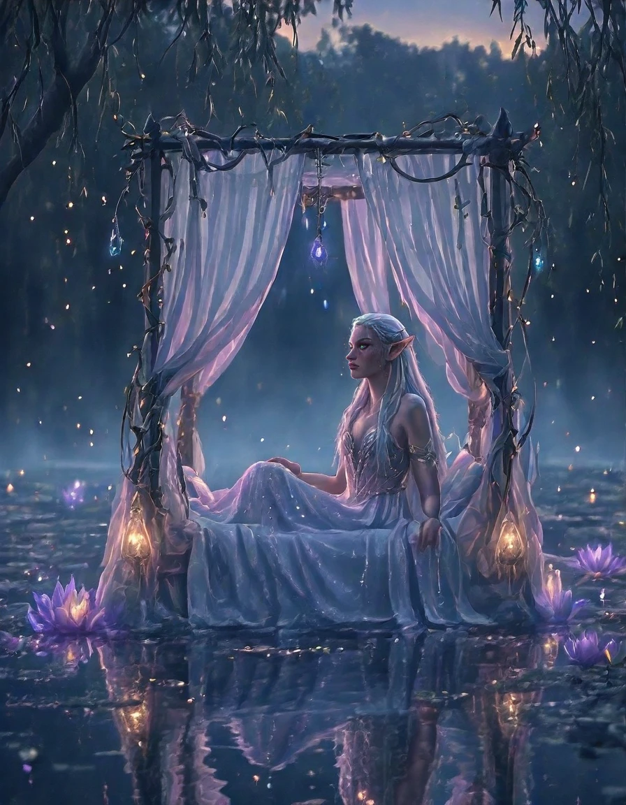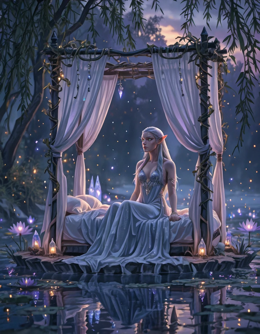 An elegant elfic bedroom inside an ancient tree, glowing wooden walls with veins of bioluminescence, arched crystal windows opening to a moonlit forest, canopy bed with silken sheets, floating lanterns casting magical light, vines and glowing flowers, serene mystical atmosphere, fantasy realism, highly detailed,