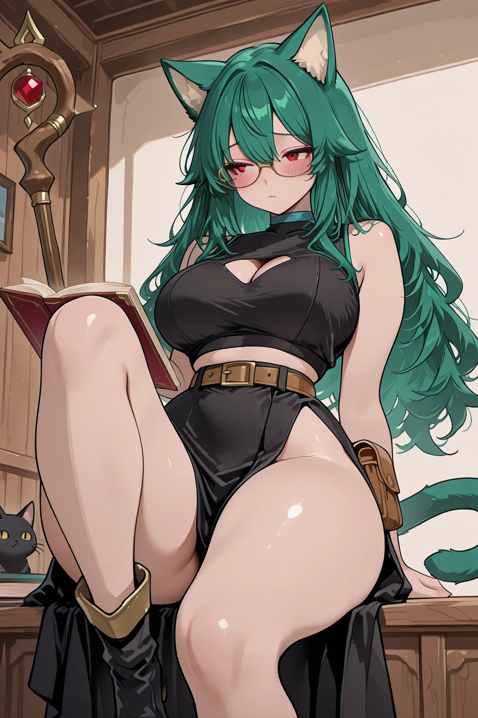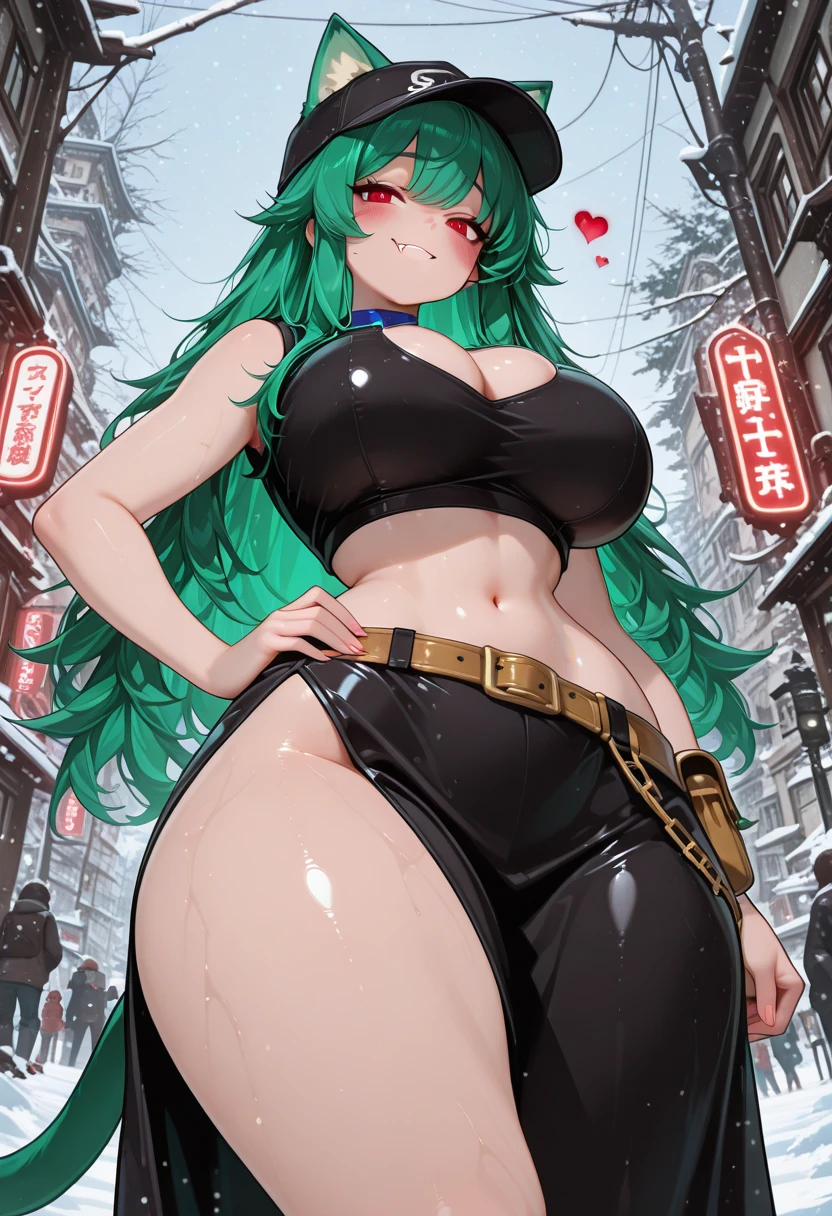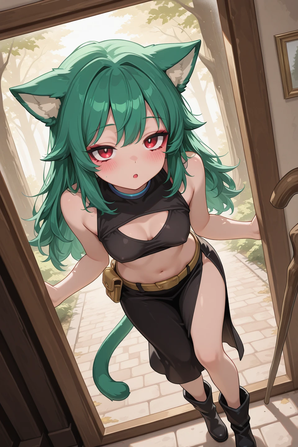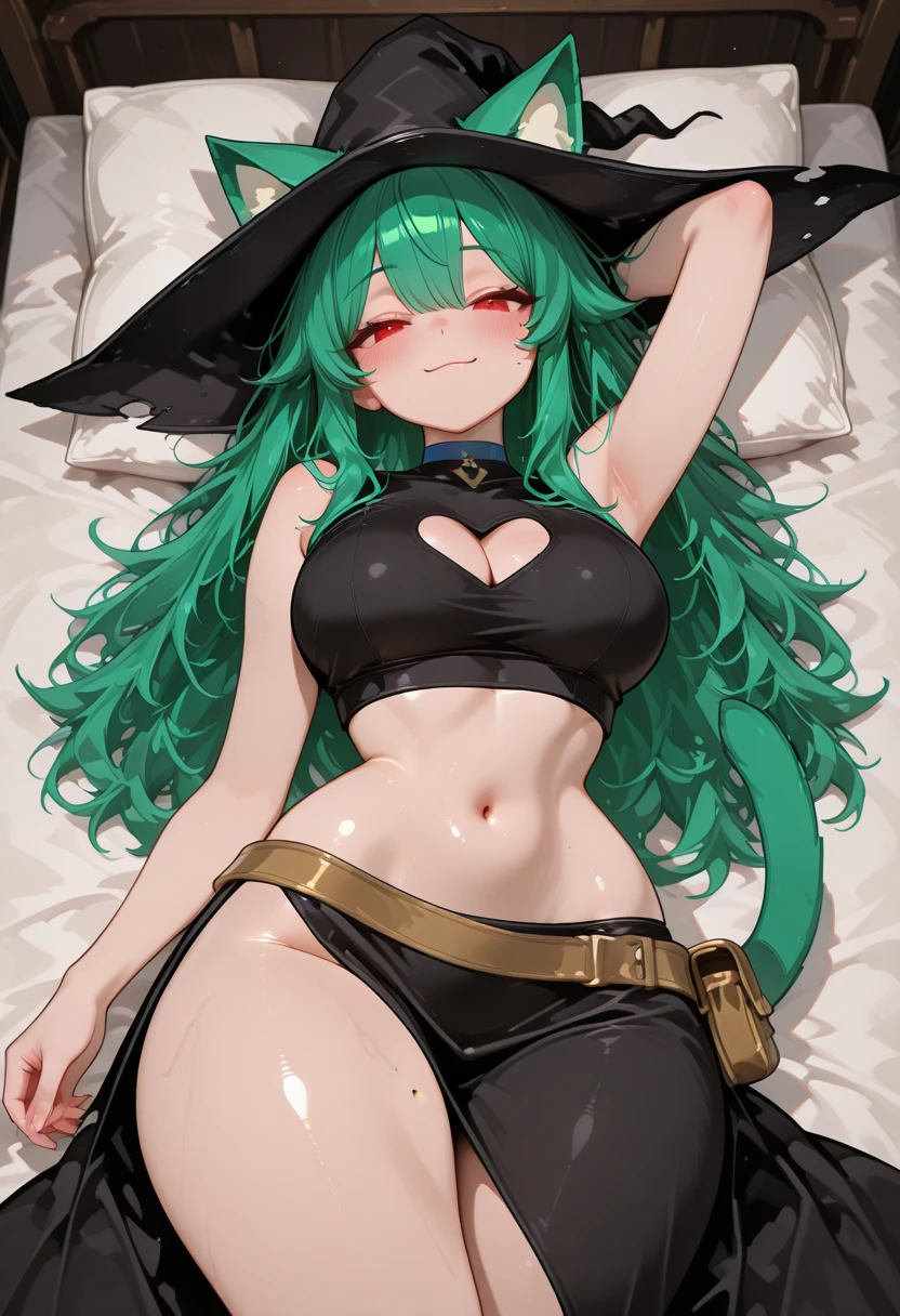 leannya_\(cat magician\), red eyes, hair between eyes, green hair, long hair, messy hair, cat ears, cat tail, fangYou can add "ears down" too, but this dont work that well when using a hat