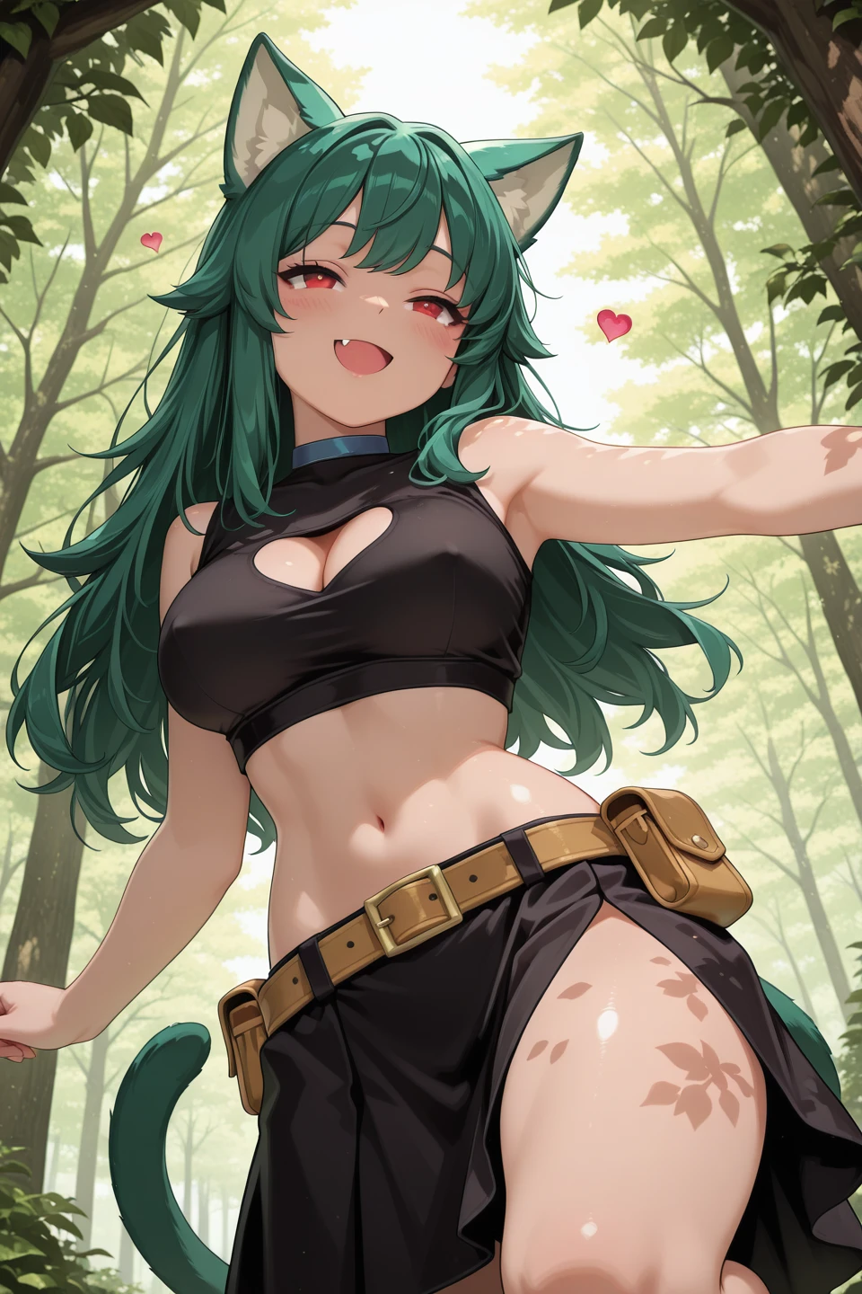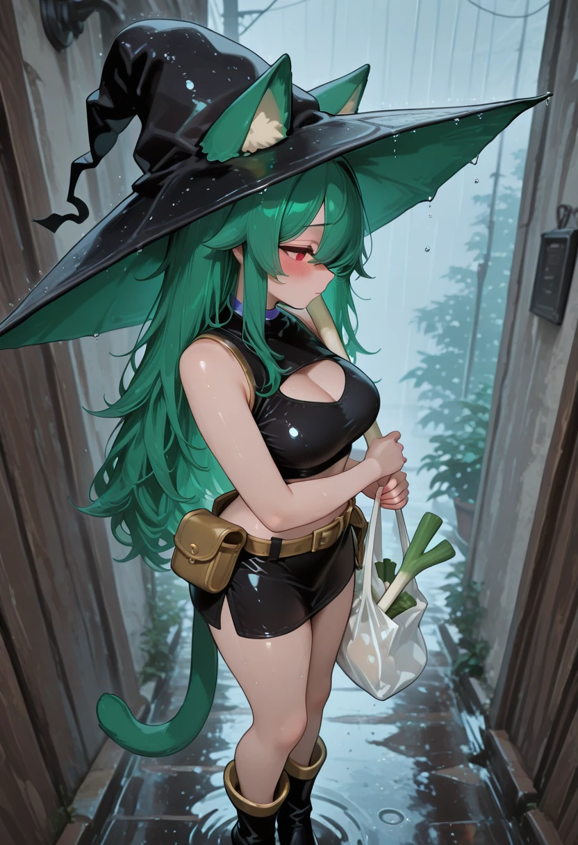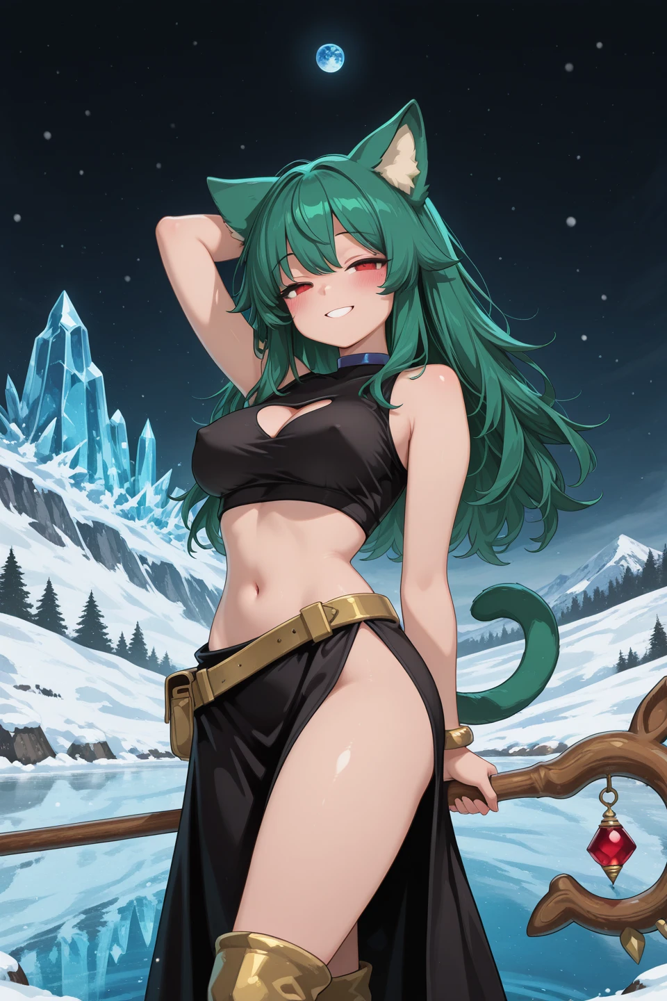 leannya_\(cat magician\), red eyes, hair between eyes, green hair, long hair, messy hair, cat ears, cat tail, fangYou can add "ears down" too, but this dont work that well when using a hat