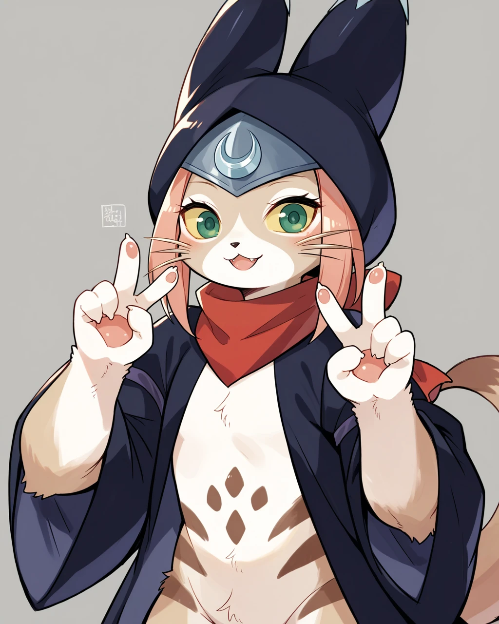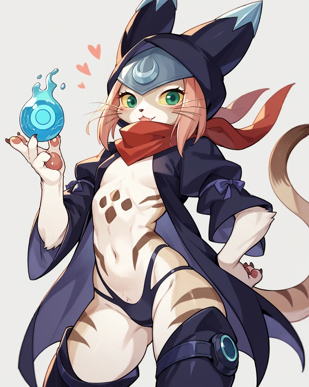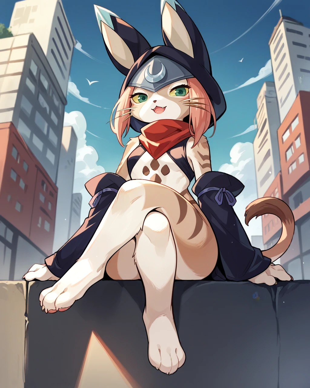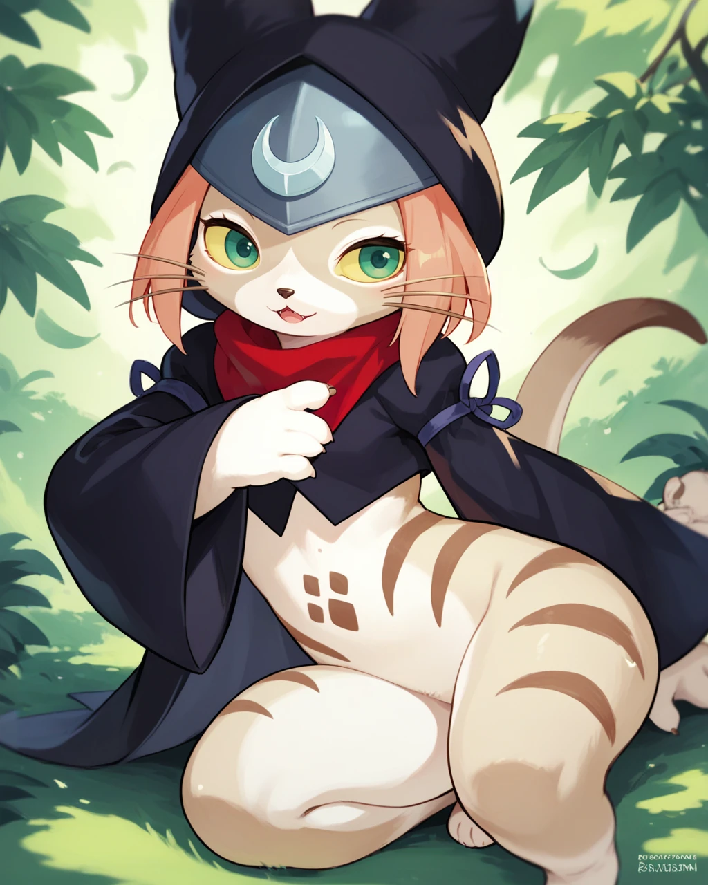 anthro, blue eyes, leotard, brown body, brown fur, female, female anthro, fur, hair, neckerchief, paws, pink hair, stripes, tail, thick thighs, felid, felyne, lynian, mammal, tsukino \(monster hunter stories\), capcom, monster hunter, monster hunter stories, monster hunter stories 2 wings of ruin, skulkers