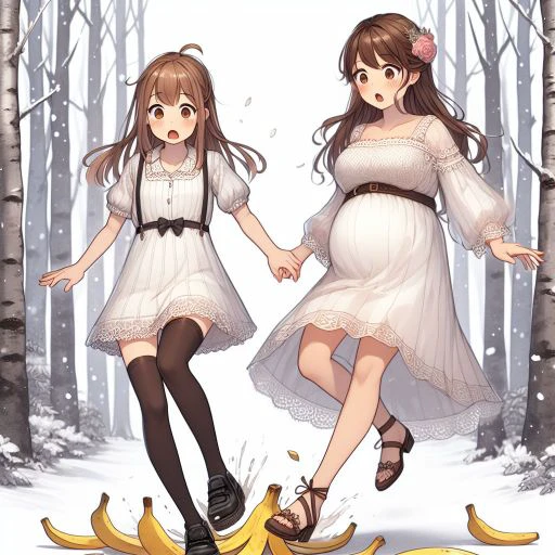 Concept consisting of waifus dramatically falling to the ground due to slipping on a banana peel with shocked expressions.