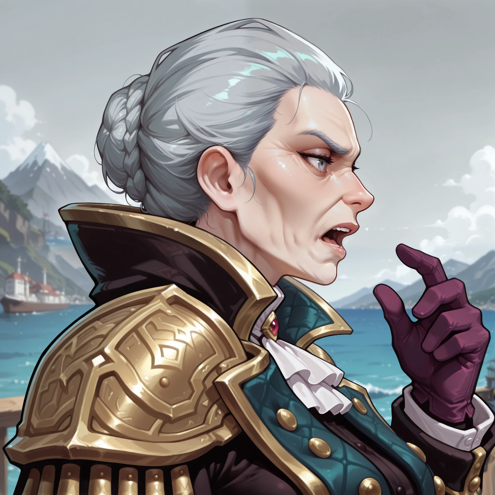 black collared overcoat, ascot, gold pauldrons, purple shirt, purple gloves, belt, grey pants, black boots, gold trim, gold buttonsNegative Tags: