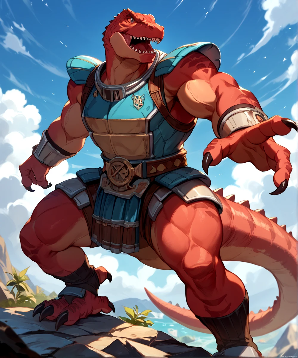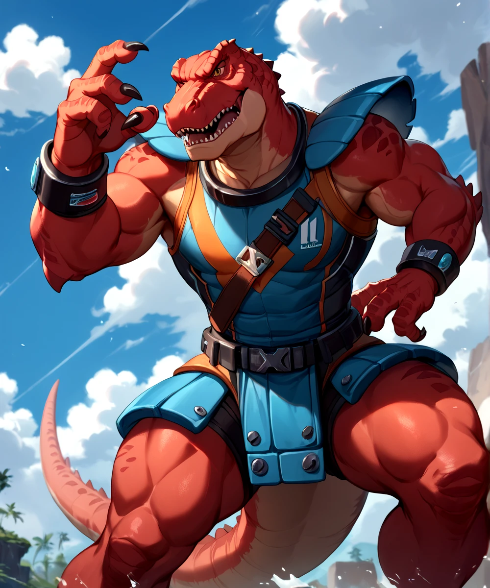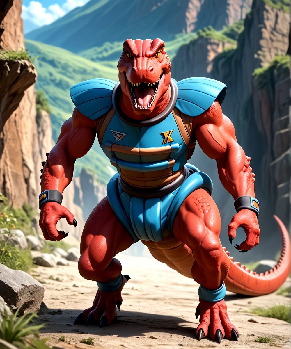 PROMPTS for this model are Genghis Rex, Dinosaucers, red skin, brown eyes, muscular, tyrannosaurus rex, trex, and dinosaur.