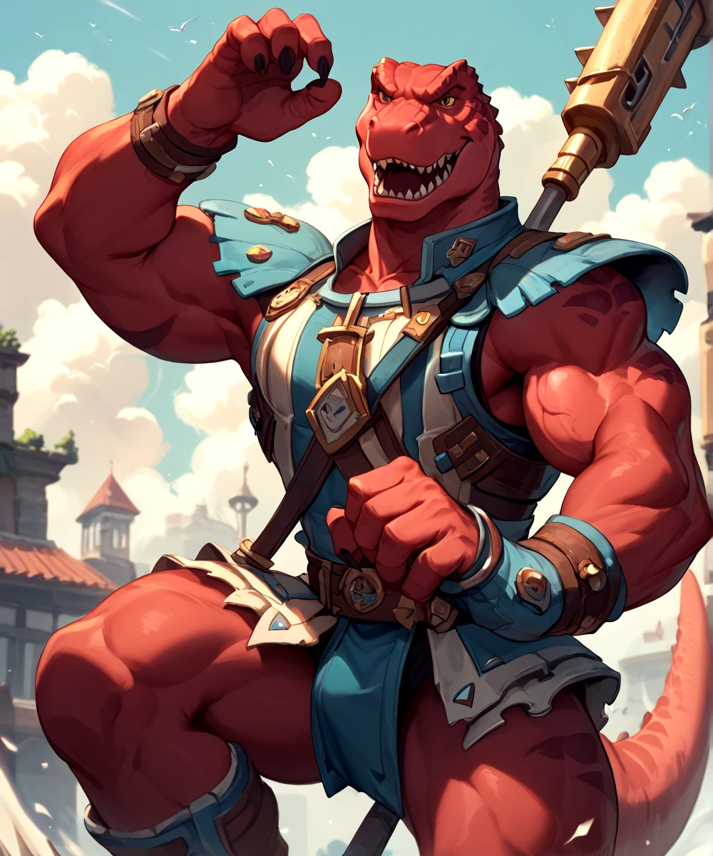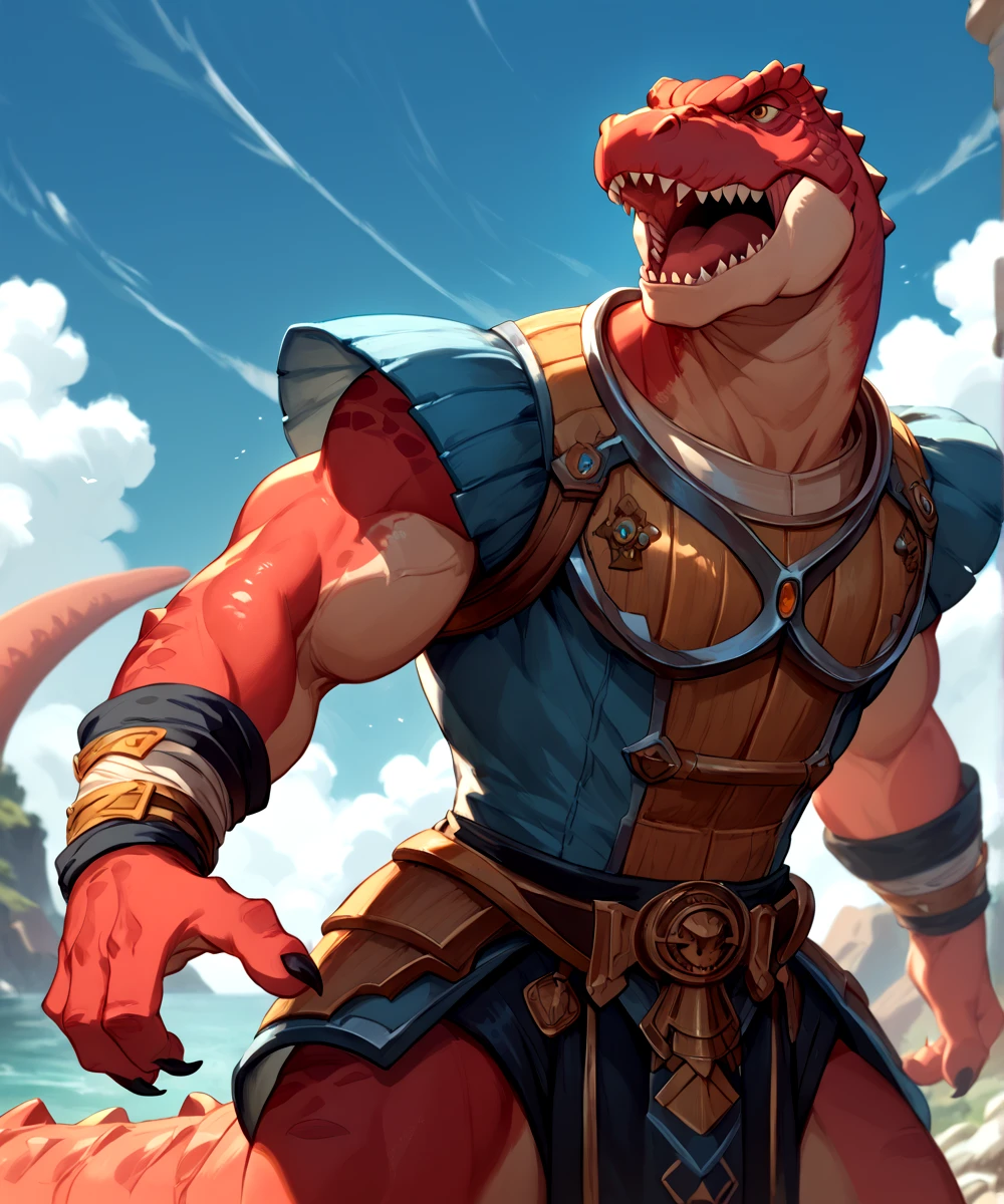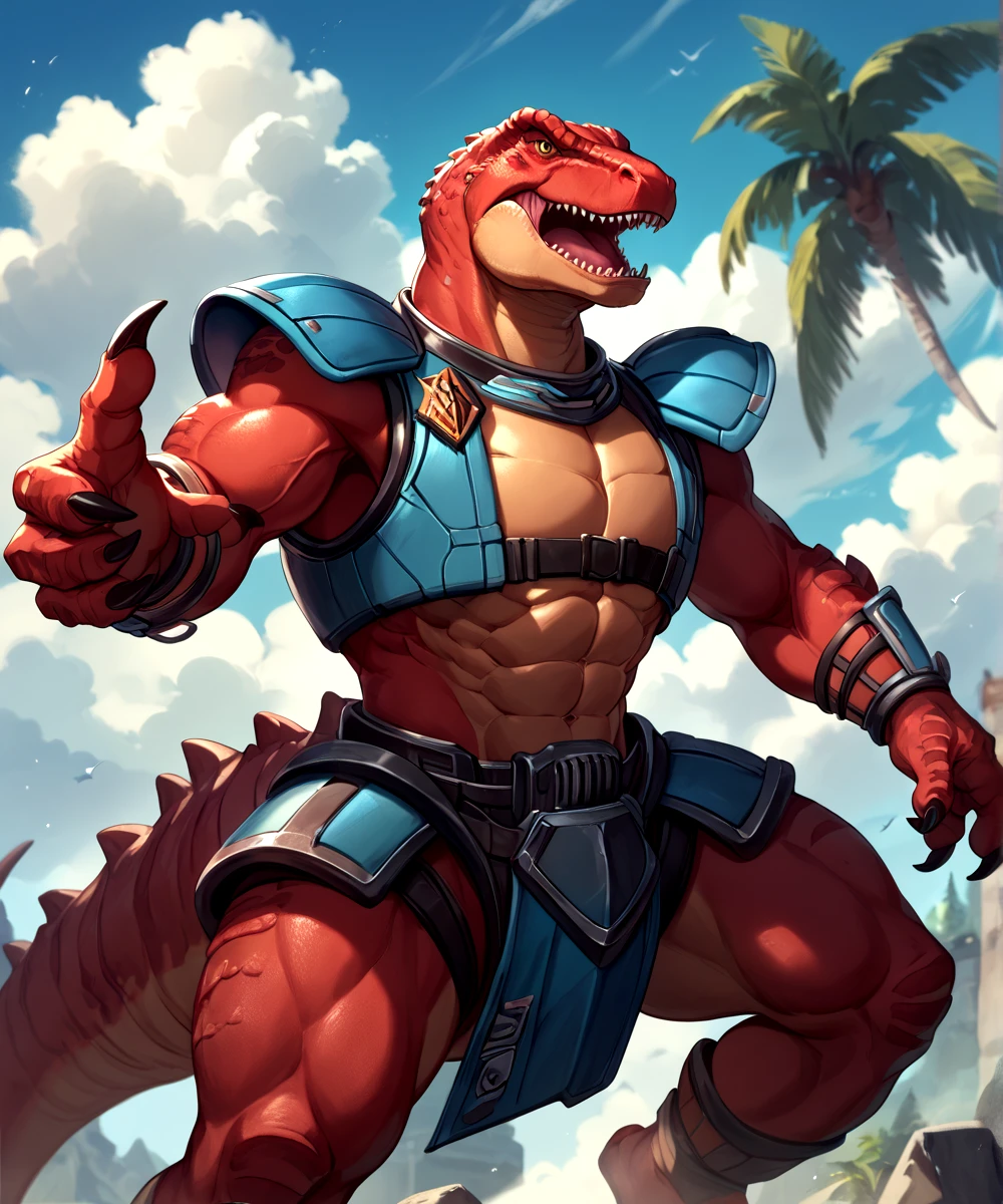 PROMPTS for this model are Genghis Rex, Dinosaucers, red skin, brown eyes, muscular, tyrannosaurus rex, trex, and dinosaur.