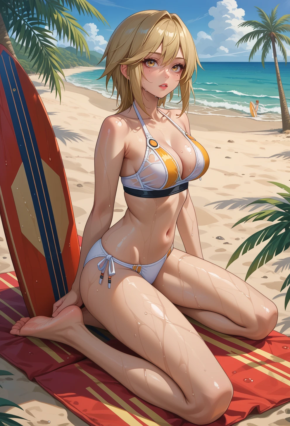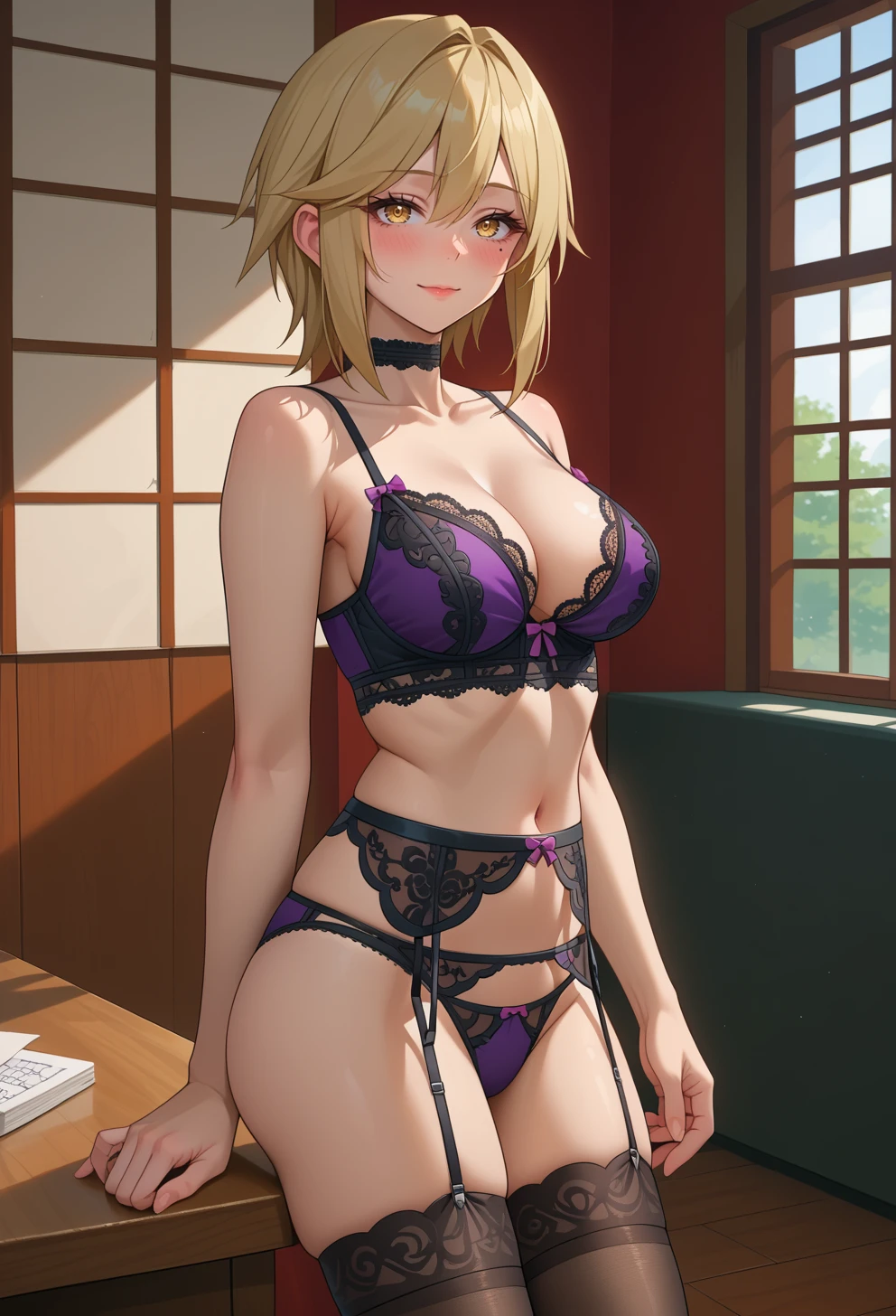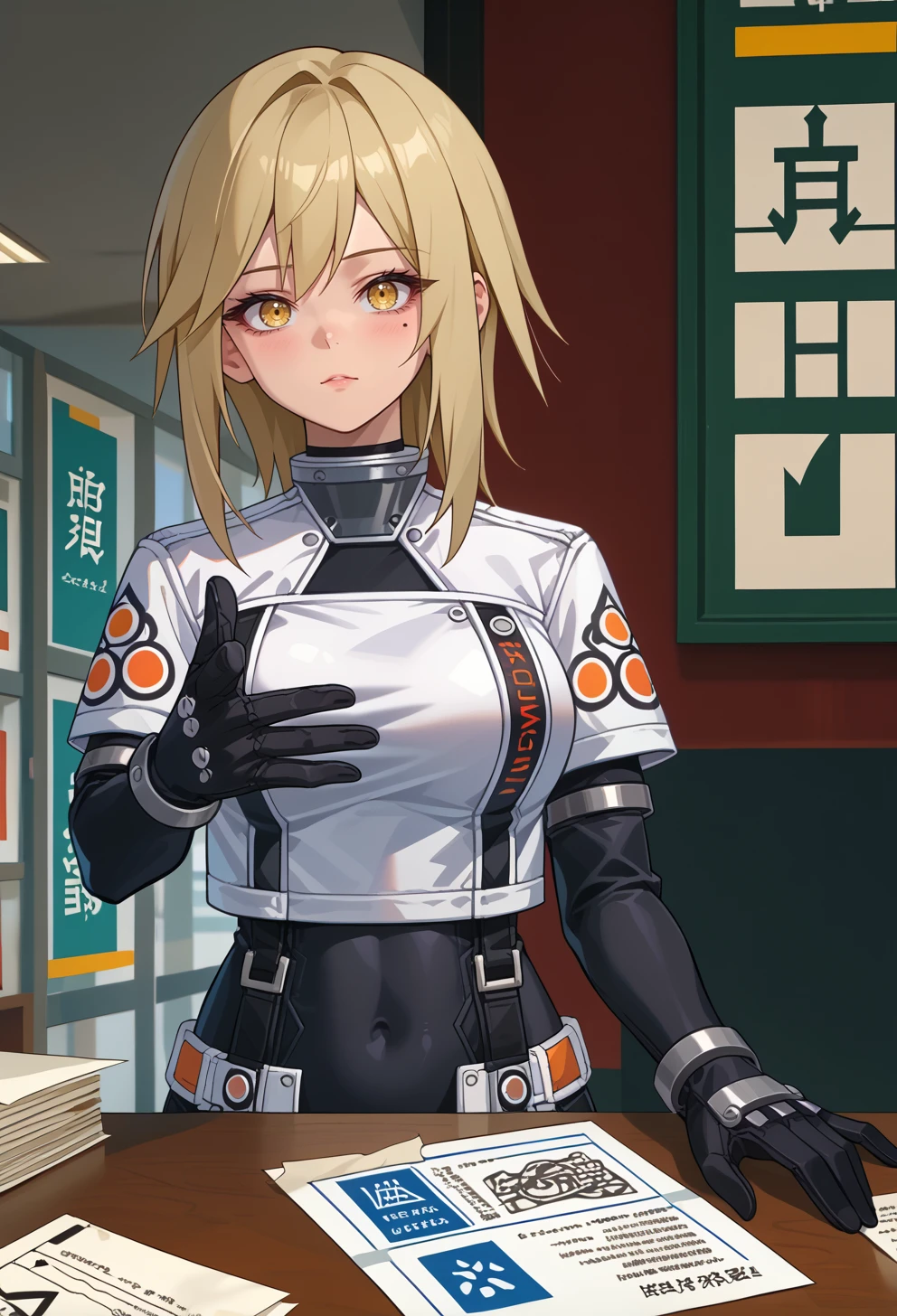yellow eyes, blonde hair, medium hair, sidelocks, mole under eye,Outfit: