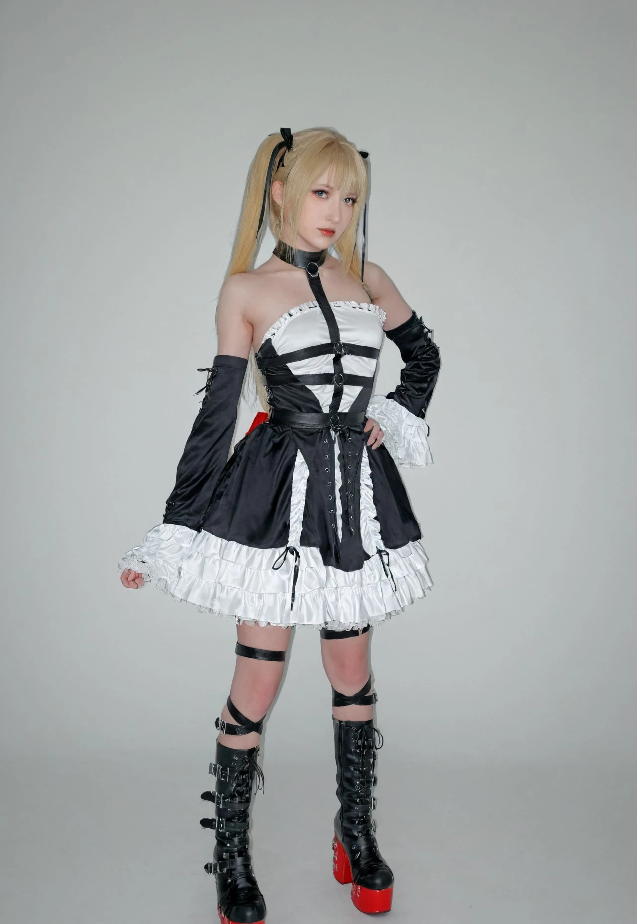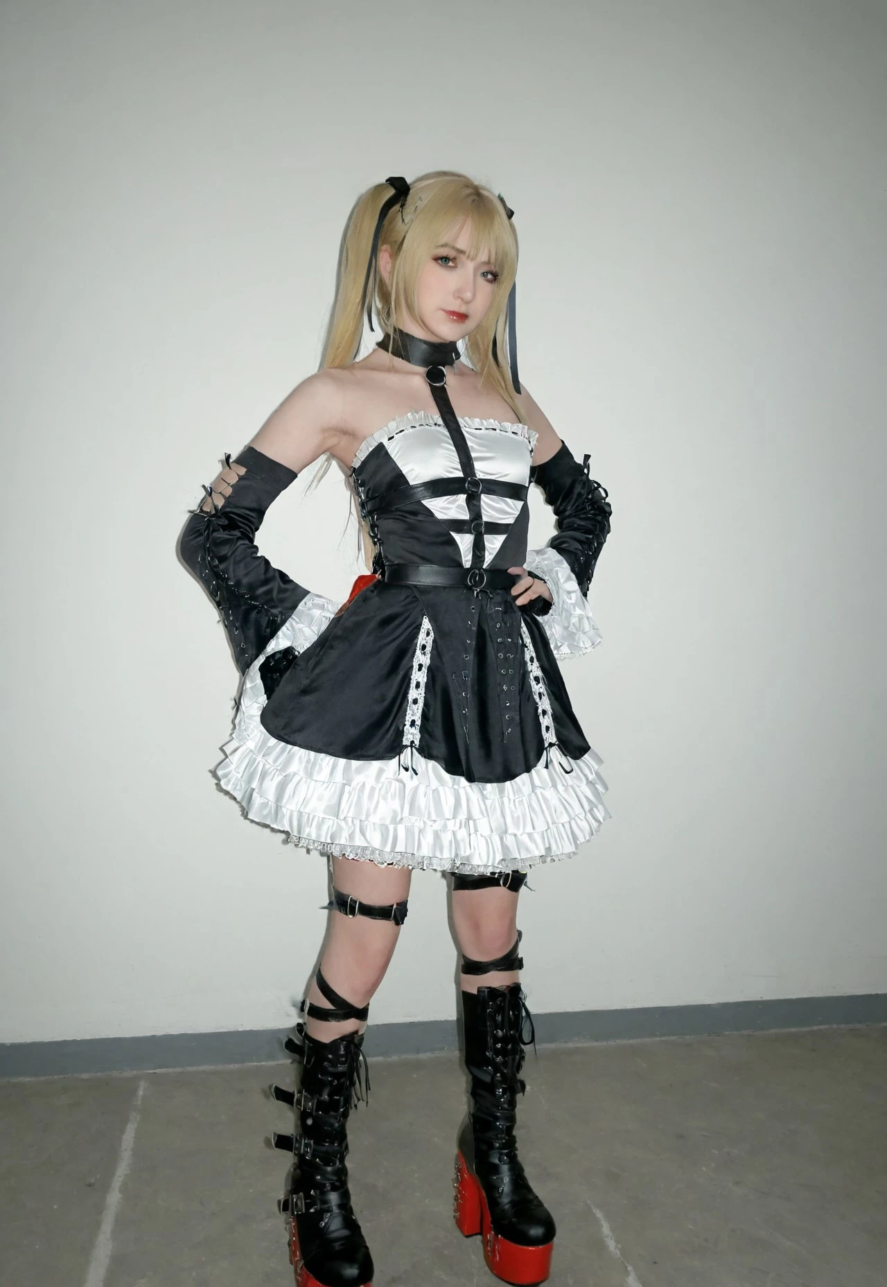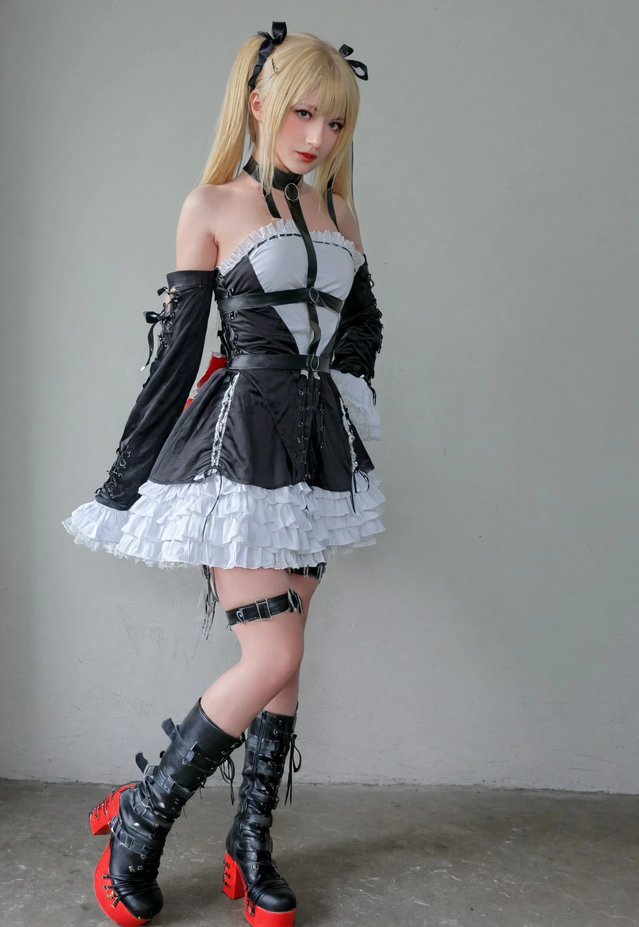 1girl, solo, twintails, blonde hair, boots, platform footware, ribbon, dress, frills, hair ribbon, bare shoulder, thigh straps, detatched sleeves, gothic dress, collar