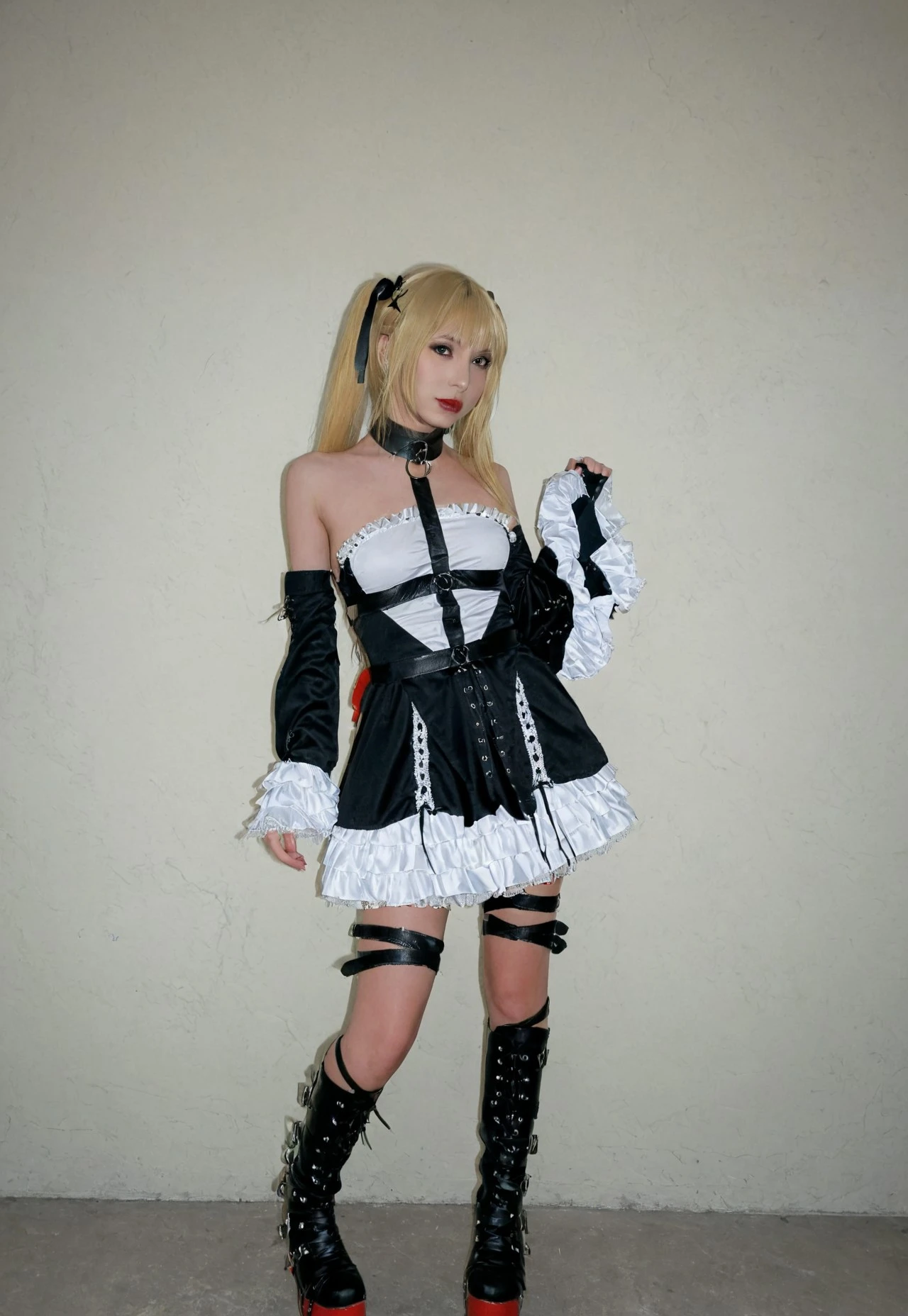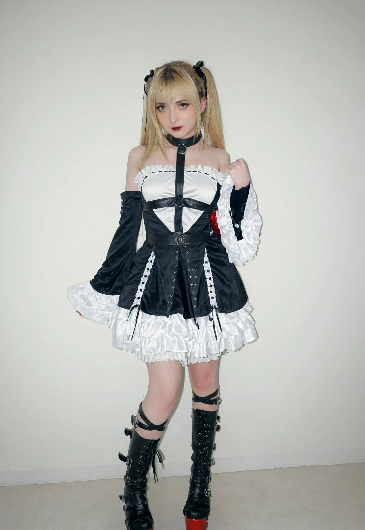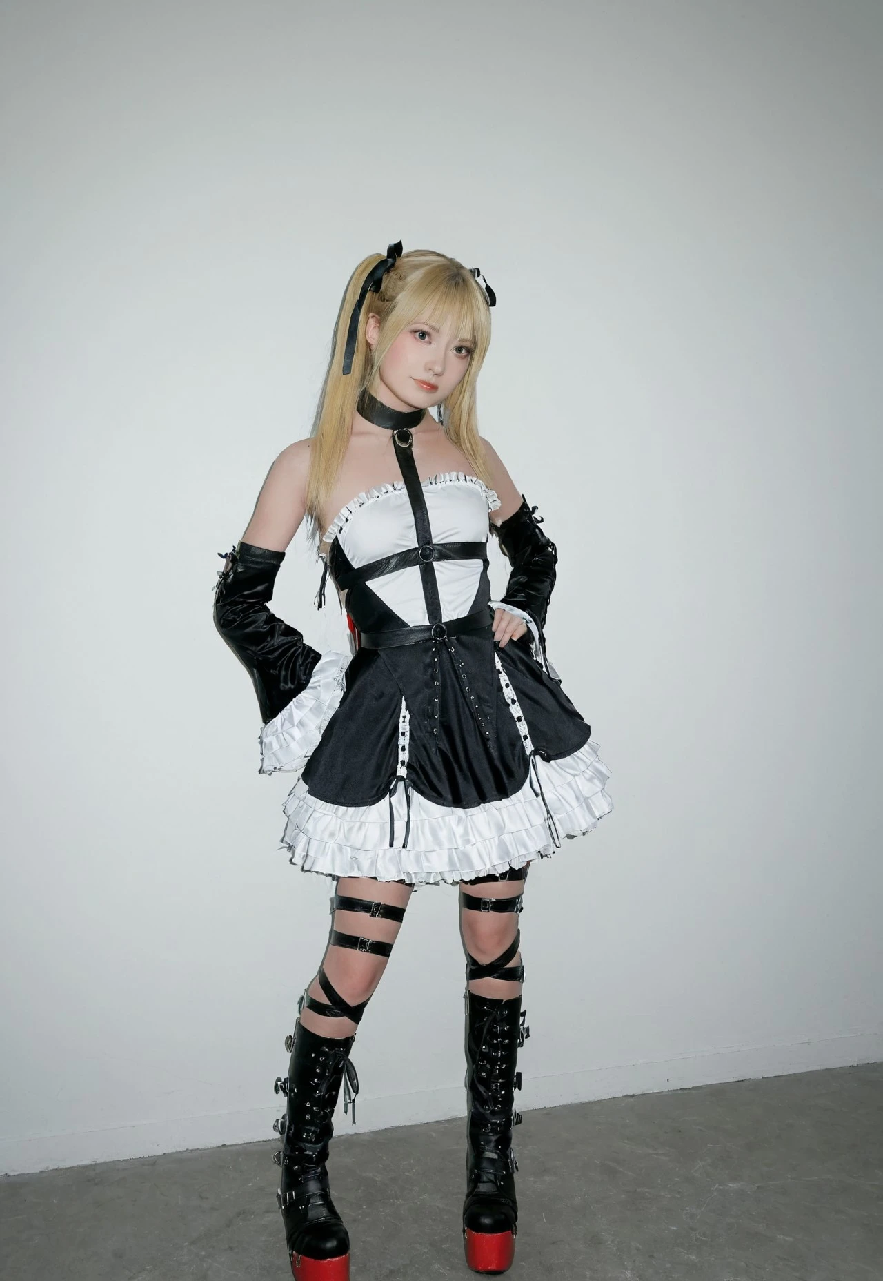 1girl, solo, twintails, blonde hair, boots, platform footware, ribbon, dress, frills, hair ribbon, bare shoulder, thigh straps, detatched sleeves, gothic dress, collar