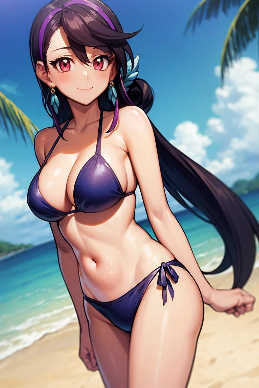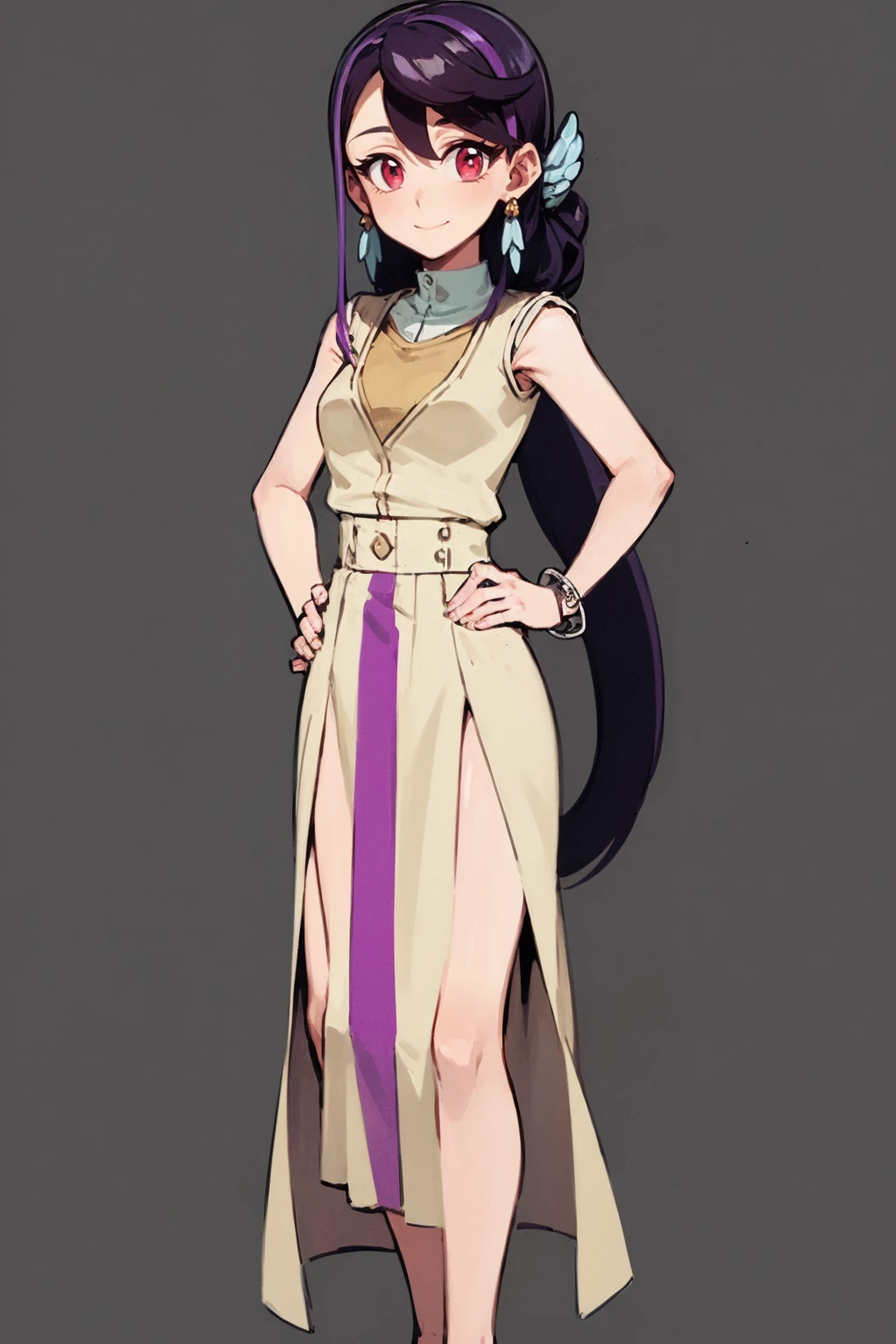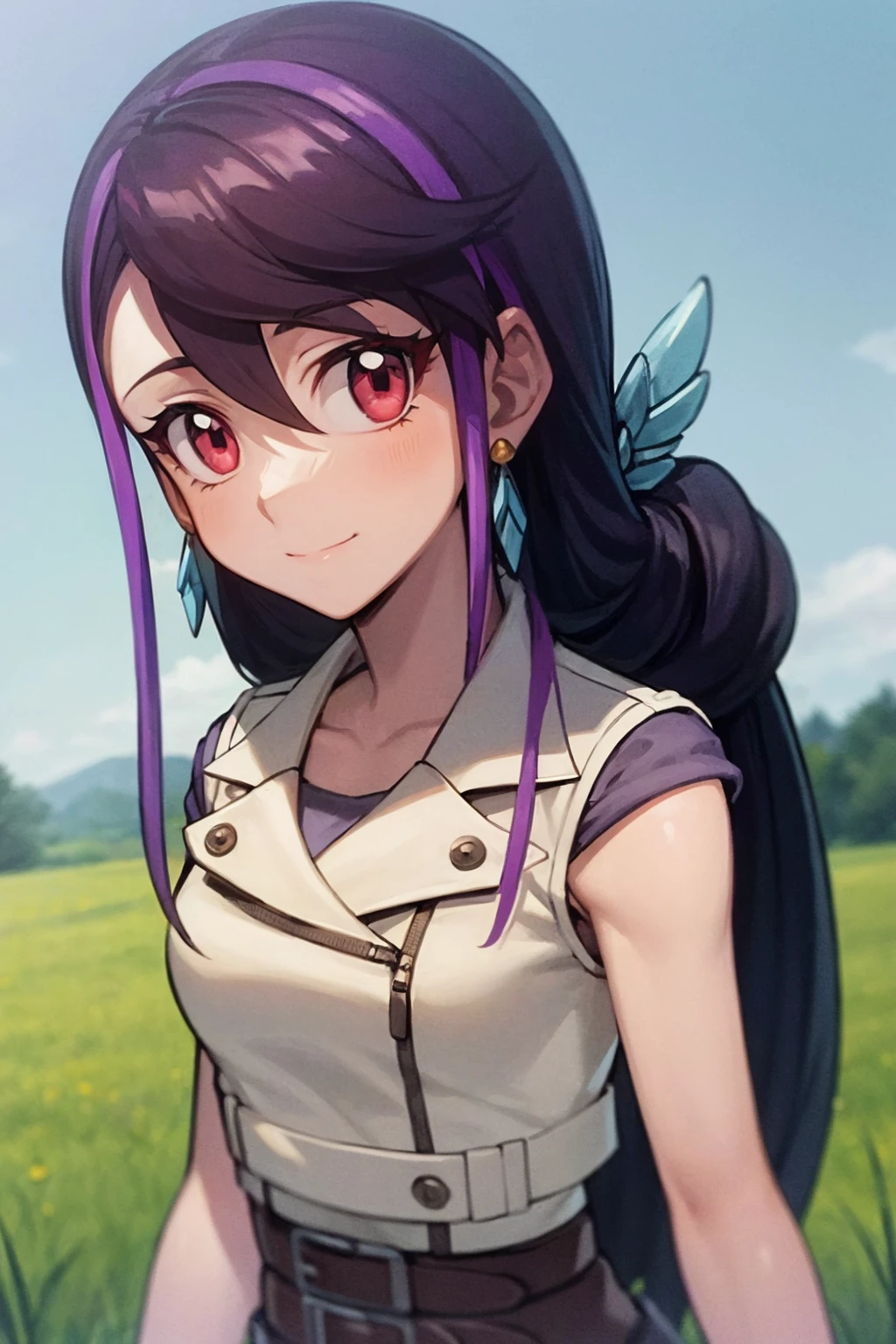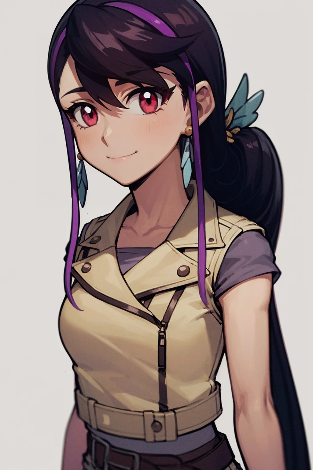 1girl, luluobsidian, purple hair, long hair, two-tone hair, pink eyes, hair ornament, earrings, low ponytail