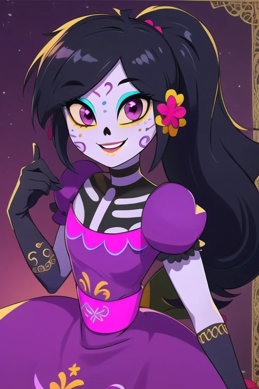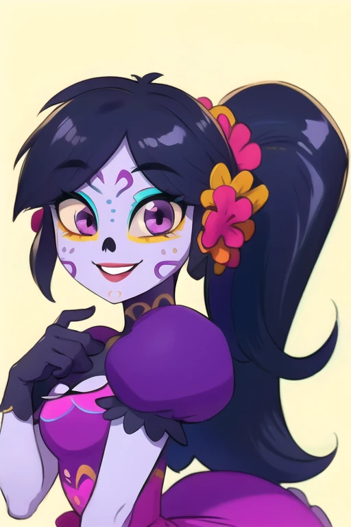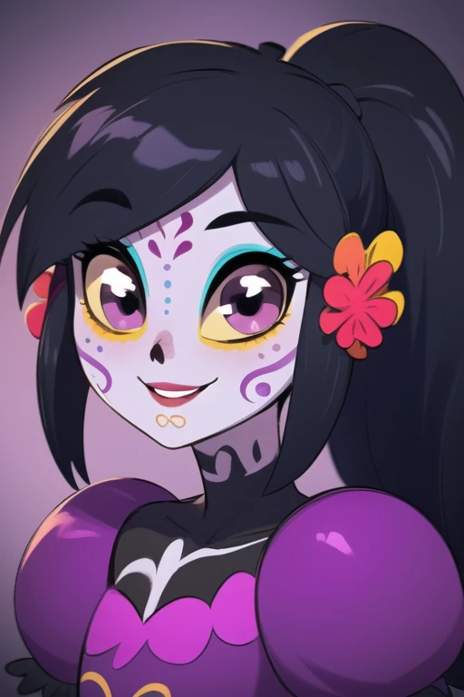 Catalina la catrina, black hair, ponytail, yellow sclera, hair ornament, hair flower, purple eyes, makeup, facial mark, bodypaint