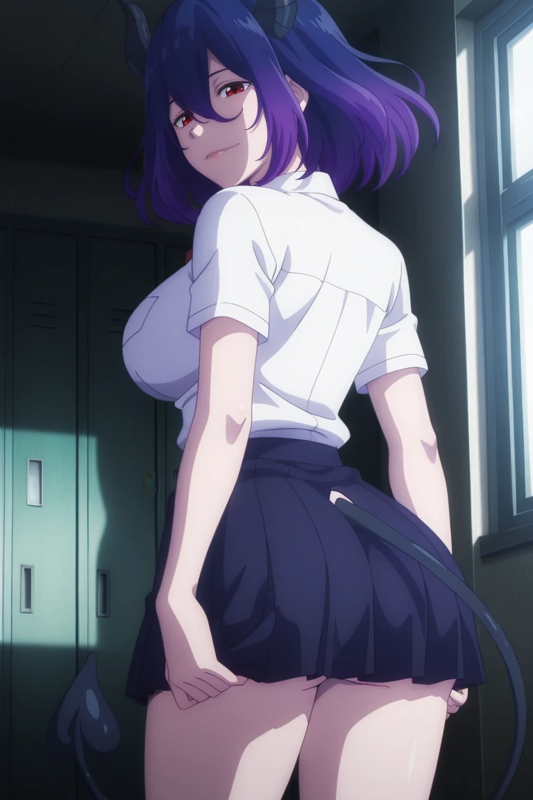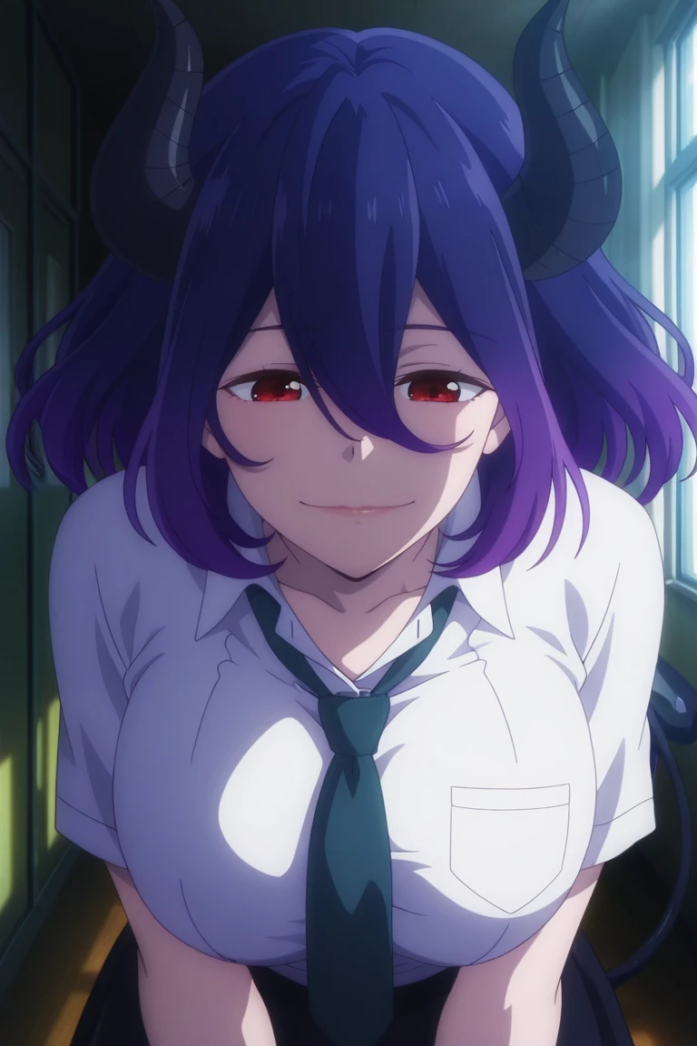 1girl, vermeil, short, hair, hair between eyes, red eyes, blue hair, two toned hair, purple hair, glossy lips, horns demon horns, demon tail, large breasts