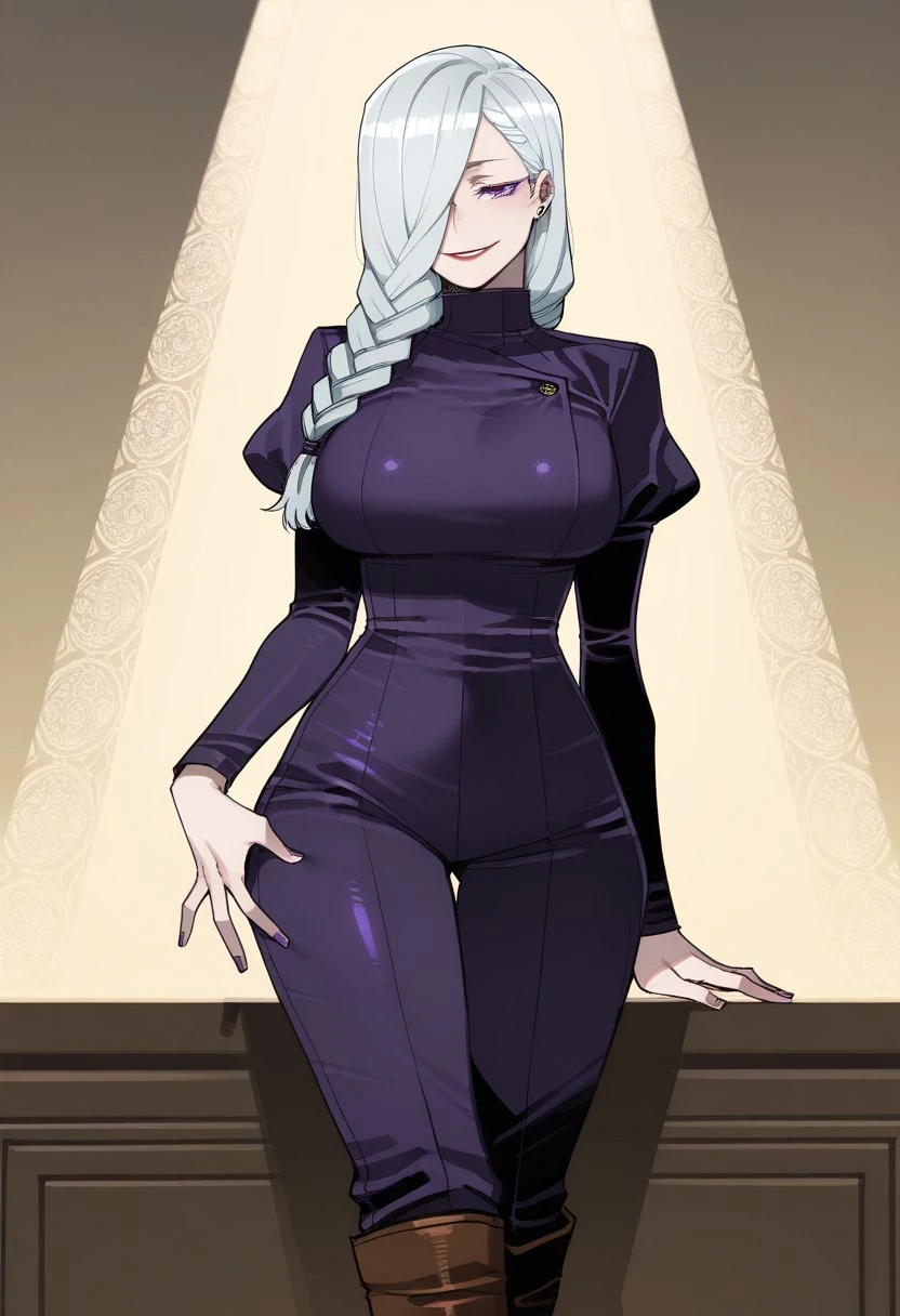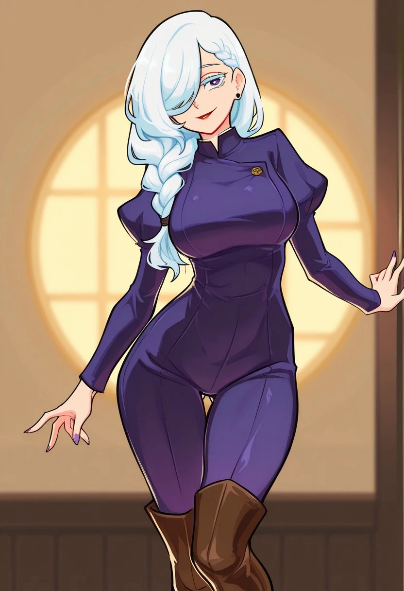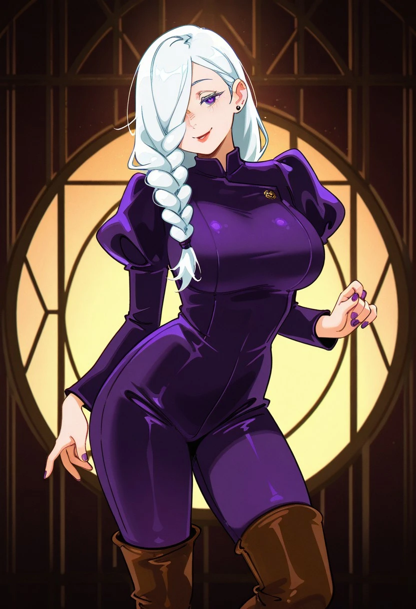 Mei Mei from Jujutsu Kaisen, long hair, bright white hair, braided ponytail, braided bangs, hair tie, hair over one eye, one eye covered, colored eyelashes, purple eyes, red lips, ear piercing, purple nails, large , long sleeves, juliet sleeves, dark purple jumpsuit, brown footwear, knee boots,