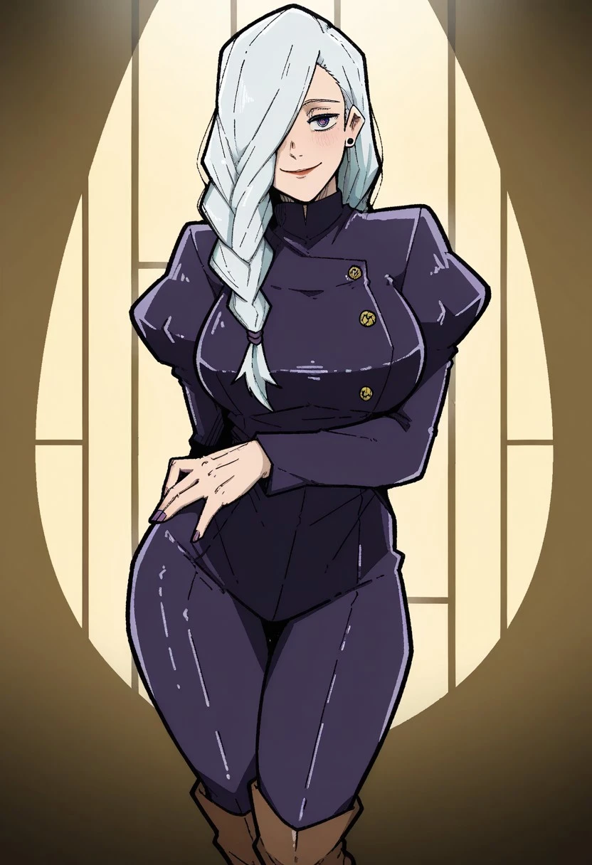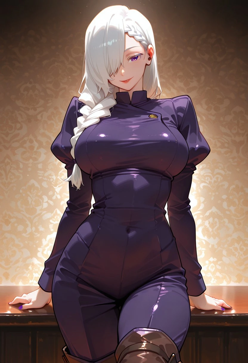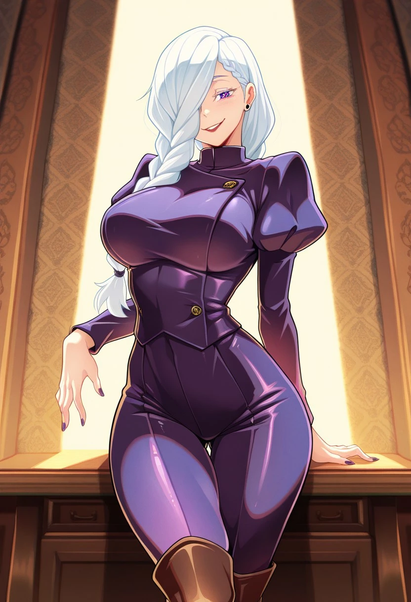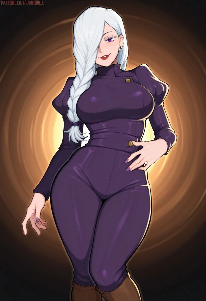 Mei Mei from Jujutsu Kaisen, long hair, bright white hair, braided ponytail, braided bangs, hair tie, hair over one eye, one eye covered, colored eyelashes, purple eyes, red lips, ear piercing, purple nails, large , long sleeves, juliet sleeves, dark purple jumpsuit, brown footwear, knee boots,
