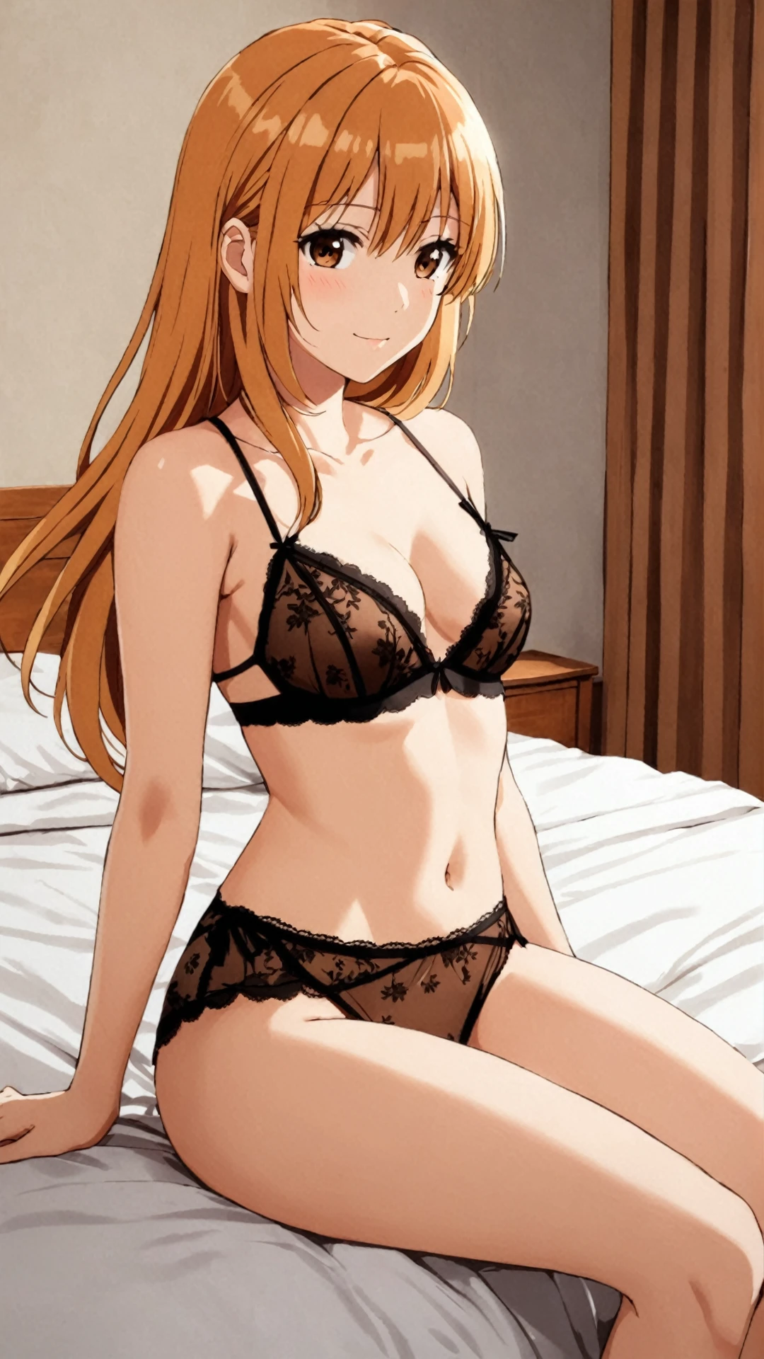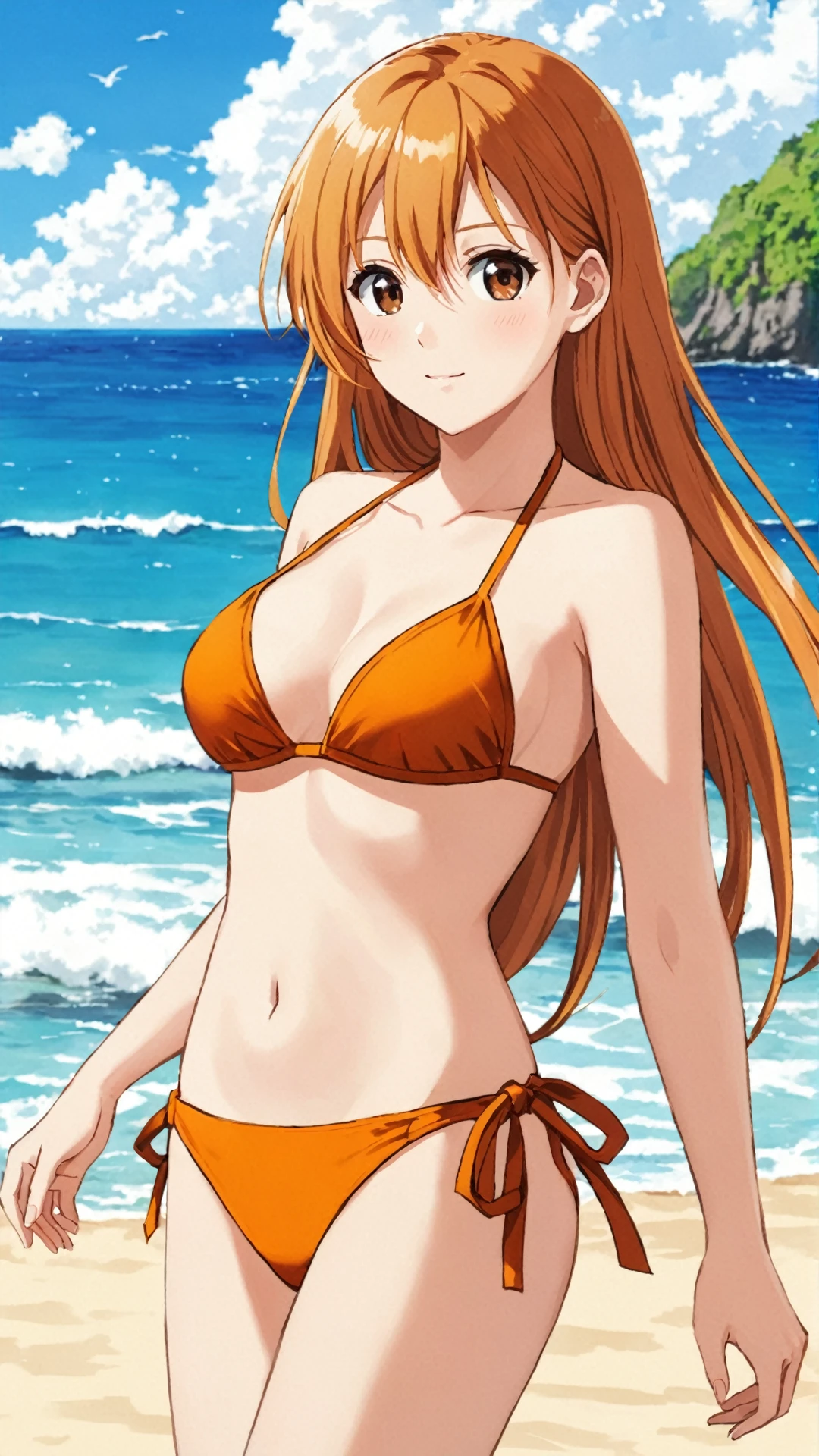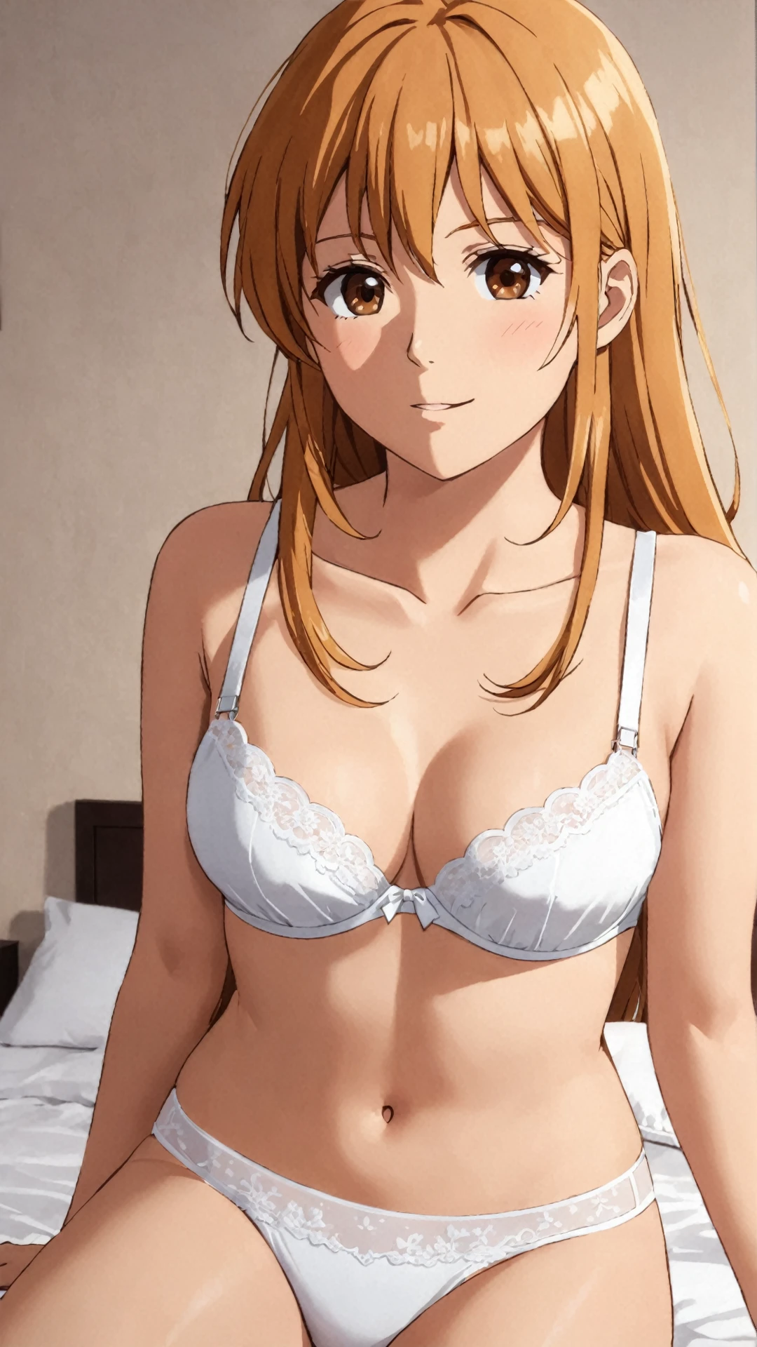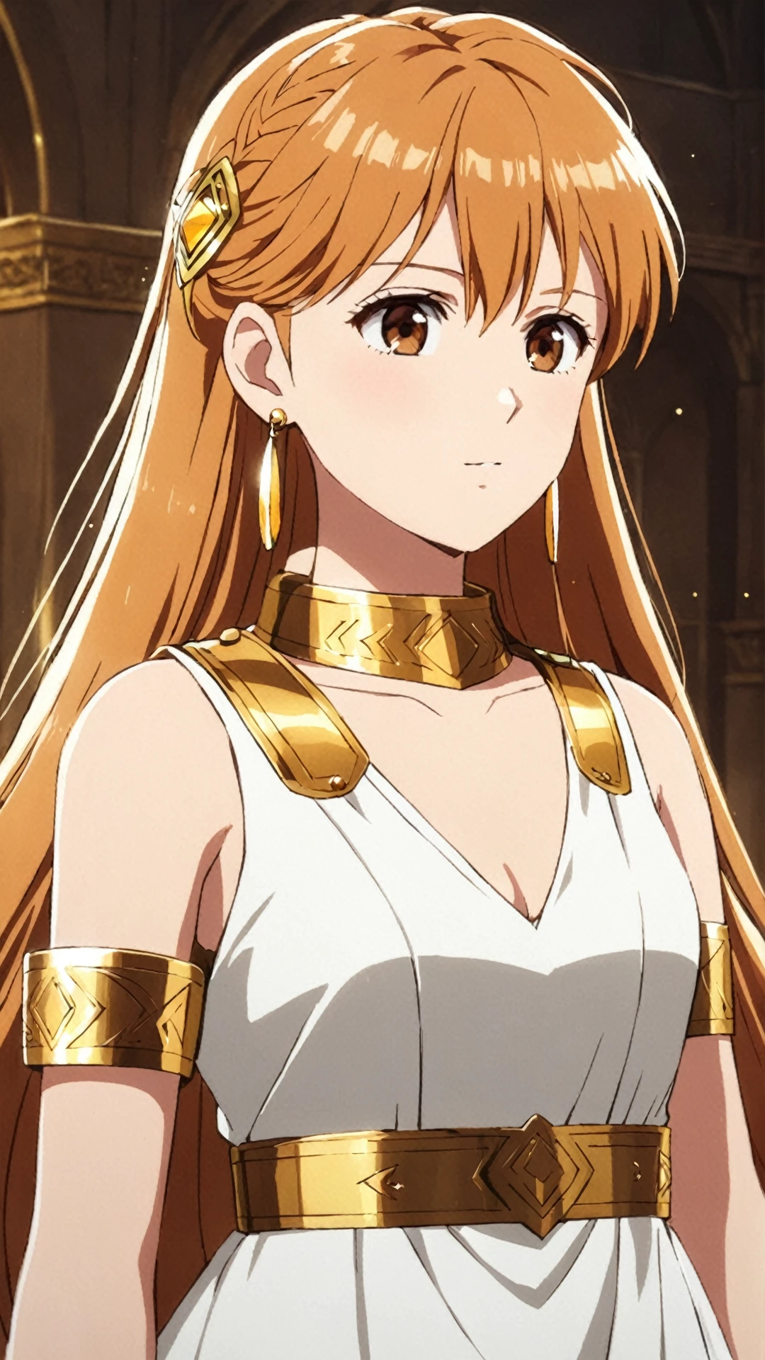 Leona, ginger blonde hair, long hair, brown eyes, hair ornament, earrings, white dress, golden collar, golden armband,