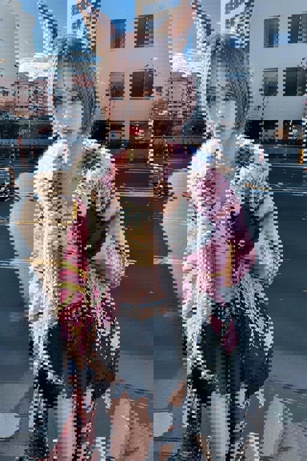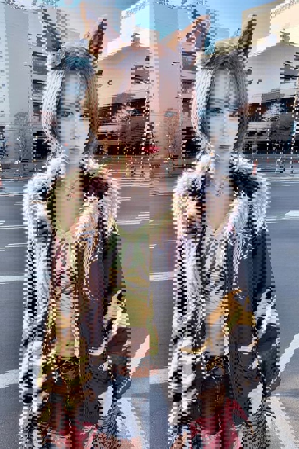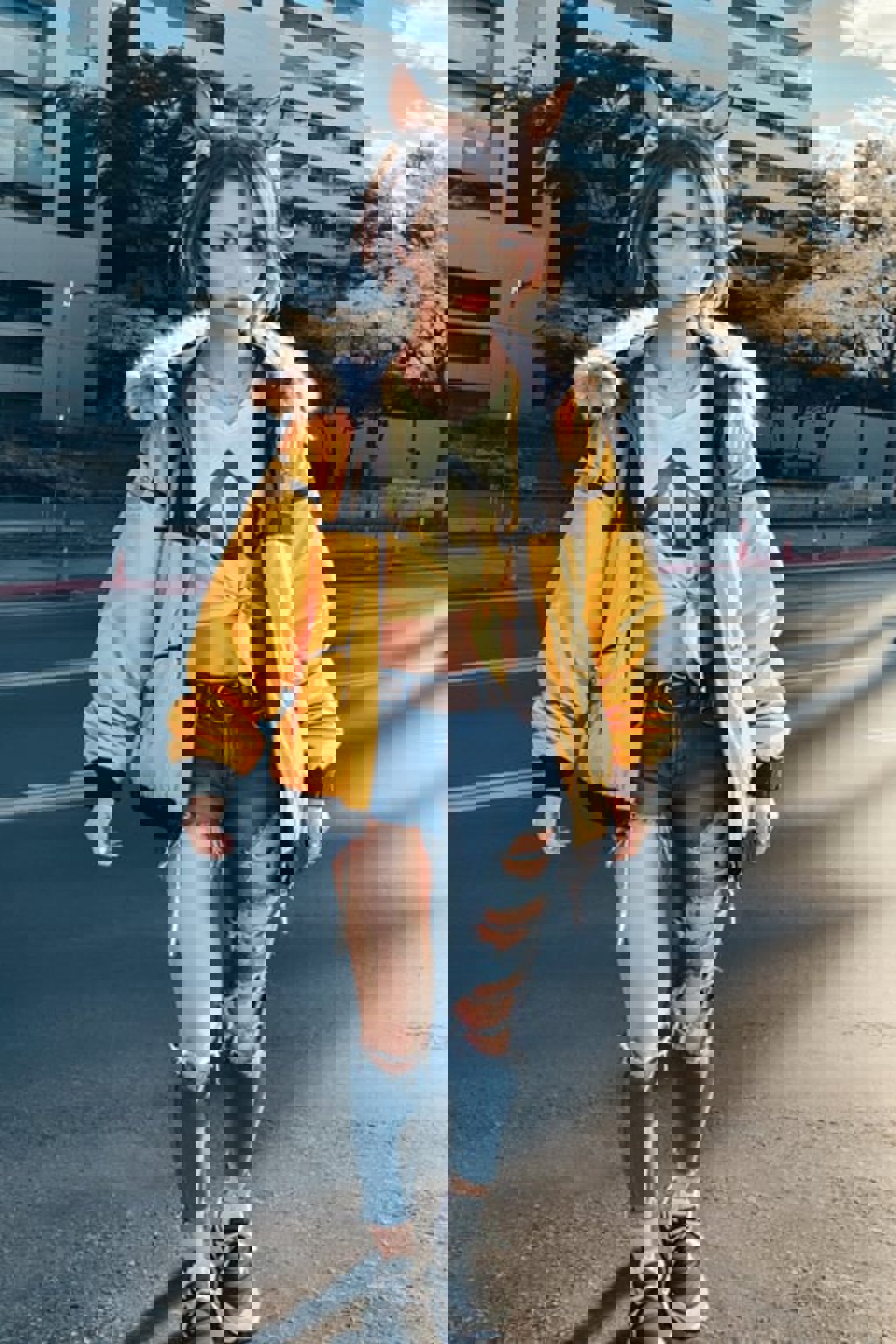 torn jeans, (asymmetrical clothes:1.1), belt, fur-trimmed jacket, jacket around waist, clothes around waist, midriff, long sleeves, tied shirt, open clothes, yellow shirt, mismatched footwear, asymmetrical footwear