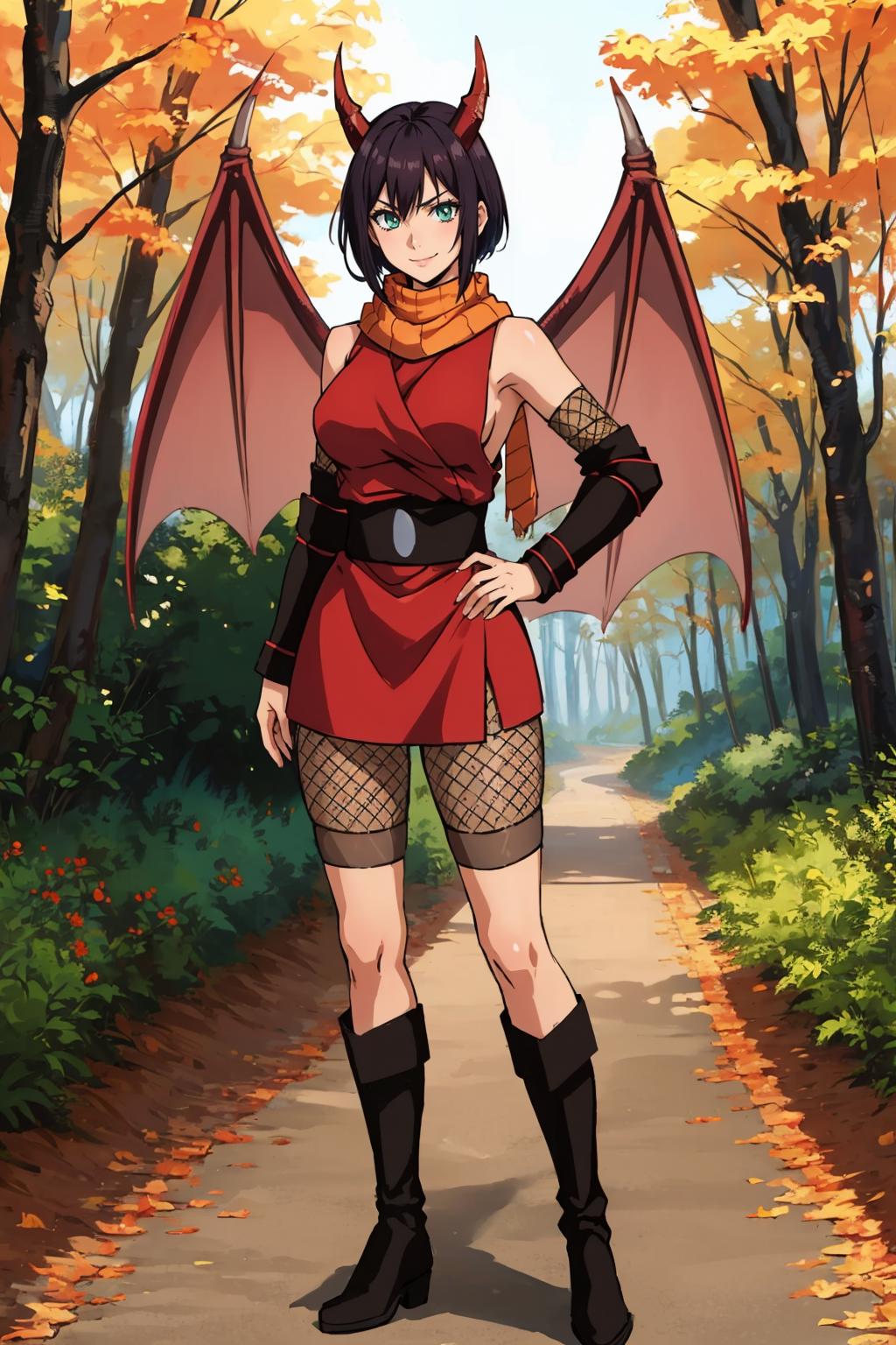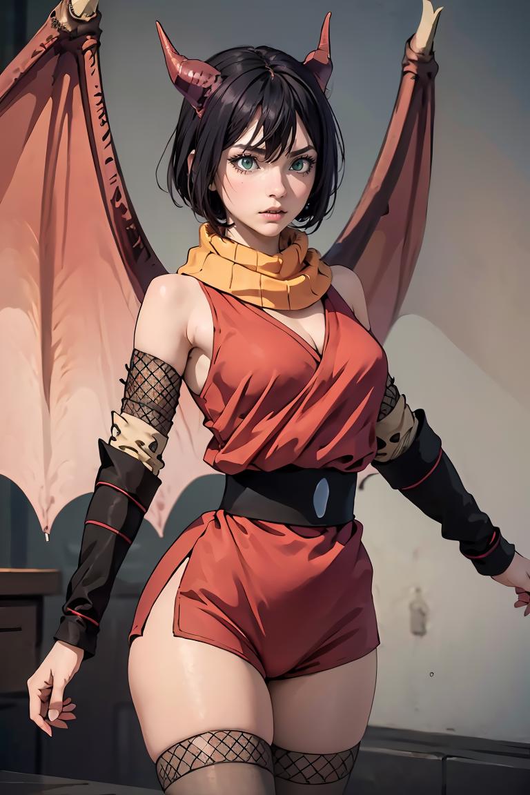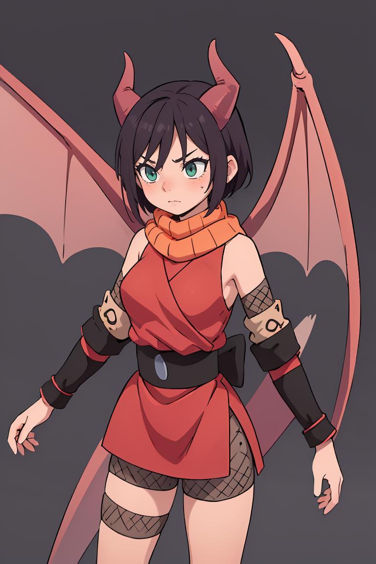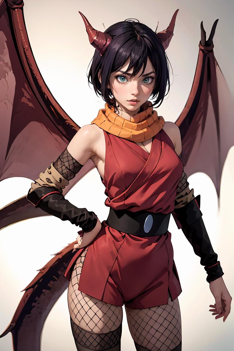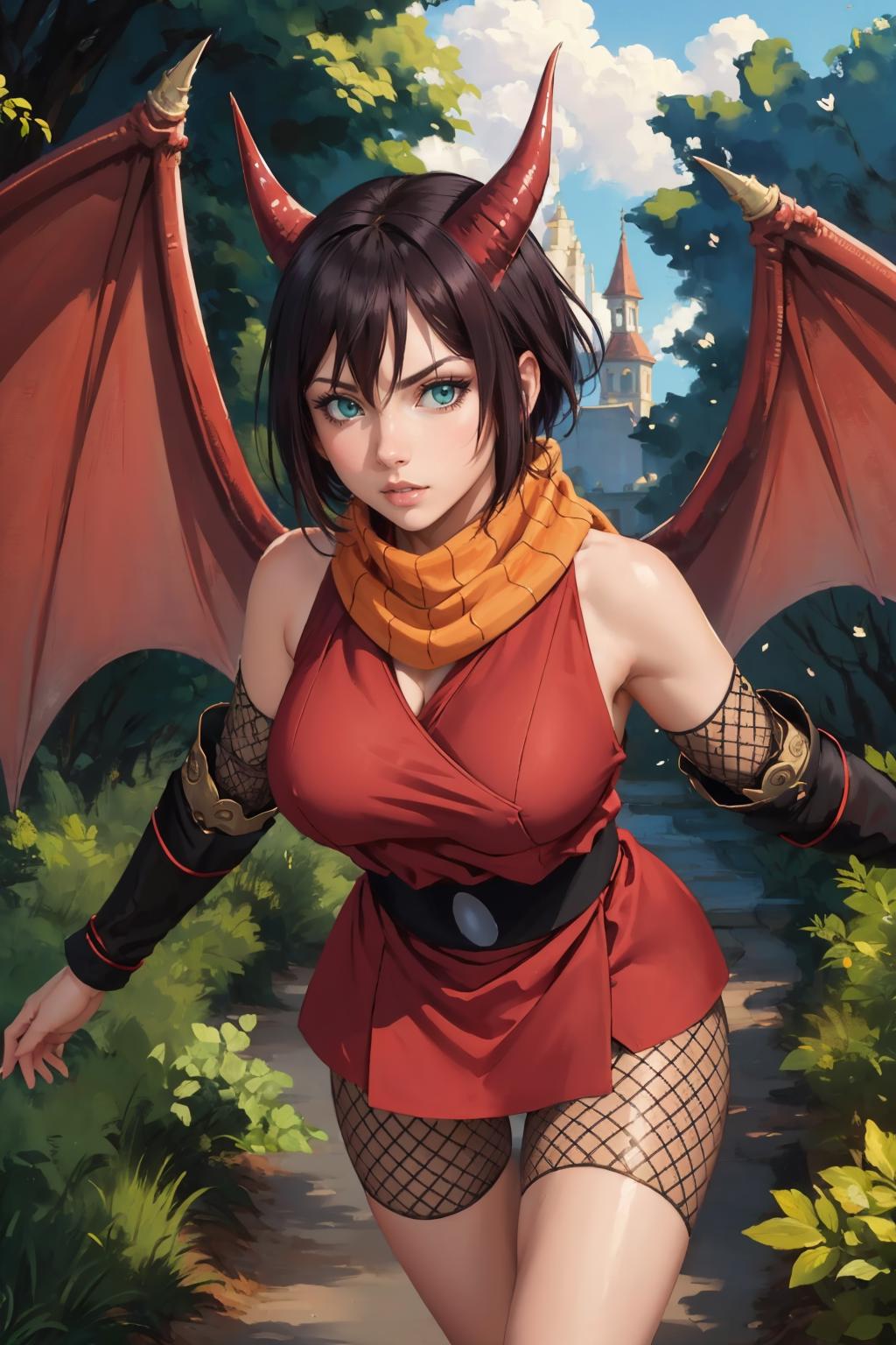Add "orange scarf, red dress, sash, vambraces, fishnet shorts" for her typical look.