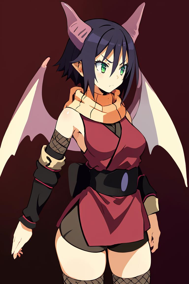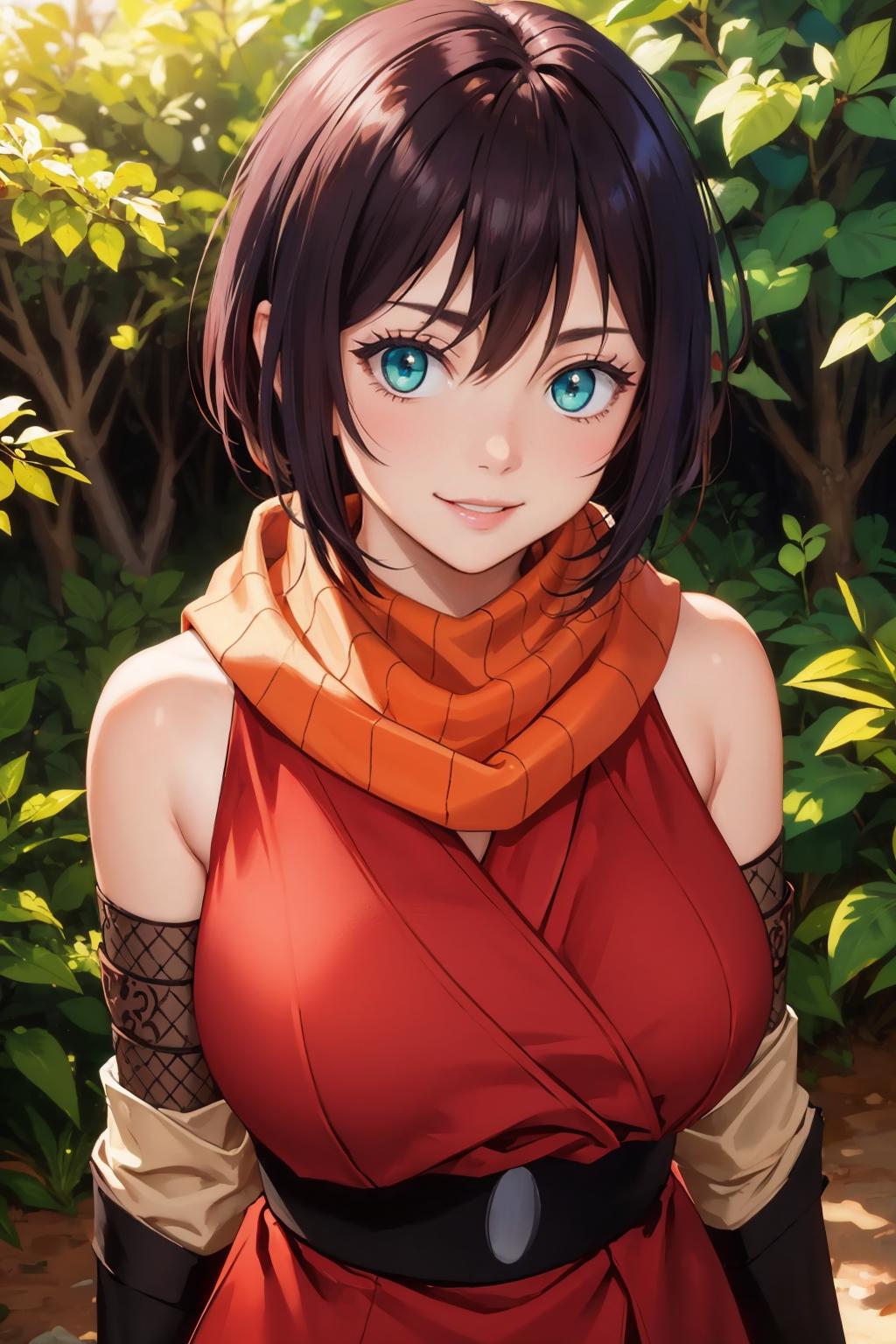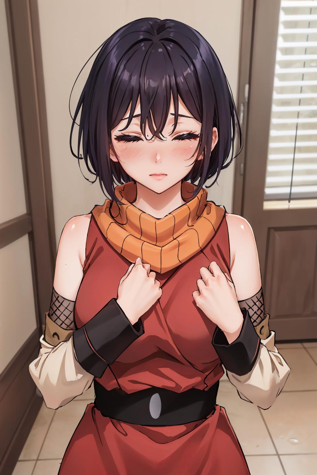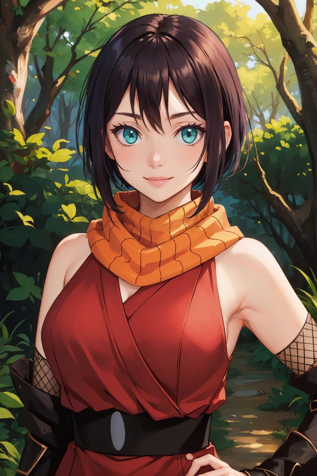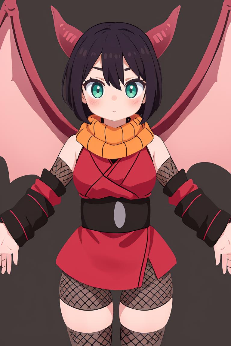 Add "orange scarf, red dress, sash, vambraces, fishnet shorts" for her typical look.