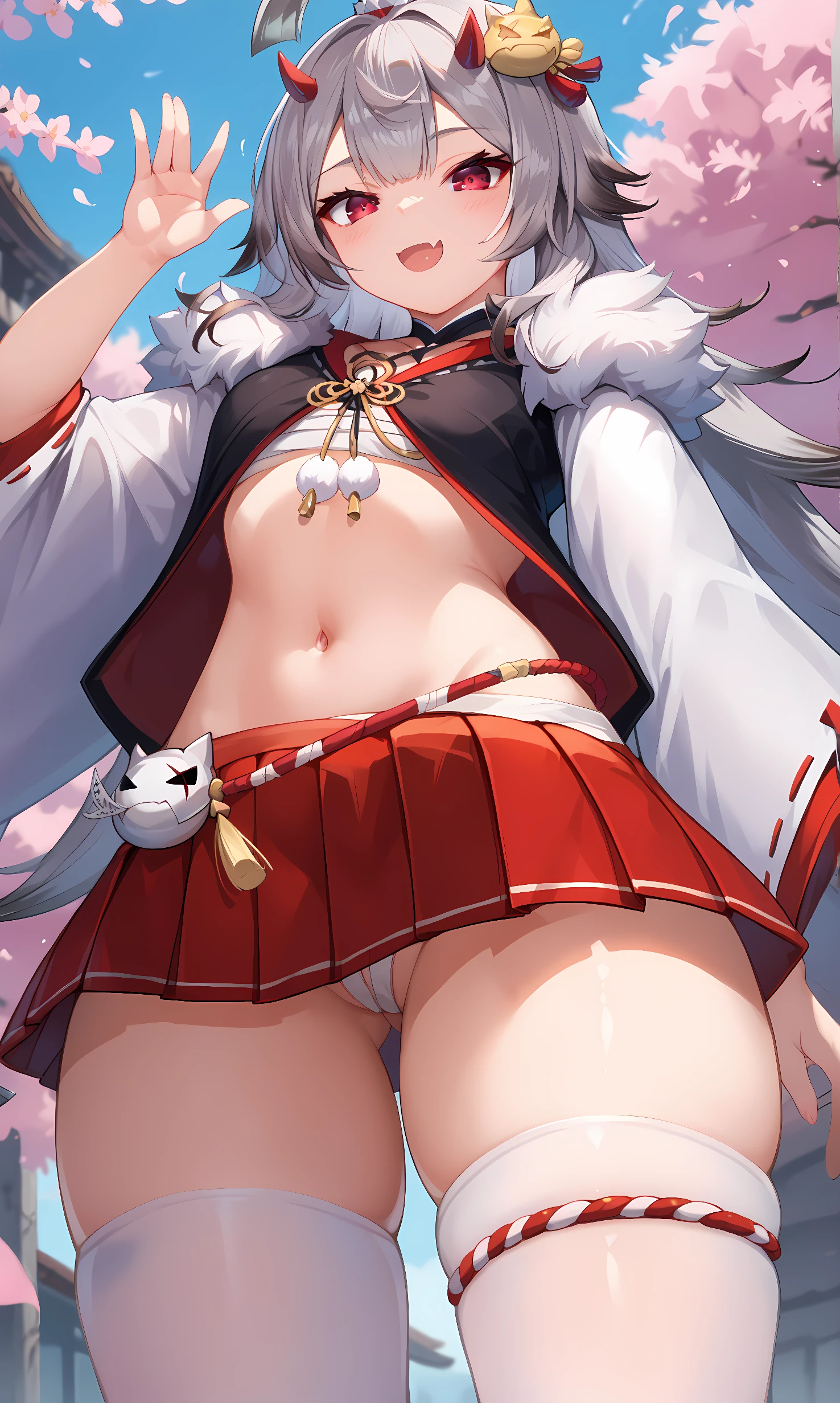 japanese clothes, wide sleeves, long sleeves, ribbon-trimmed sleeves, wide sleeves, fur trim, sarashi, red skirt, miniskirt, pleated skirt, navel, white thighhighs, choker, thigh strap, black jacket, (white sleeves:1.3)
