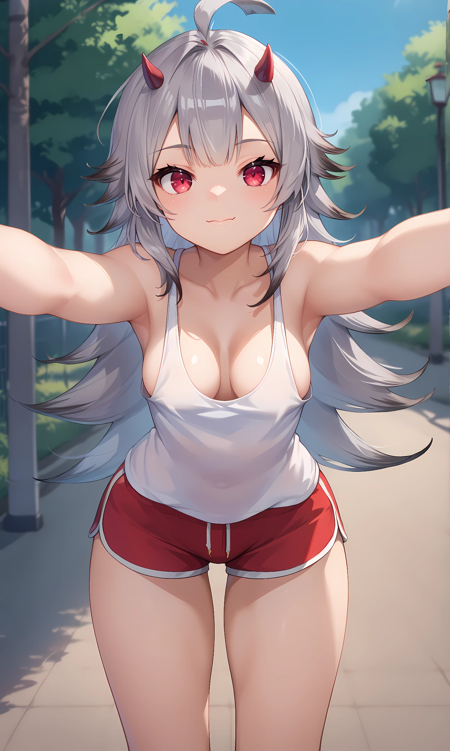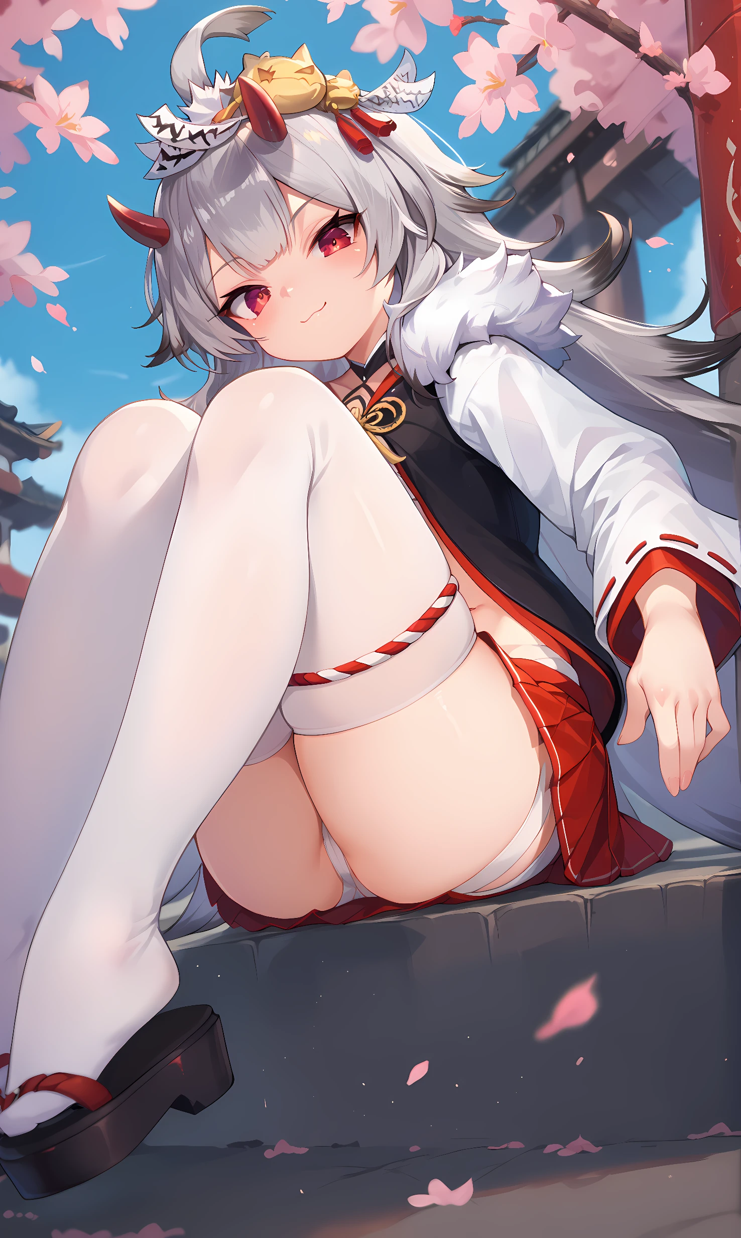 hibiki, red eyes, grey hair, gradient hair, long hair, oni horns, tiny horns, ahoge, hair ornament