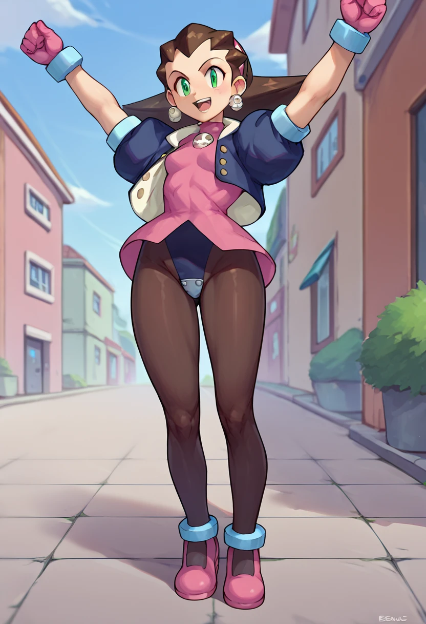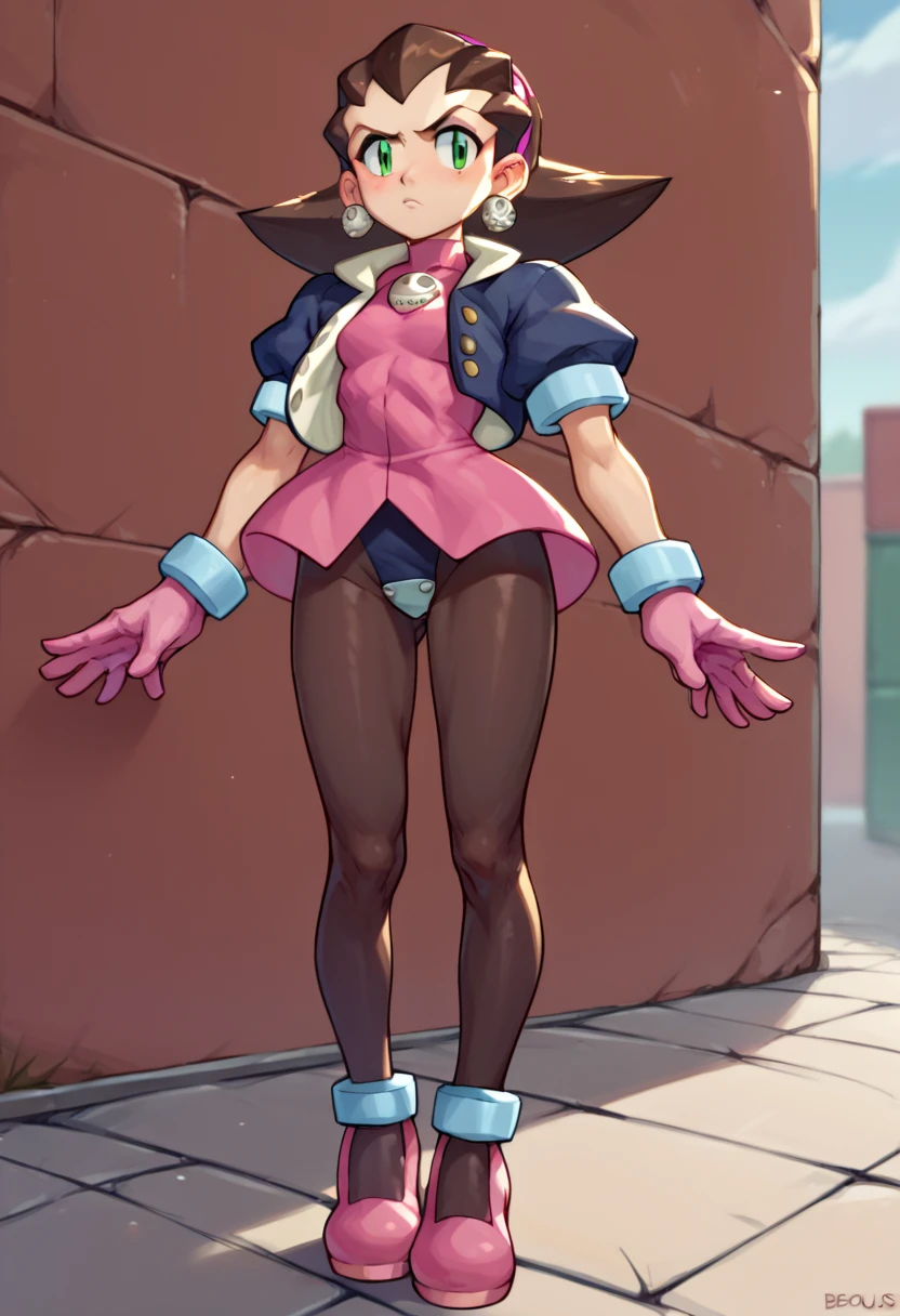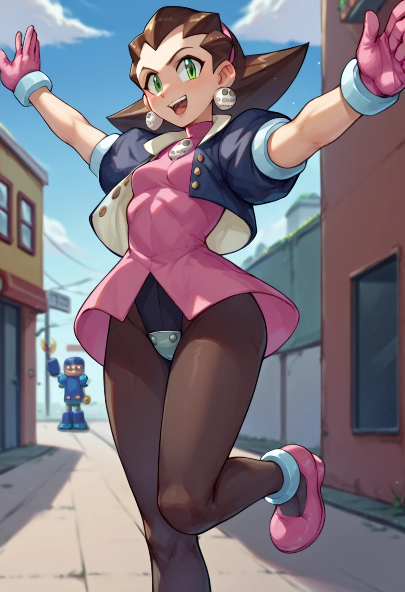 Tron Bonne (Mega man), short hair, brown hair, jewelry, green eyes, black pantyhose, earrings, open clothes, open jacket, puffy short sleeves, small jacket, cropped jacket, pink shoes, hair pulled back, pink gloves, pink hairband, crotch plate, pink t-shirt,