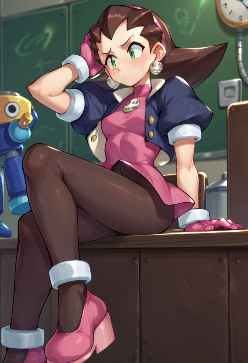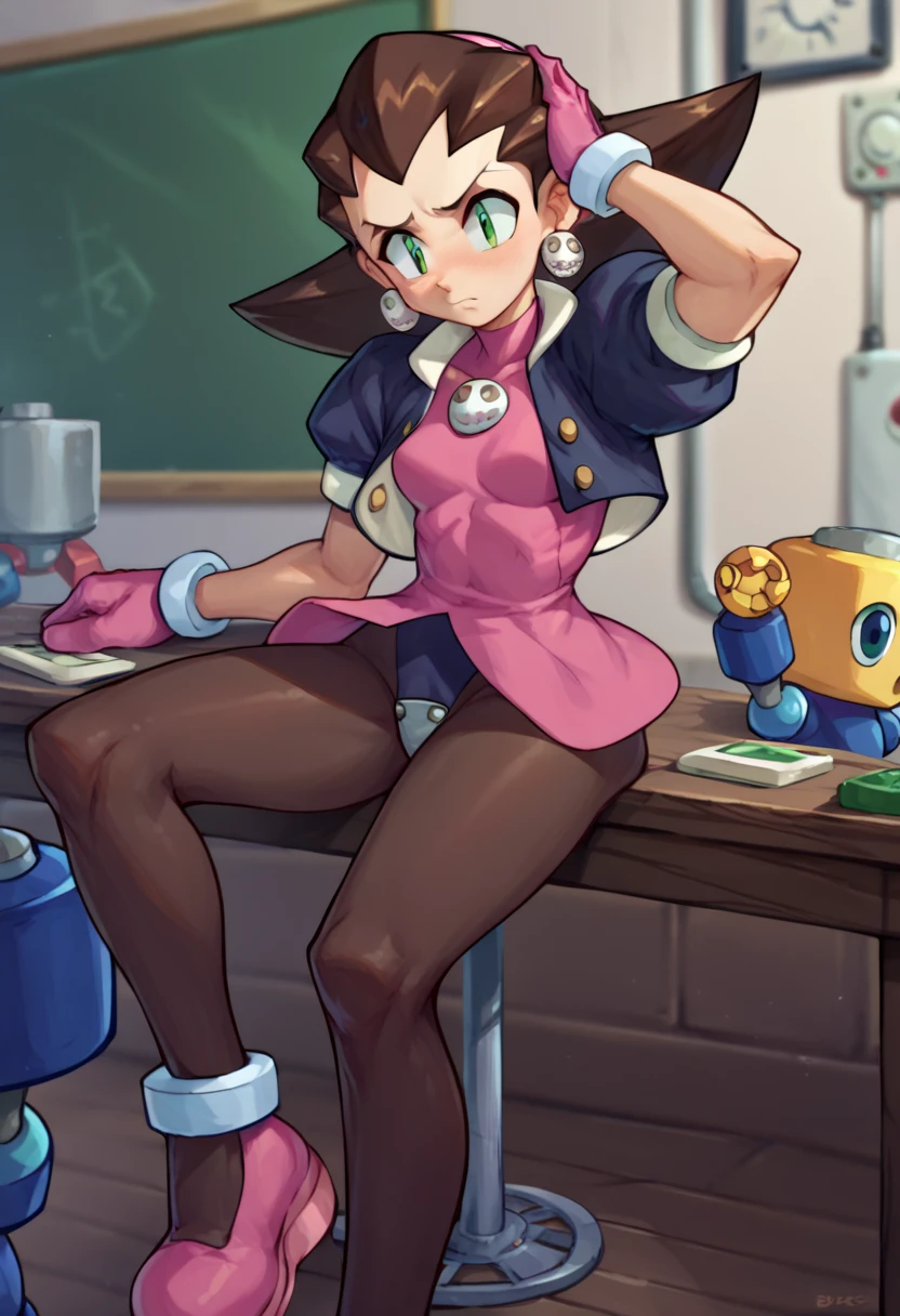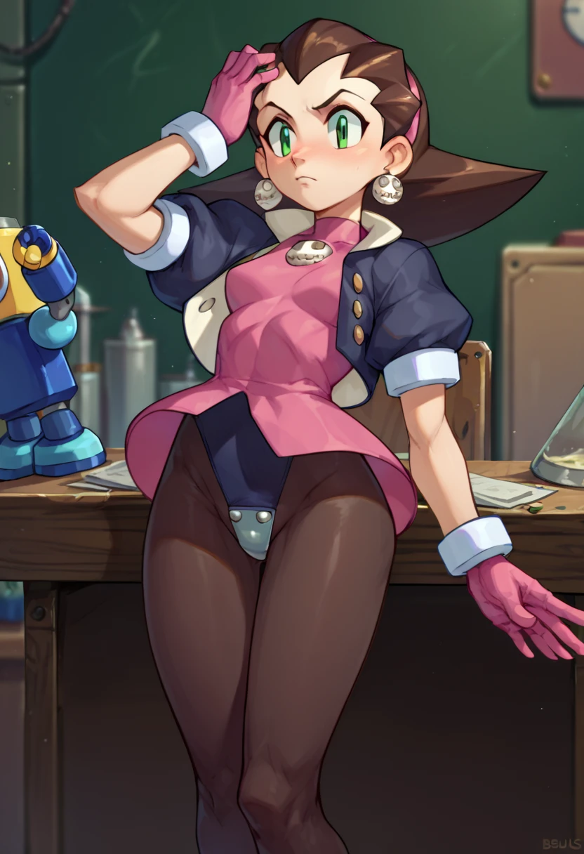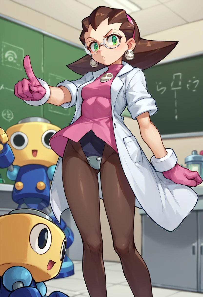 Tron Bonne (Mega man), green eyes, short hair, brown hair, jewelry, black pantyhose, earrings, open clothes, pink shoes, hair pulled back, pink gloves, pink hairband, crotch plate, pink t-shirt, lab coat, glasses,