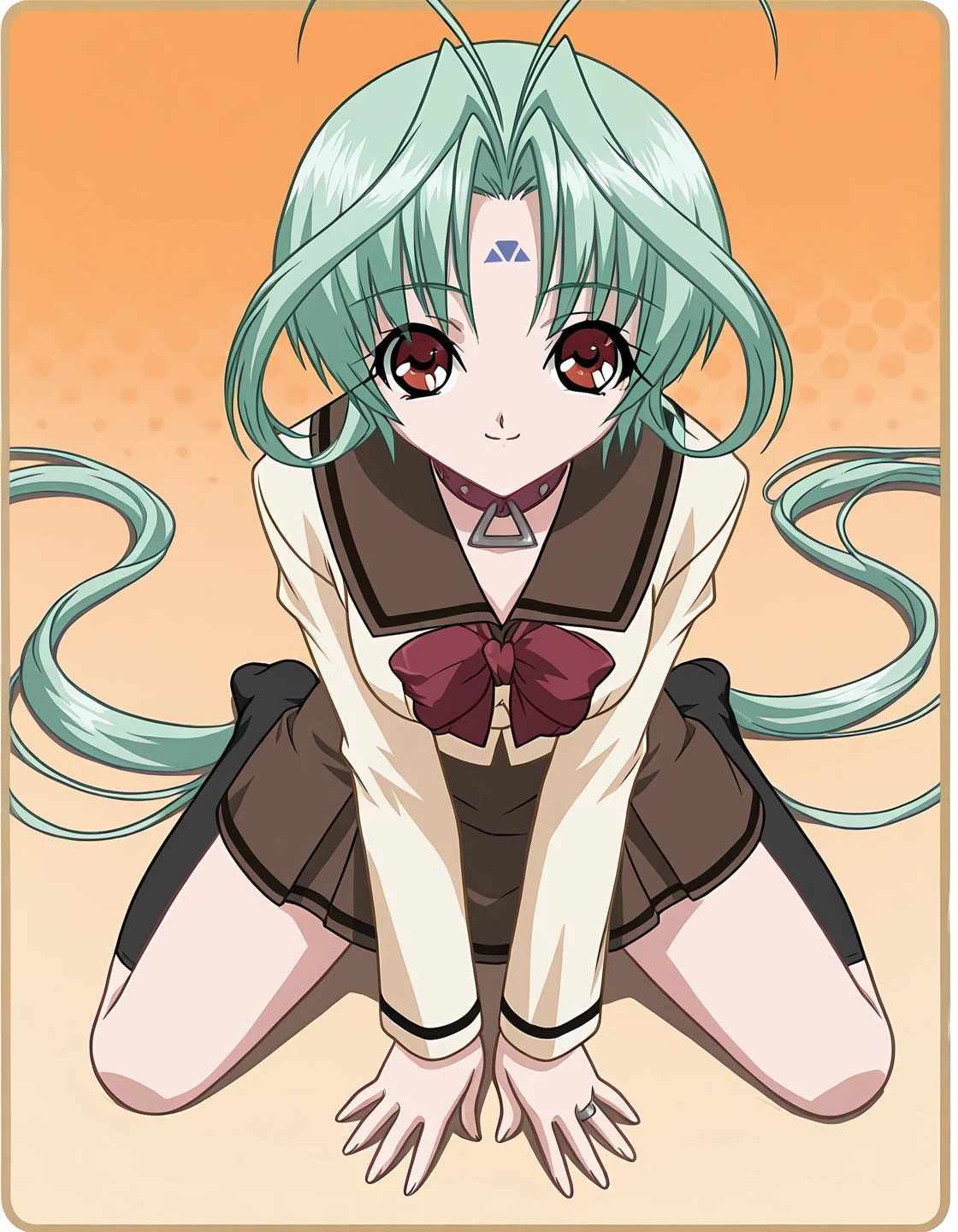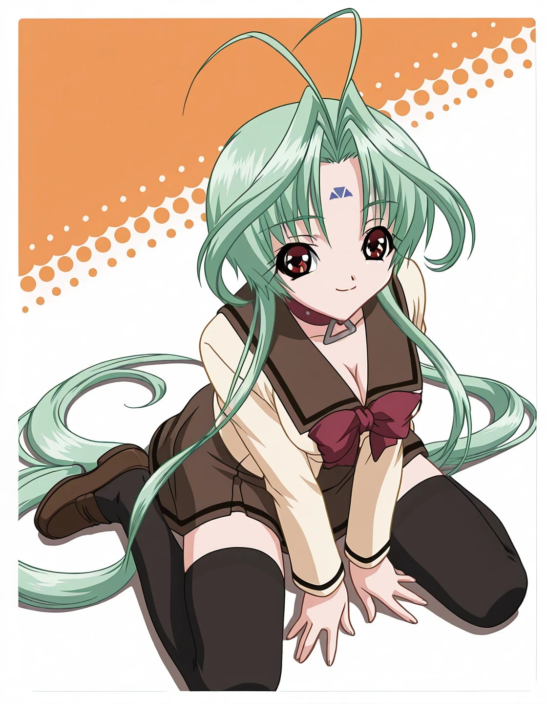 red leather choker with large triangular metal ring, cream sailor-style school uniform blouse with brown collar and trim, large red ribbon bow on the chest, brown pleated skirt, black thigh-high socks, brown loafers