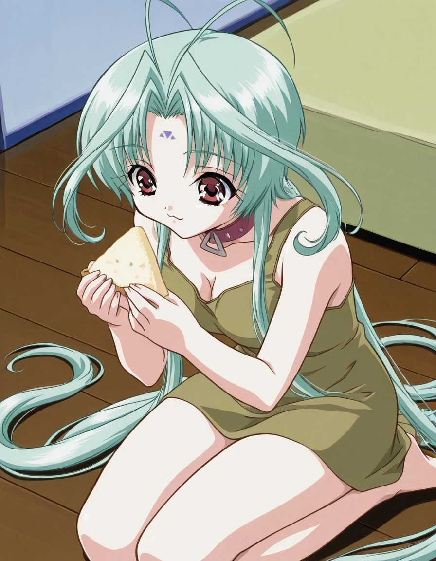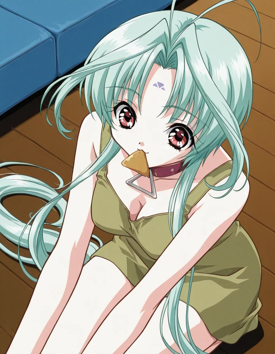 Ren is instantly recognizable by her very long mint-green hair with distinctive antenna-like strands that rise from the top of her head, bright red eyes, pale skin, and a soft, youthful appearance that reinforces her alien yet gentle presence. She almost always wears a red leather choker with a large triangular metal ring, a symbolic accessory shared among DearS that represents their bond and status. Her overall design blends futuristic alien aesthetics with everyday clothing, creating a contrast between her extraterrestrial origin and her life adapting to human society.