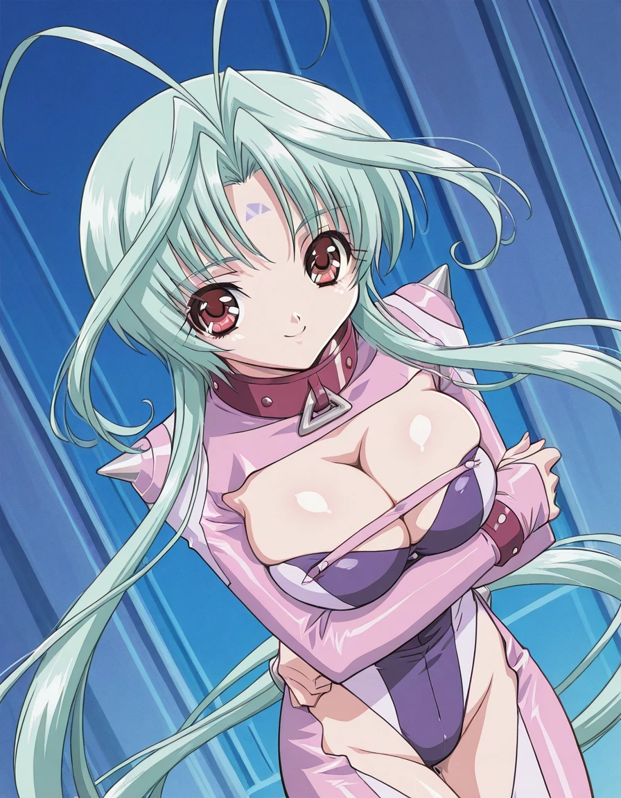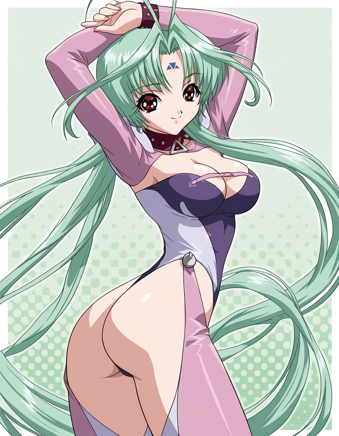 red leather choker with large triangular metal ring, tight glossy bodysuit with dark purple chest panel and white and pink sections, long pink sleeves with metallic studs on the shoulders, maroon leather wristbands, waist pads with metal spikes, high side slit revealing upper thigh, form-fitting futuristic design
