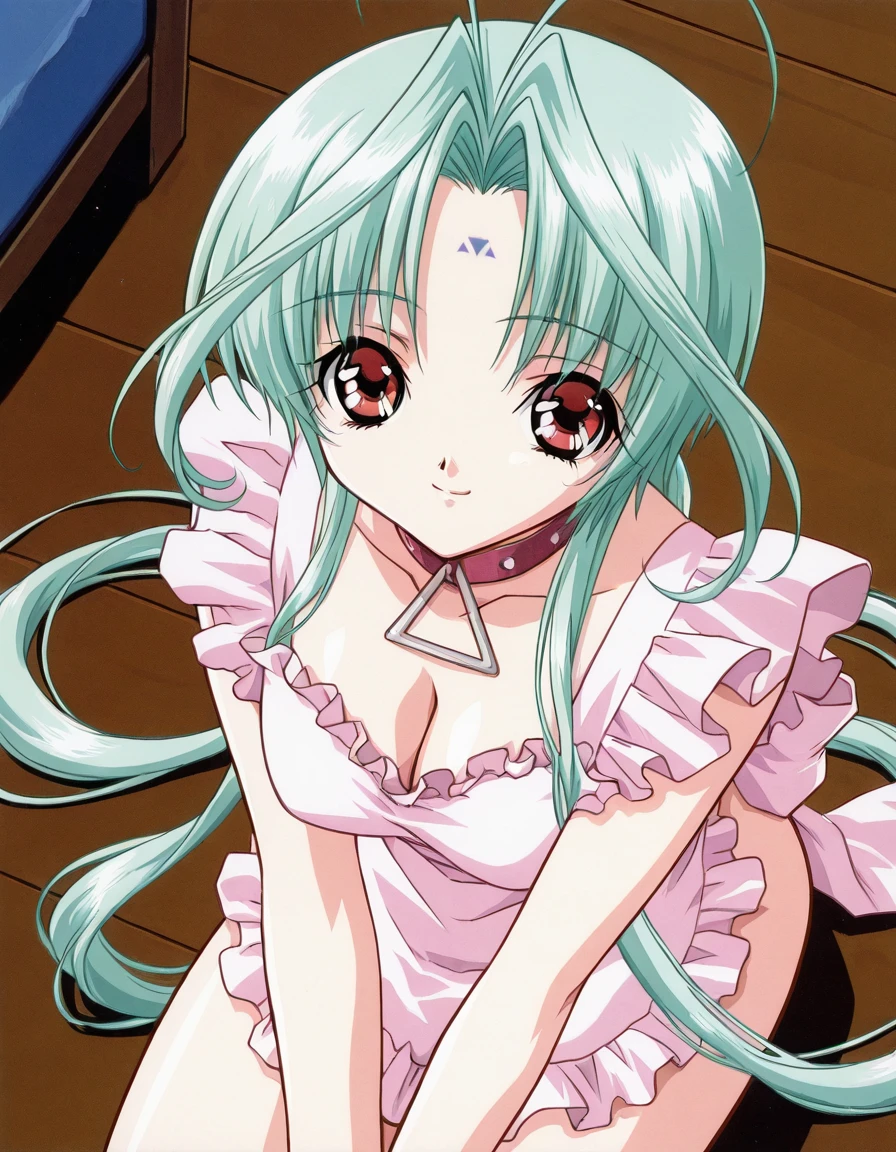 red leather choker with large triangular metal ring, sleeveless long light pink frilled apron with ruffled neckline and shoulder straps, soft loose fabric resting over the body, minimal accessories