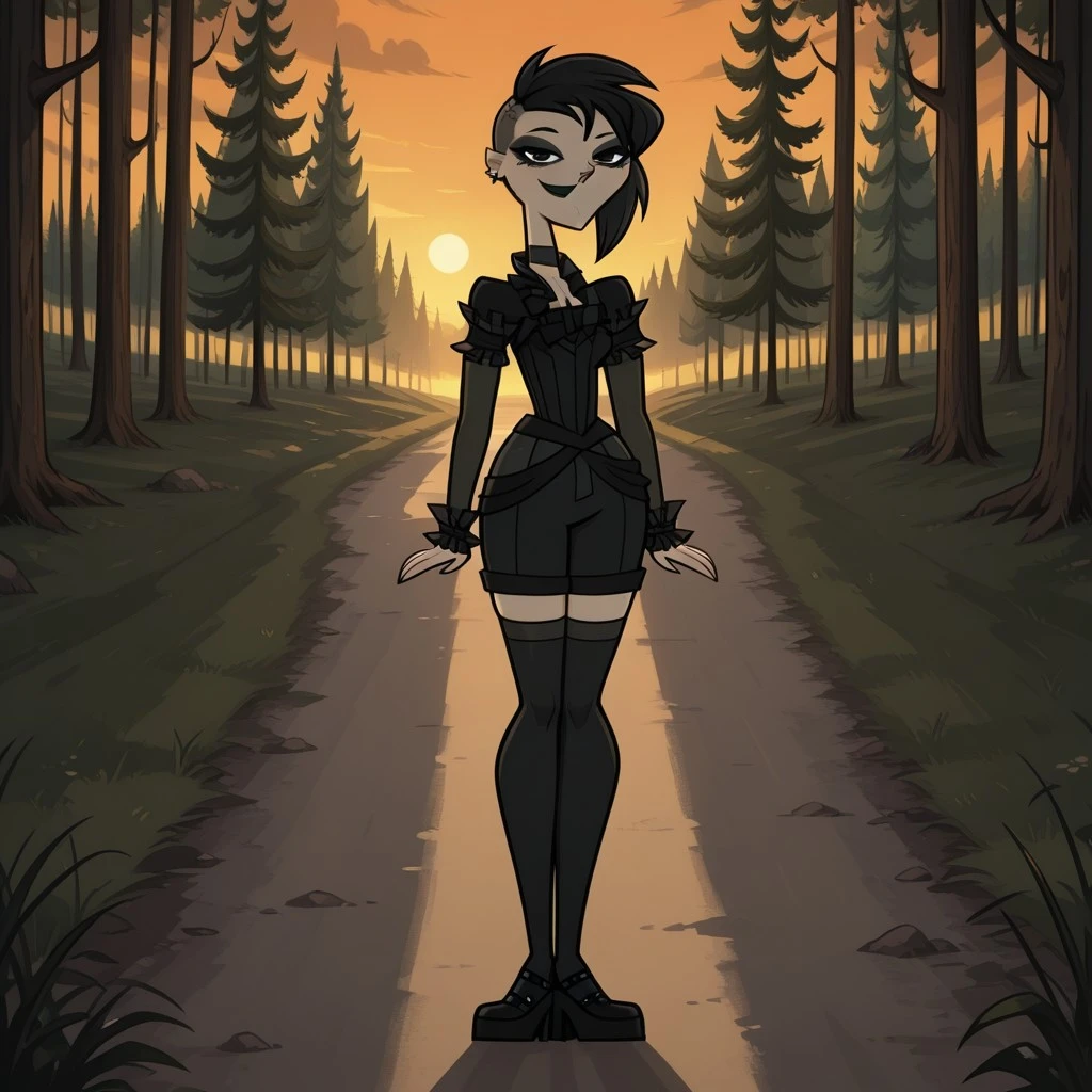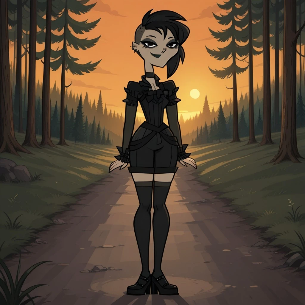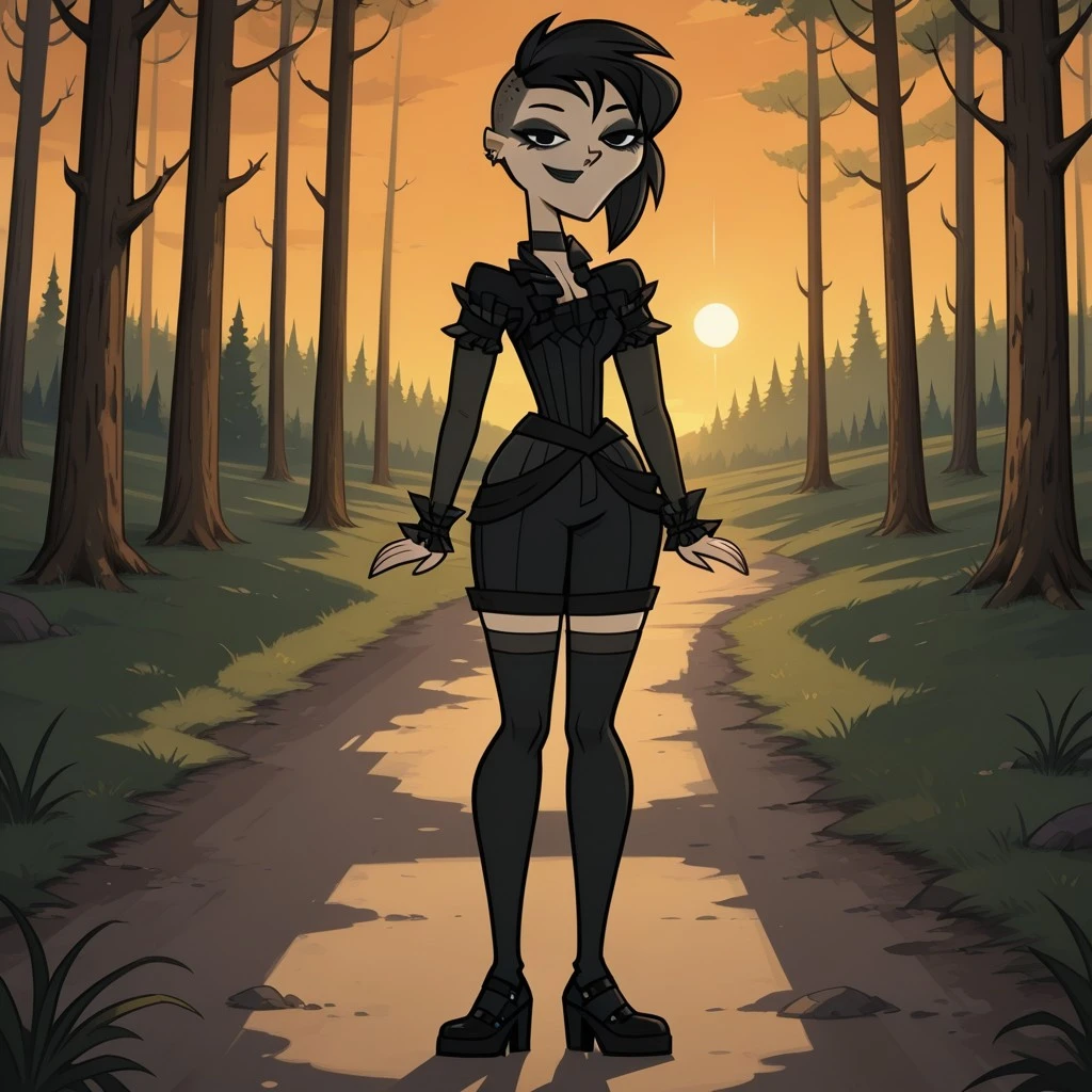 AnnikaDC, 1girl, black hair, black eyes, black eyeshadow, gothic makeup, black lips, lipstick, choker, black shirt with tassels on the neck and sleeves, black belt, black knee-high stockings, black heels