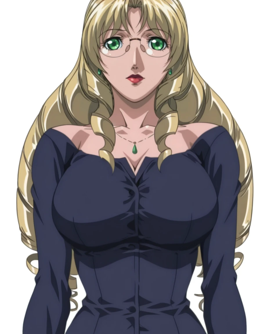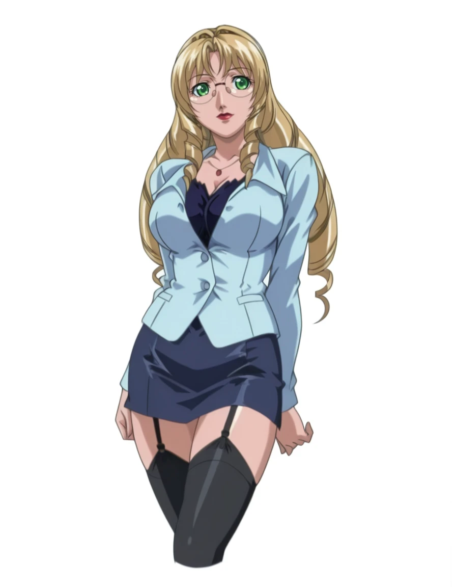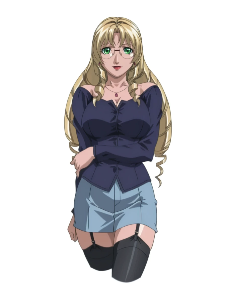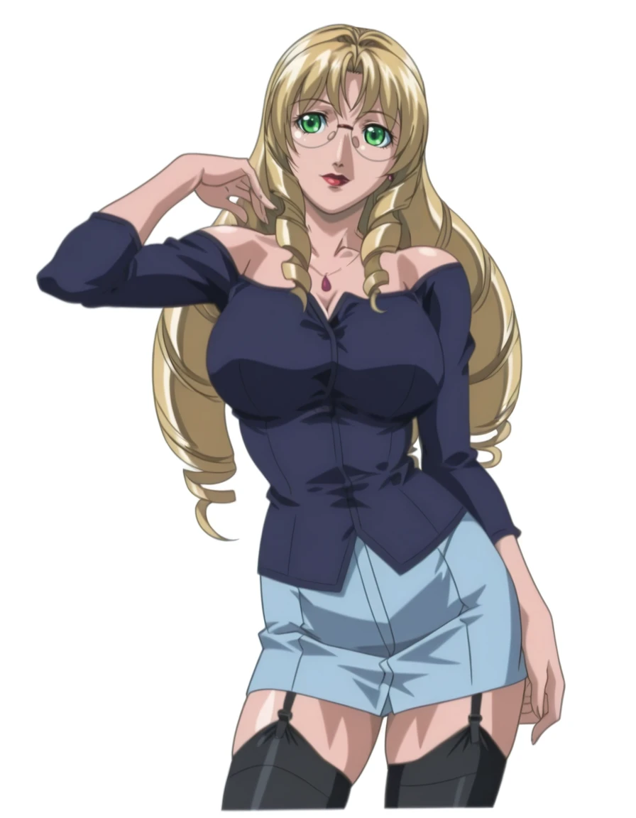 sh1r4k1r1k4, 1girl, long hair, drill hair, blonde hair, green eyes, glasses, earrings, lipstick, necklace, shirt, blue shirt, large breasts, pencil skirt, blue skirt, garter straps, thighhighs, black thighhighs