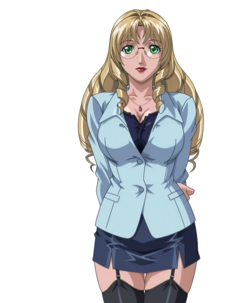 sh1r4k1r1k4, 1girl, long hair, drill hair, blonde hair, green eyes, glasses, earrings, lipstick, necklace, blazer, blue blazer, shirt, blue shirt, large breasts, pencil skirt, blue skirt, garter straps, thighhighs, black thighhighs