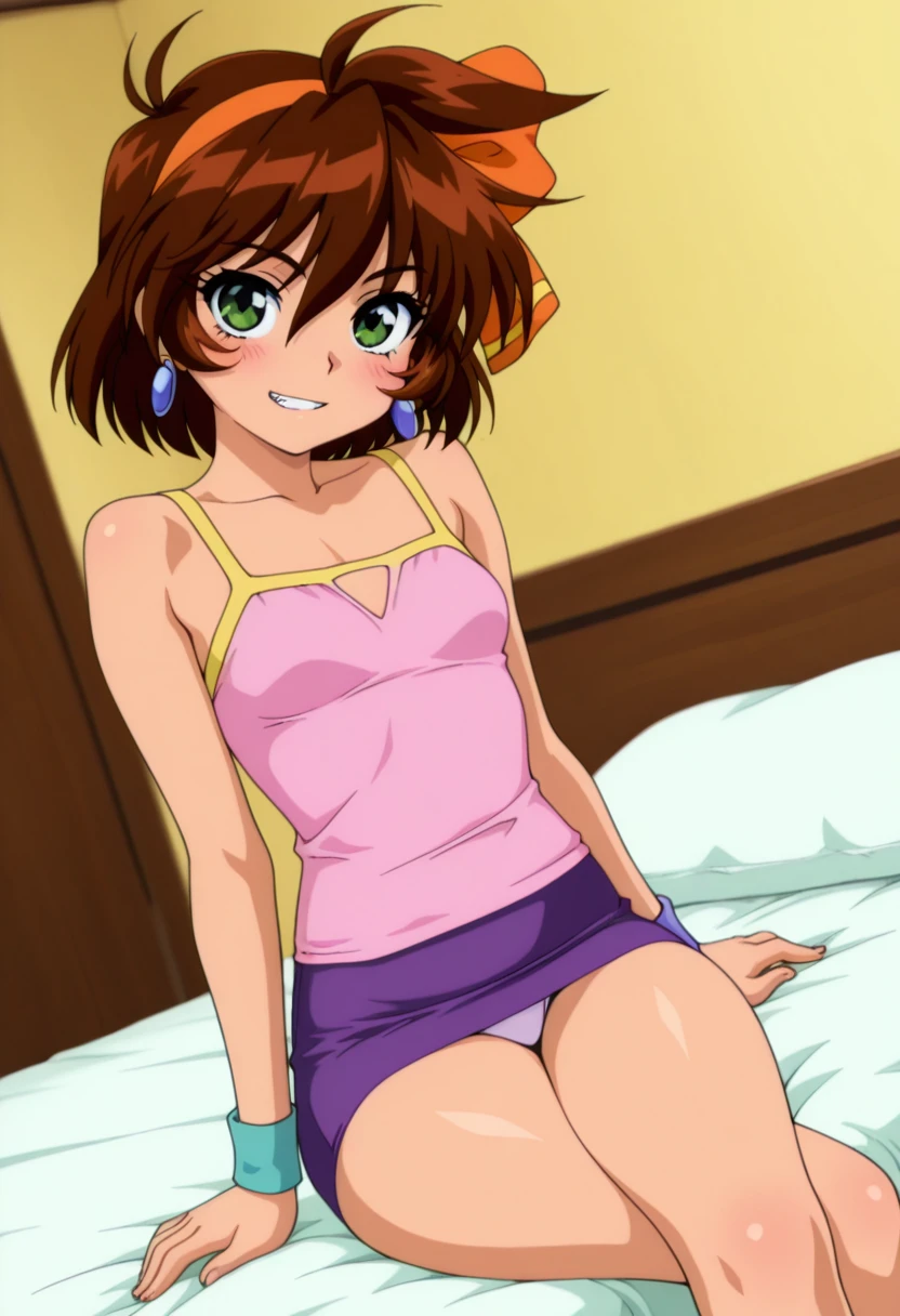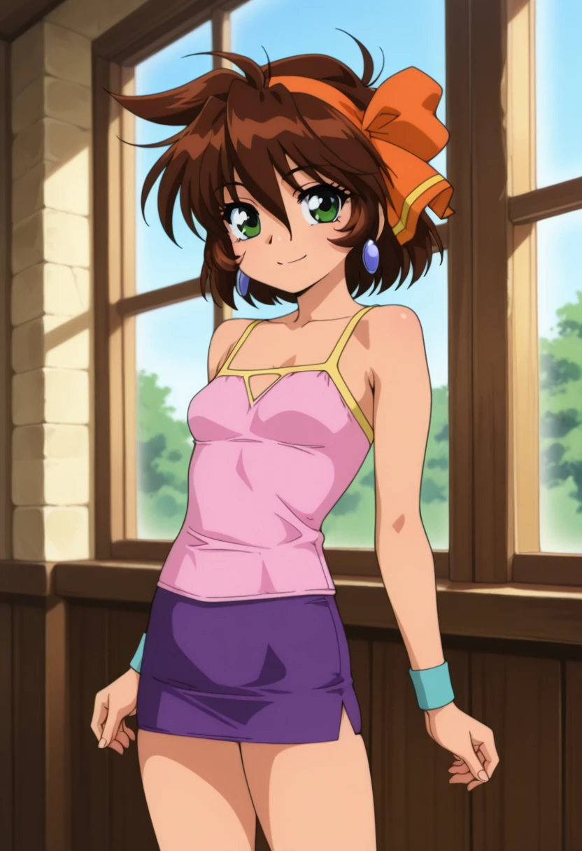 • pink camisole, bare shoulders, purple microskirt, aqua wristband,