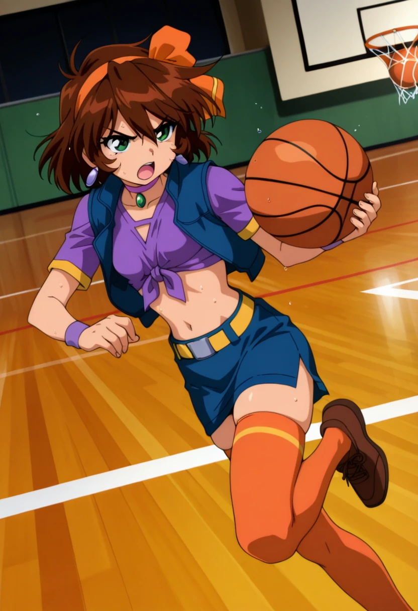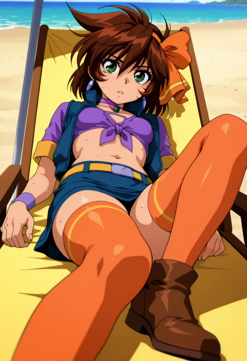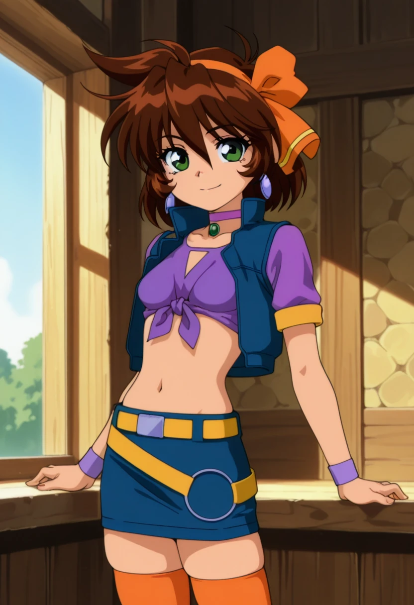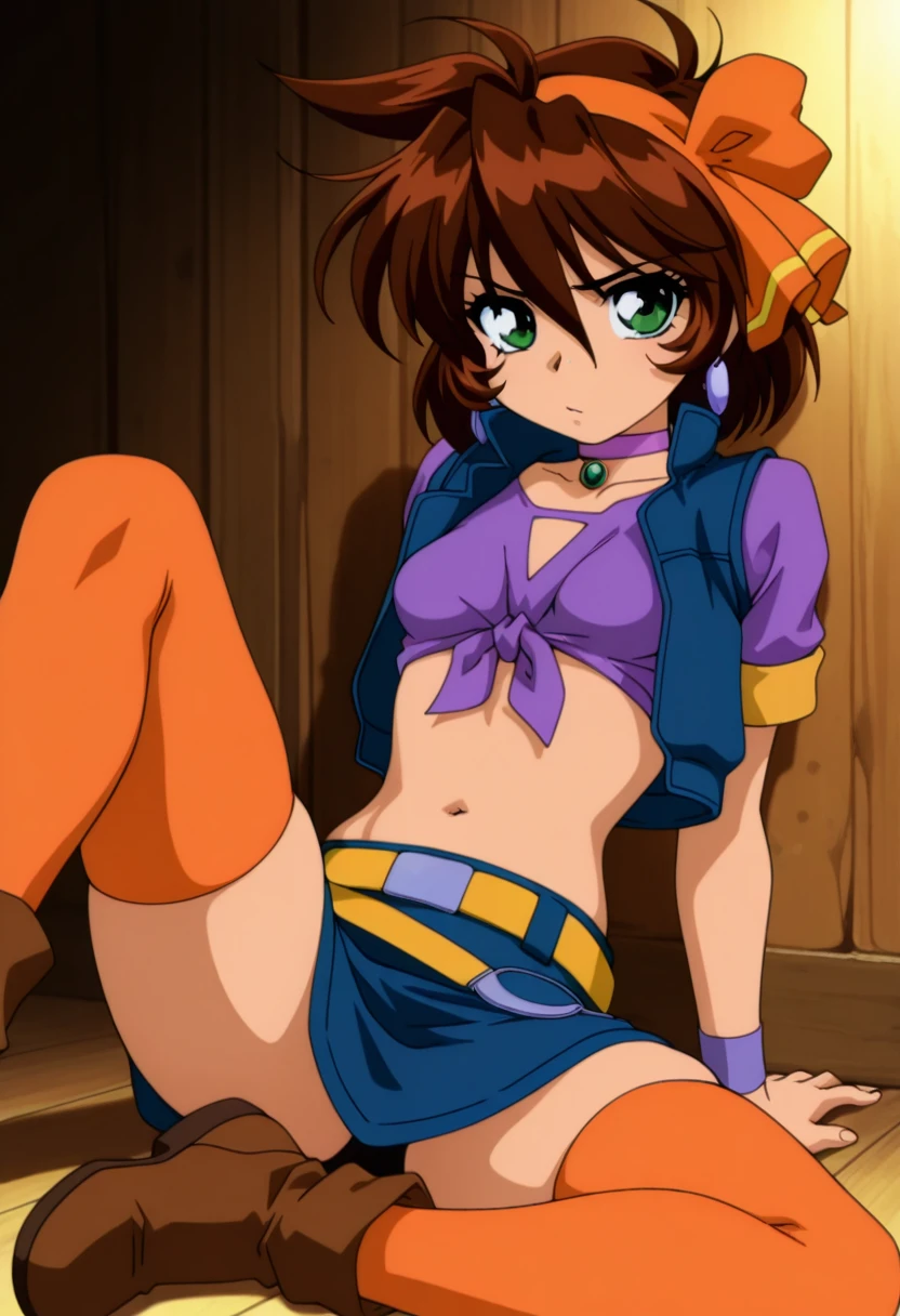 jewelry, purple choker, crop top, blue sleeveless vest, purple shirt, front-tie top, short sleeves, purple wristband, navel, midriff, yellow belt, blue miniskirt, zettai ryouiki, orange thighhighs, brown shoes,